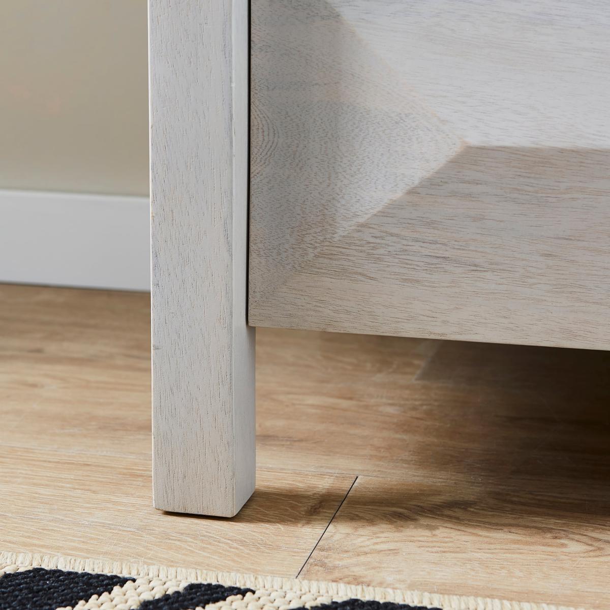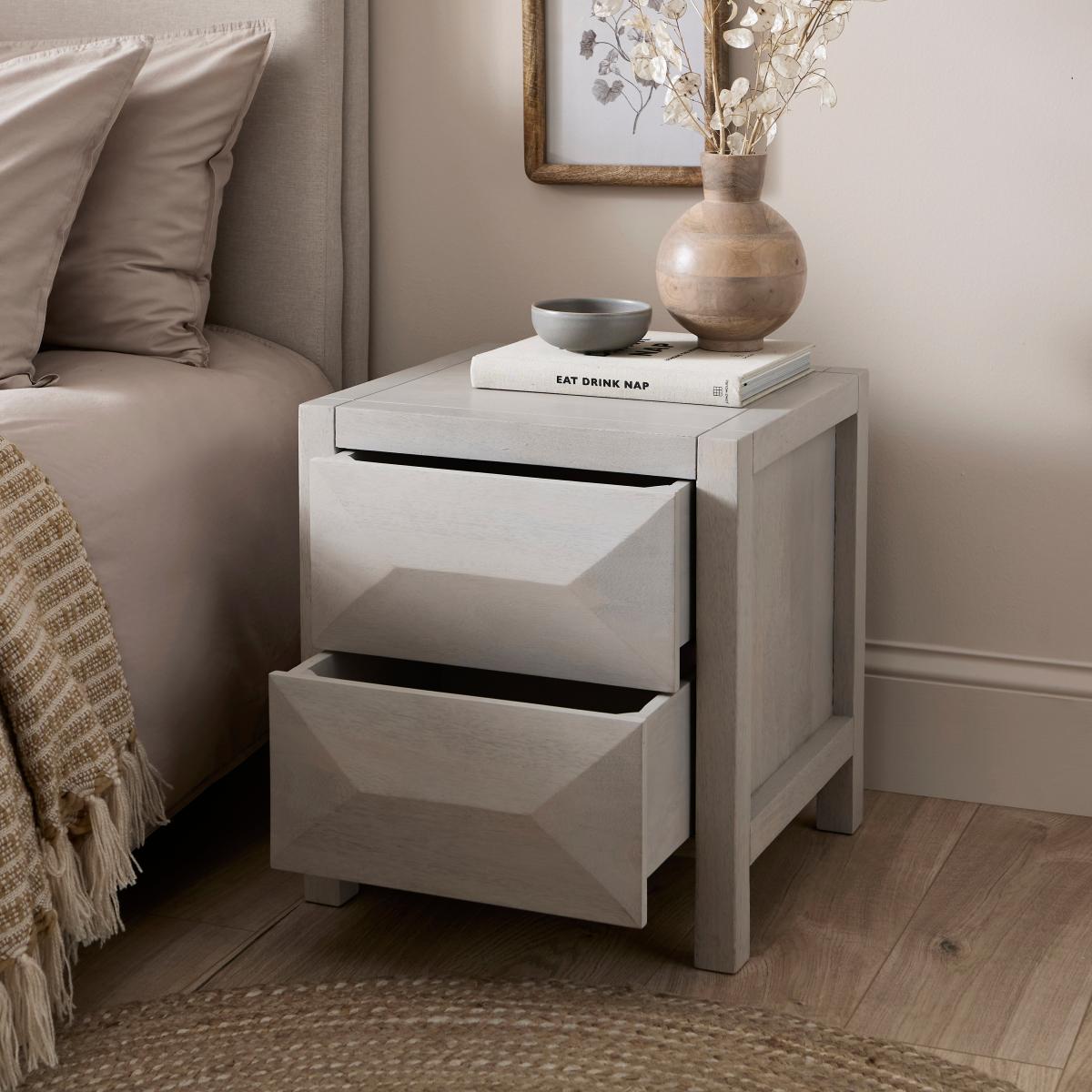 I’m a fan of this white-washed mango wood bedside for its blend of warmth and simplicity. The subtle grain shows through a pale finish that sits well in Scandi, coastal or contemporary country schemes, and the two drawers keep night-time clutter tucked away. Styling tip: keep the top surface clear except for a slim-profile lamp, a small pot plant and a neat stack of books. Pair it with linen bedding in soft neutrals, layer a woven rug at the foot of the bed and accent with brass or matte-black hardware elsewhere in the room to tie everything together.