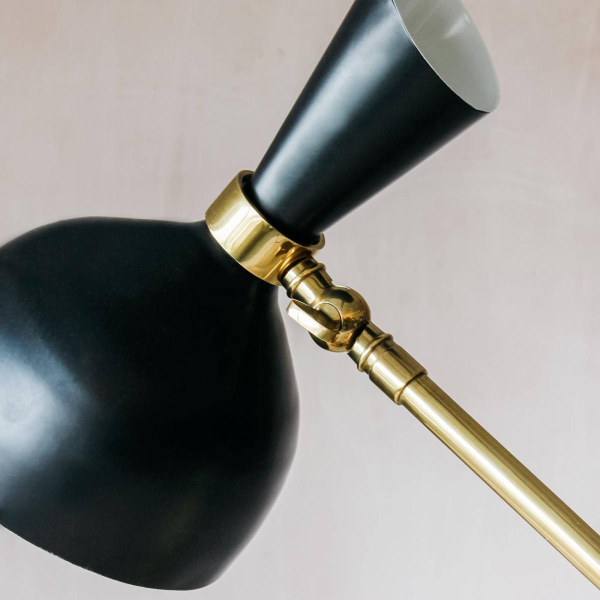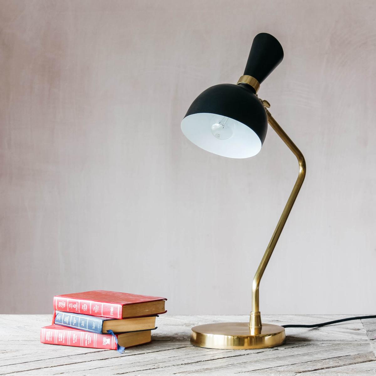 A sleek table lamp with a matte black conical shade and an angular brass stem, the perfect accessory for the midcentury home office.