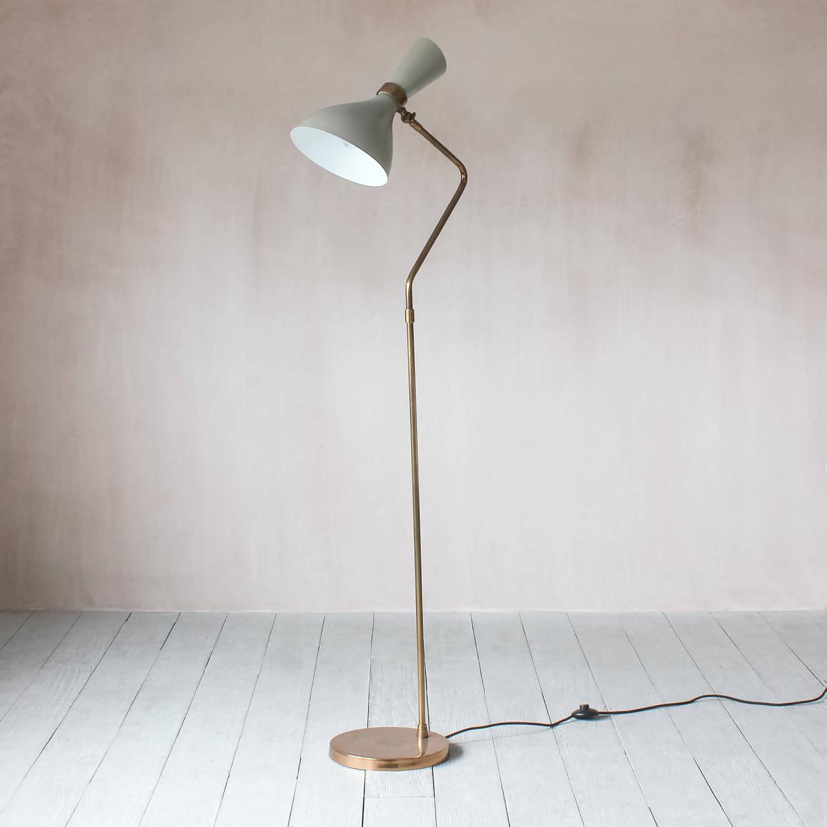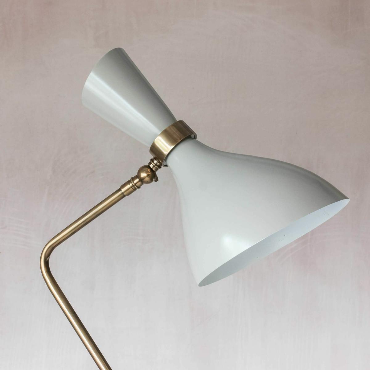 A tall and sleek lamp with a conical shade in a matte grey atop an angular brass stem and a black base, the perfect way to brighten up your midcentury home office.