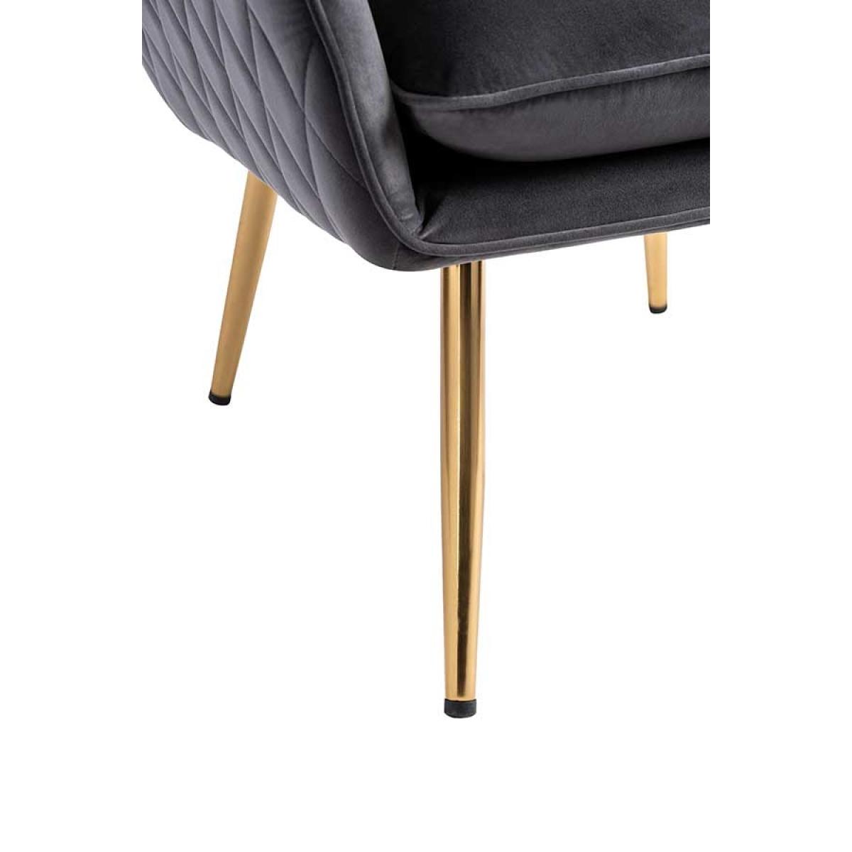 A comfortable, compact and visually unobtrusive lounge chair, ideal for smaller spaces and occasional use. Lumbar cushion included. Distinctive diamond quilting to the exterior. Velvet upholstery fabric. Deep foam padding. Steel legs with brushed brass finish and adjustable feet. Assembly required, simply attach the legs.