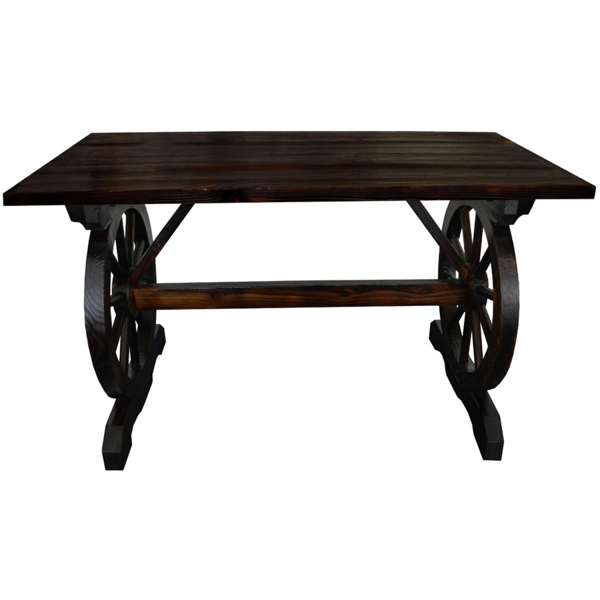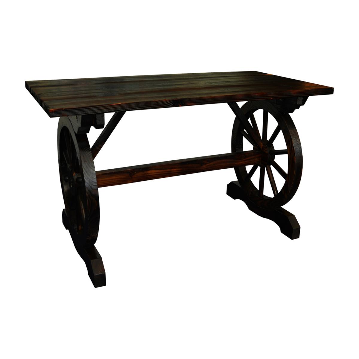 Fantastic solid wood garden table with authentically styled cartwheel side supports and roomy top. Ideal for outdoors or sunny patios. Top 120w x 61d cm. Width between cartwheel is 89cm. The product is finished with a varnish coating to protect the wood with a burntwood effect colour.