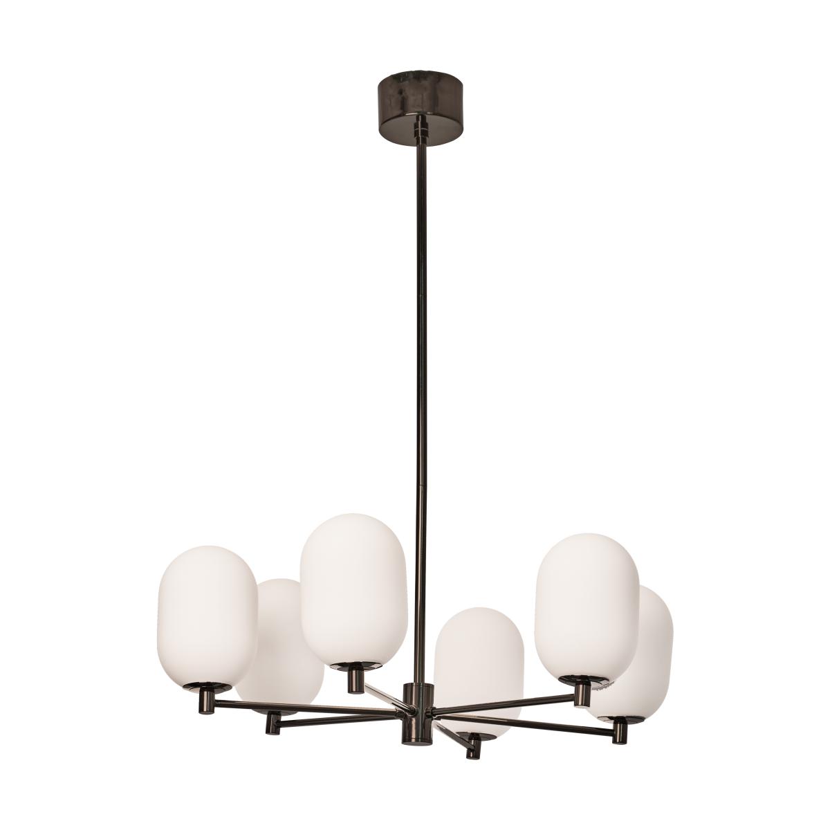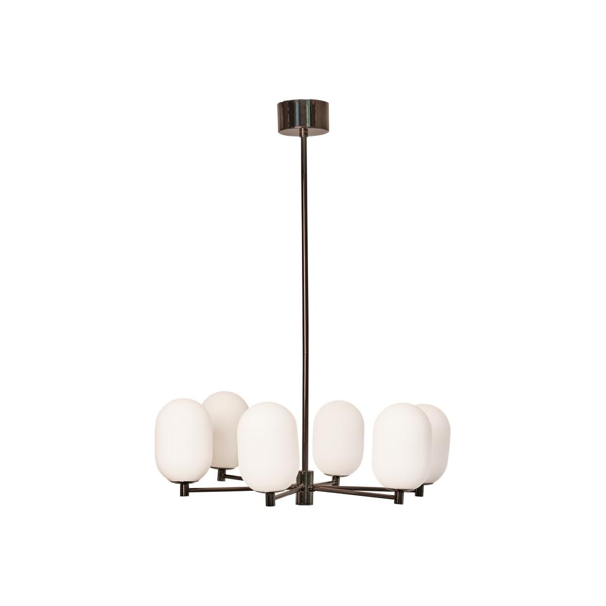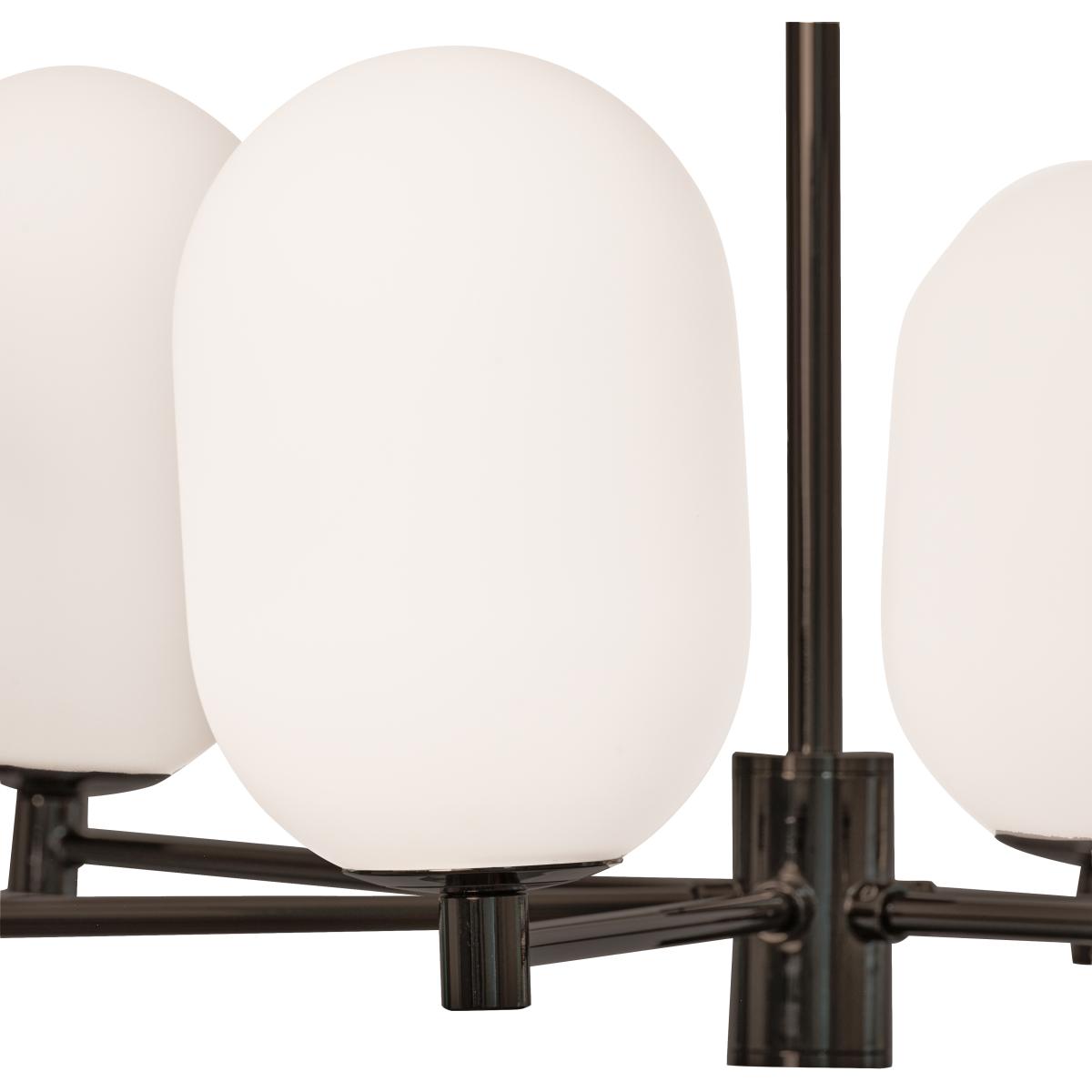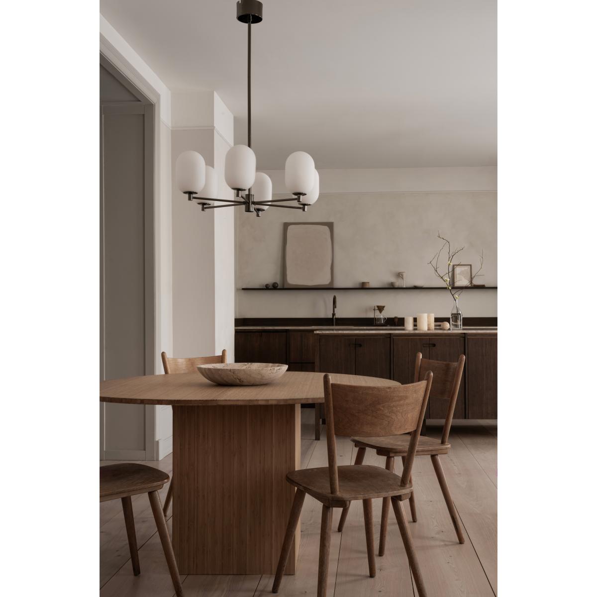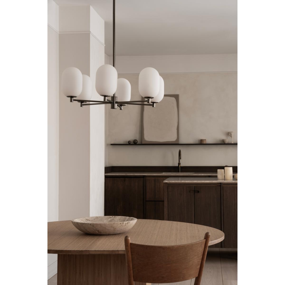Noor chandelier Ø65 cm from Watt&Veke is an elegant fixture that combines modern design with classic materials. It consists of six globes in white mouth-blown opal glass that diffuse a soft, pleasant light, perfect for creating an inviting atmosphere at home. The black chrome details provide a sleek contrast and enhance the chandelier’s character. With the adjustable three-part rod, the height can easily be adapted to the room’s ceiling height, making the lamp as practical as it is decorative. A matching ceiling cup for hook suspension is included for easy installation. Noor becomes a natural focal point above the dining table or in the living room and elevates the interior with its timeless expression.