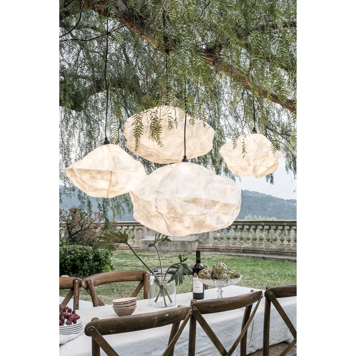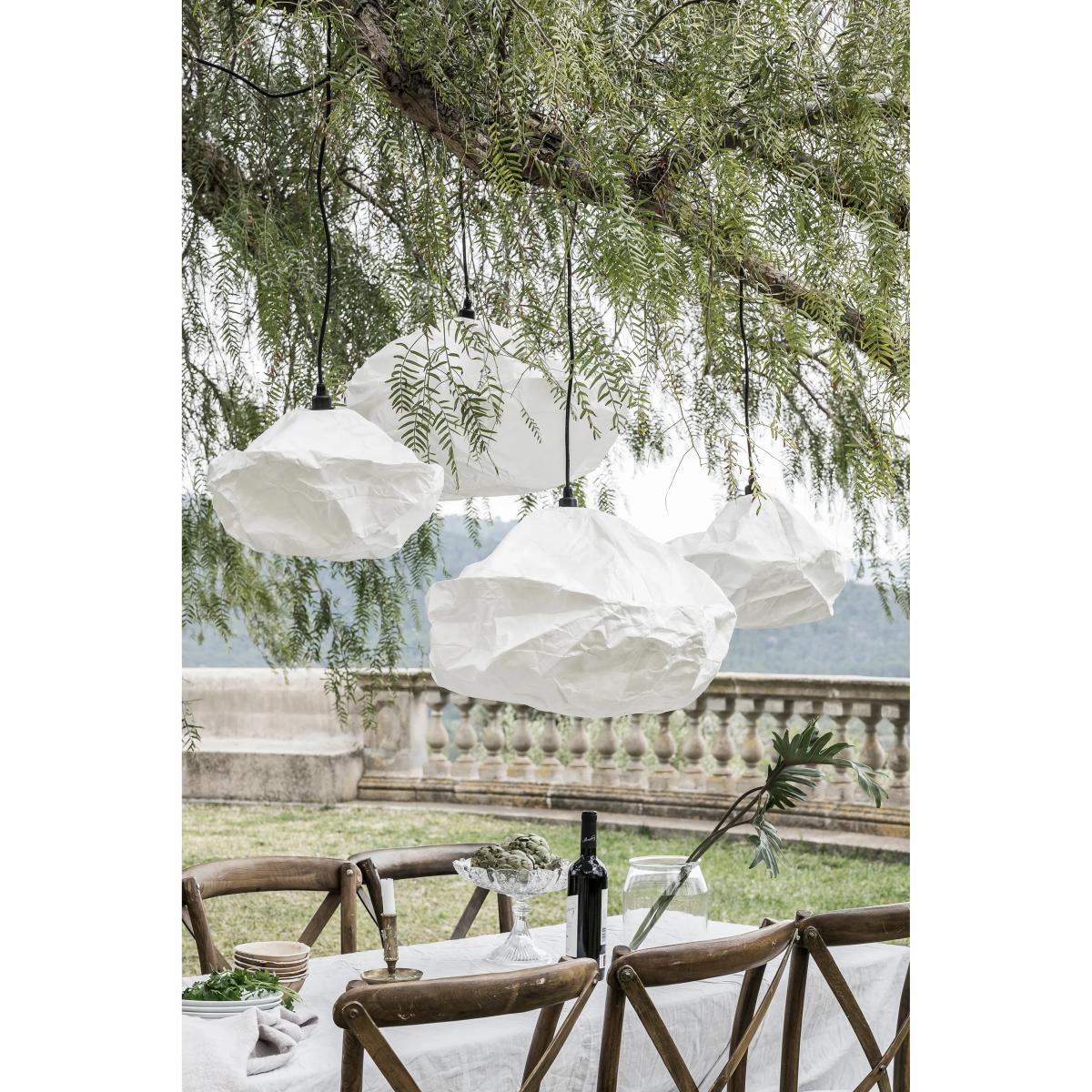 Sky lamp shade Ø58 cm from Watt & Veke is an airy pendant shade that transforms the patio or living room into a dreamy oasis. The shade is made from a synthetic paper-like material that is water-repellent, durable, and recyclable—perfect for all the season’s dinners and summer evenings. The generous 58 cm diameter casts a soft, atmospheric glow and becomes a focal point over the table. For outdoor use, pair it with a black outdoor cable. For indoor use, complete it with a ceiling suspension. Sky Pendant ties the room together with ease and creates a harmonious whole.