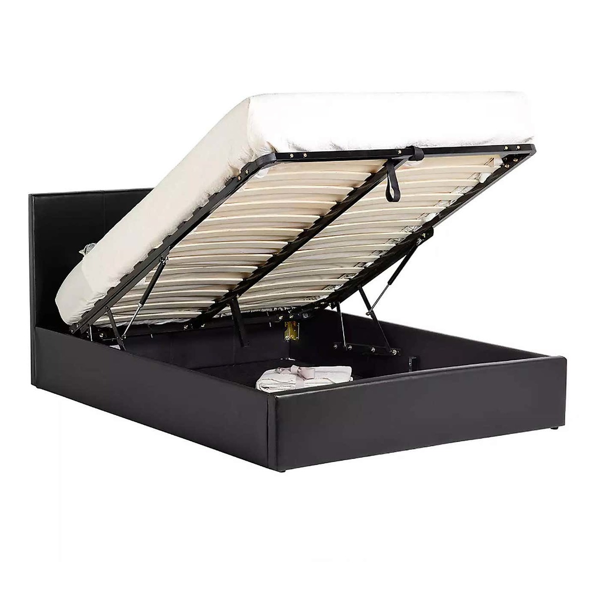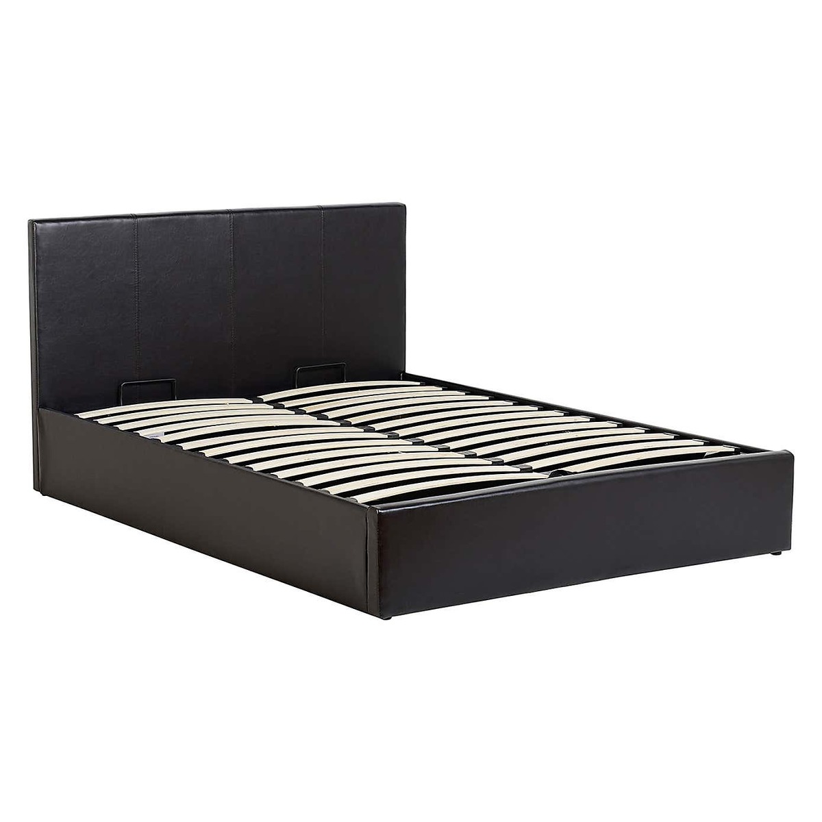 A faux Black leather storage bed frame with an ottoman lift slatted base. Combining practicality and minimal design, the Waverley Faux Leather Storage Bed Frame will provide you with a large amount of bedroom storage space whilst also offering a comfortable and supportive sleeping environment. The sprung slatted base integrated into the bed’s design offers a more natural platform to sleep on and opens up to an easy access storage area to give you a great place to keep your bedroom essentials. What is more, the large headboard gives you a brilliant means of resting in the comfort of your own bed when not sleeping. Please note, unfortunately we cannot deliver this item to the Channel Islands.