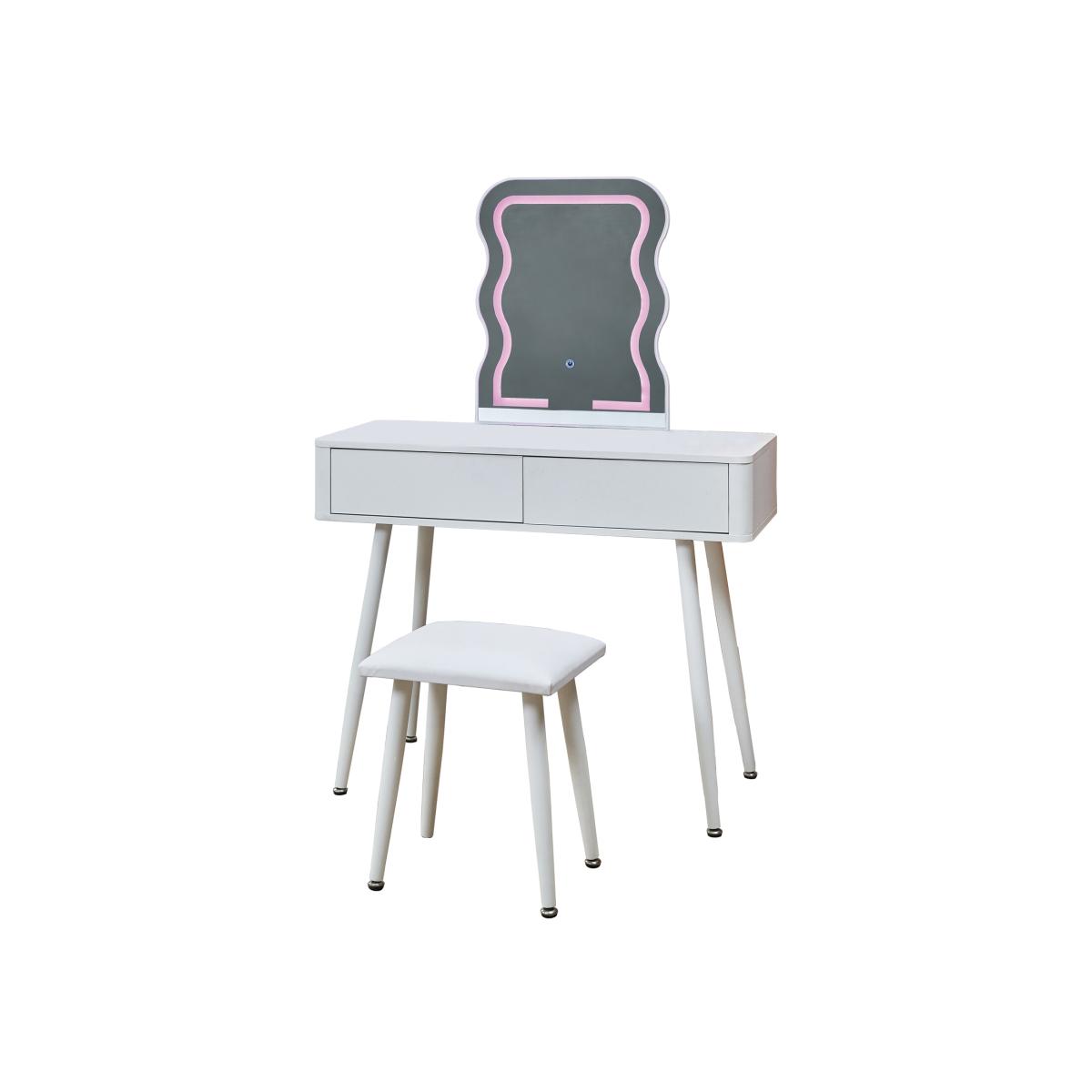 Enhance your bedroom's allure with the Wavey LED Dressing Table and Stool. This dressing table flaunts a minimalist design in white that coordinates beautifully with modern homes. Designed with a spacious top and two drawers, it offers ample space for storing all your beauty essentials neatly. The stool features a matching design to complement the table perfectly, while its soft, padded seat ensures you stay comfortable.