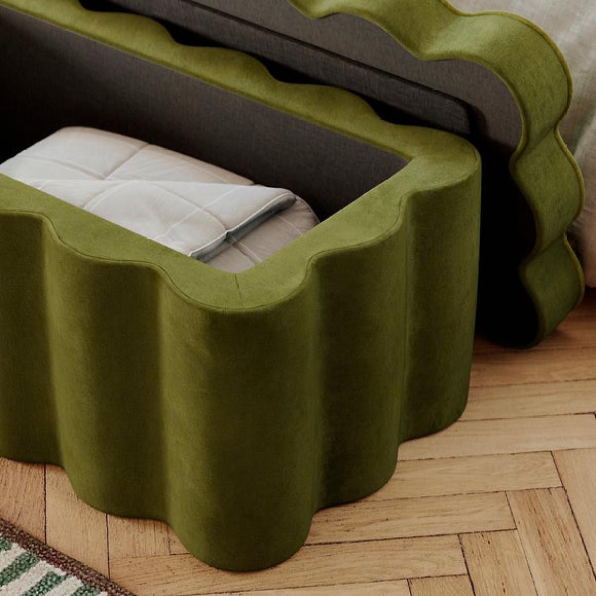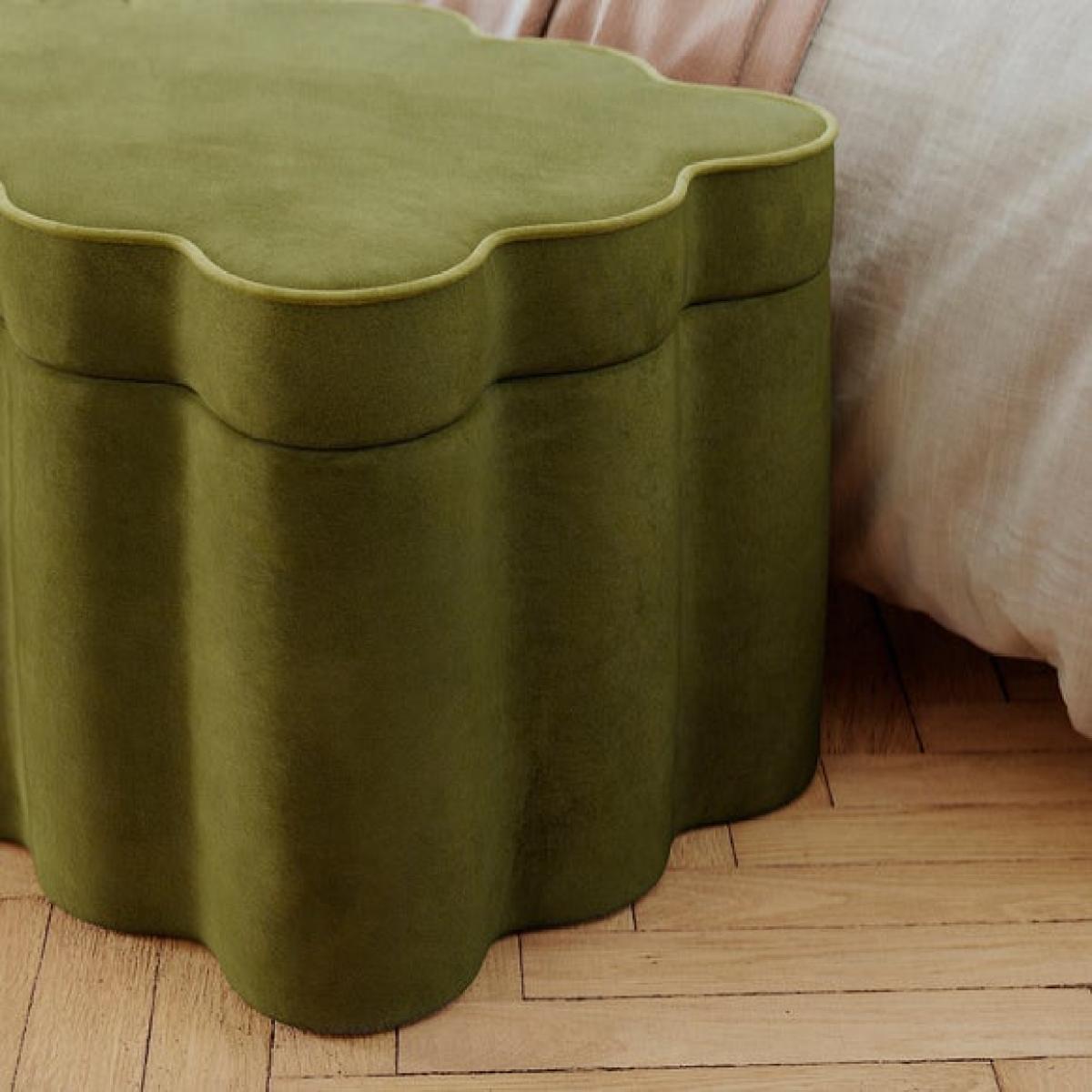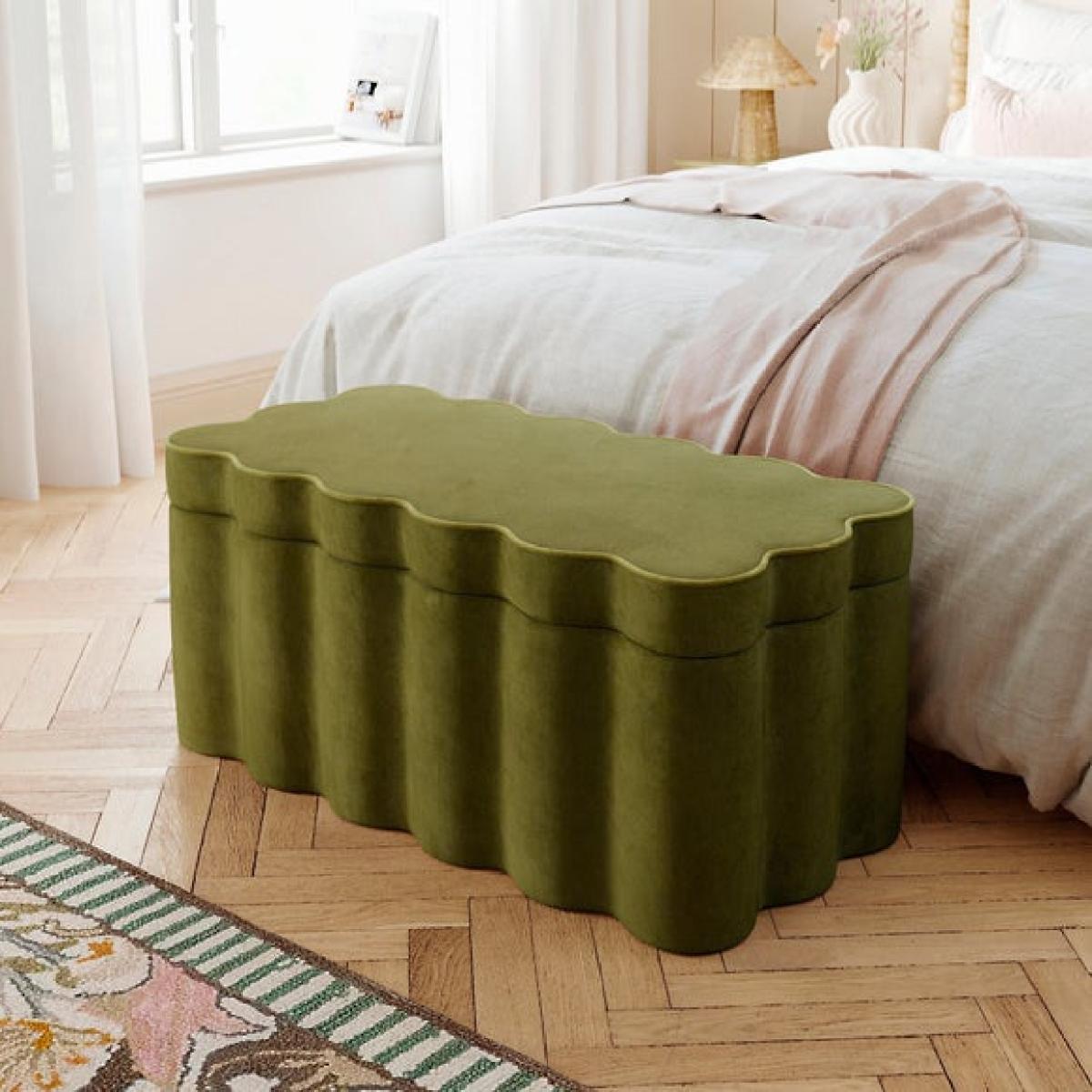 * Bold scalloped silhouette * Luxurious velvet upholstery * Rich olive green colour * Spacious hidden storage The Wavie Olive Green Velvet Storage Ottoman is where elegance perfectly meets function. Its strong scalloped shape creates a standout feature, while the plush velvet finish adds a touch of luxury. Lift the lid to reveal generous storage space, ideal for keeping your home neat and organised. The deep olive tone brings warmth and sophistication, making this piece a versatile addition to modern or classic interiors.