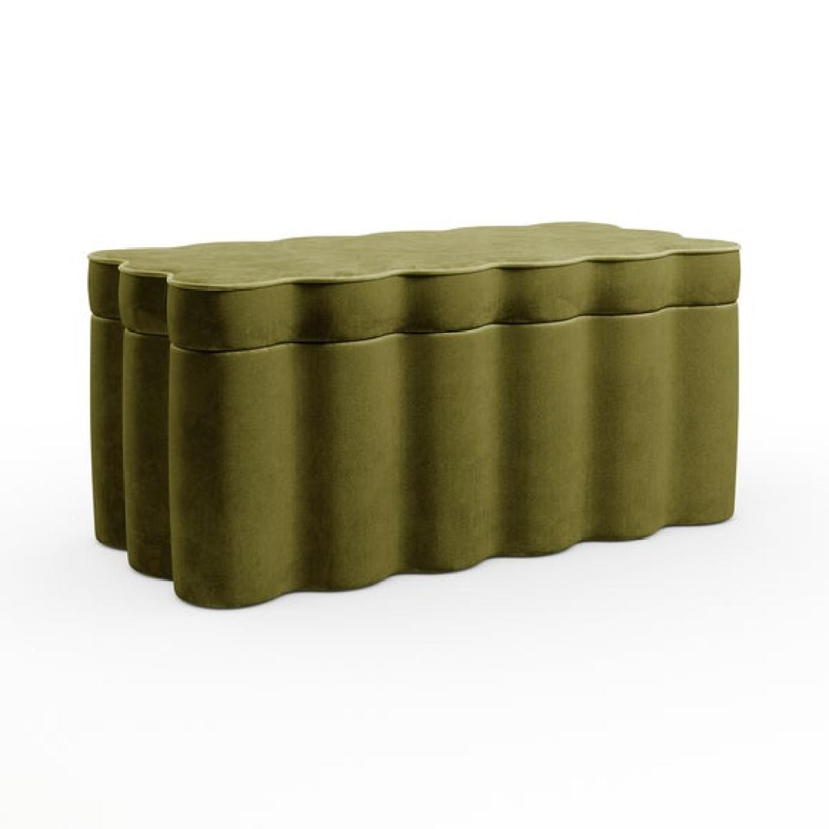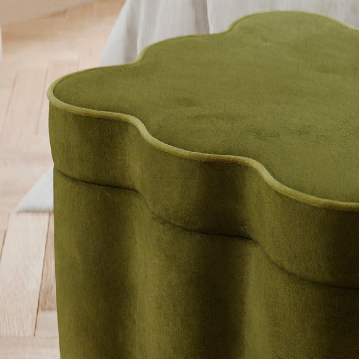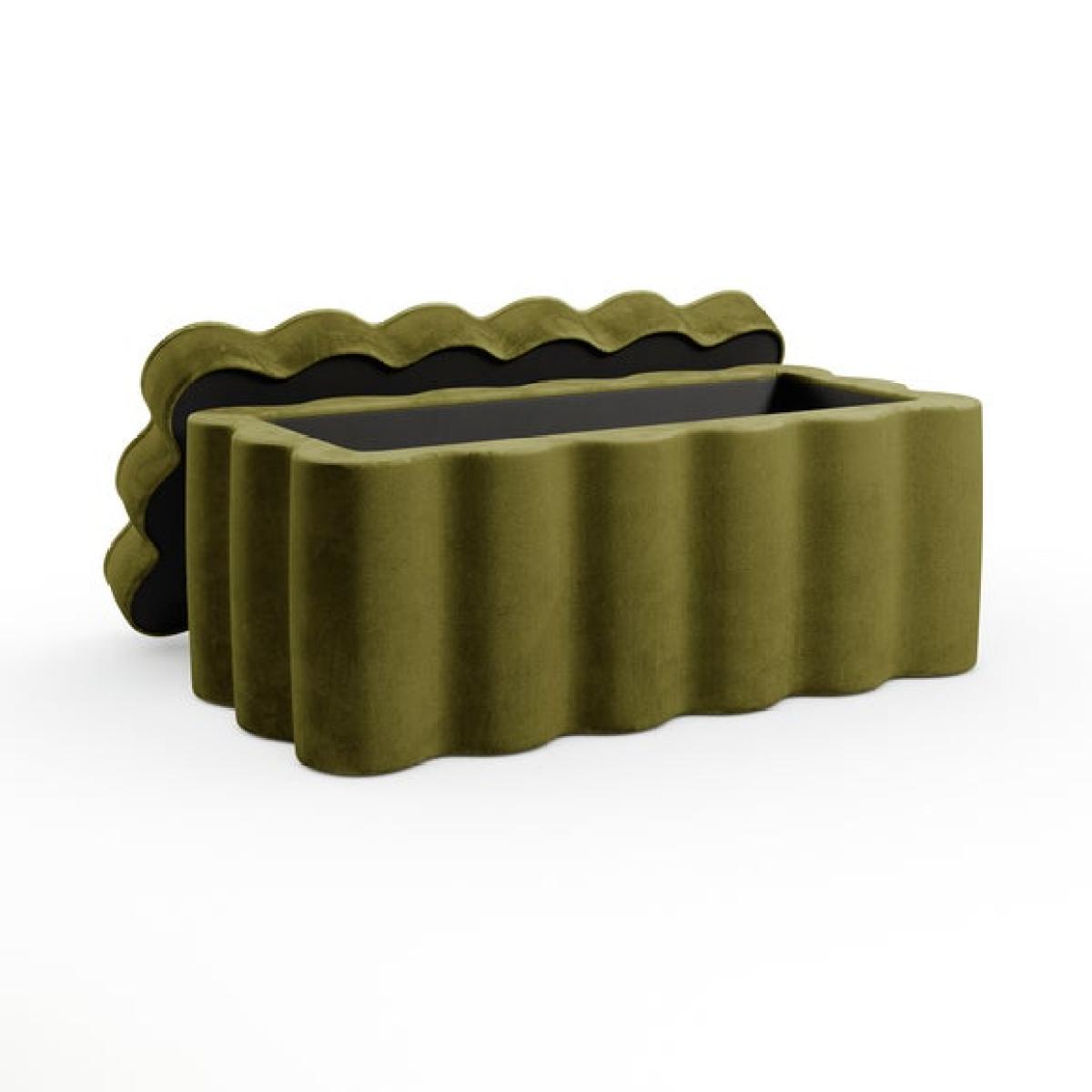 * Bold scalloped silhouette * Luxurious velvet upholstery * Rich olive green colour * Spacious hidden storage The Wavie Olive Green Velvet Storage Ottoman is where elegance perfectly meets function. Its strong scalloped shape creates a standout feature, while the plush velvet finish adds a touch of luxury. Lift the lid to reveal generous storage space, ideal for keeping your home neat and organised. The deep olive tone brings warmth and sophistication, making this piece a versatile addition to modern or classic interiors.