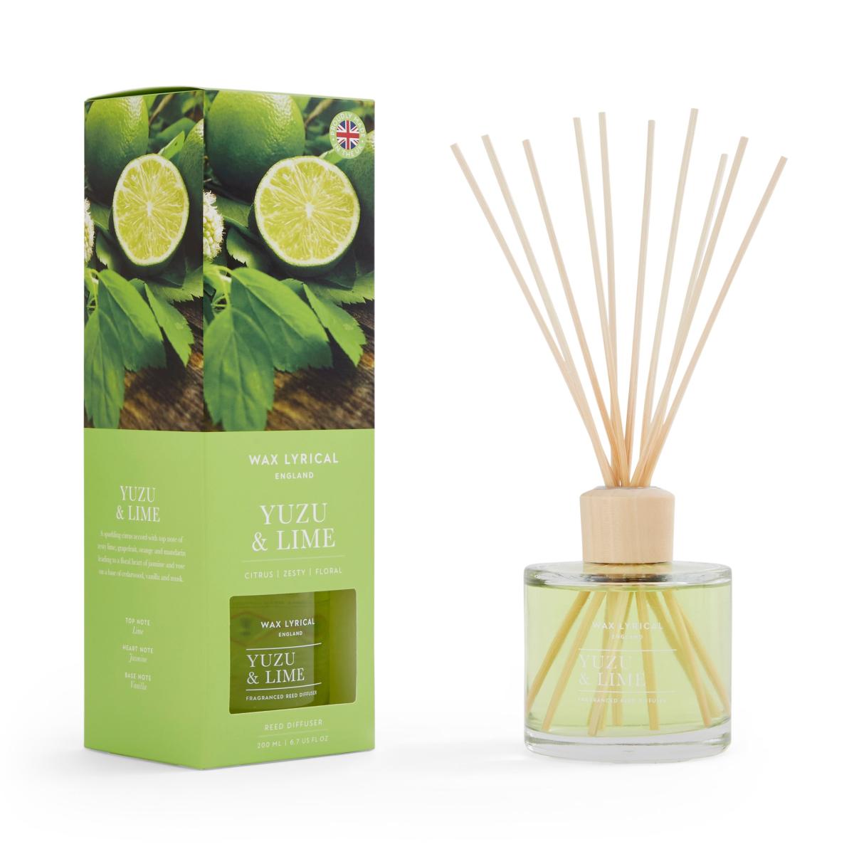 * Made from 100% wax * Includes 1 pack of wax melts * For indoor use * Woody/citrus scent Breathe in a burst of summer citrus with this Yuzu and Lime Reed Diffuser from Wax Lyrical England. Pop the natural reeds into the filled diffuser for an explosion of zesty lime, grapefruit, orange and mandarin.