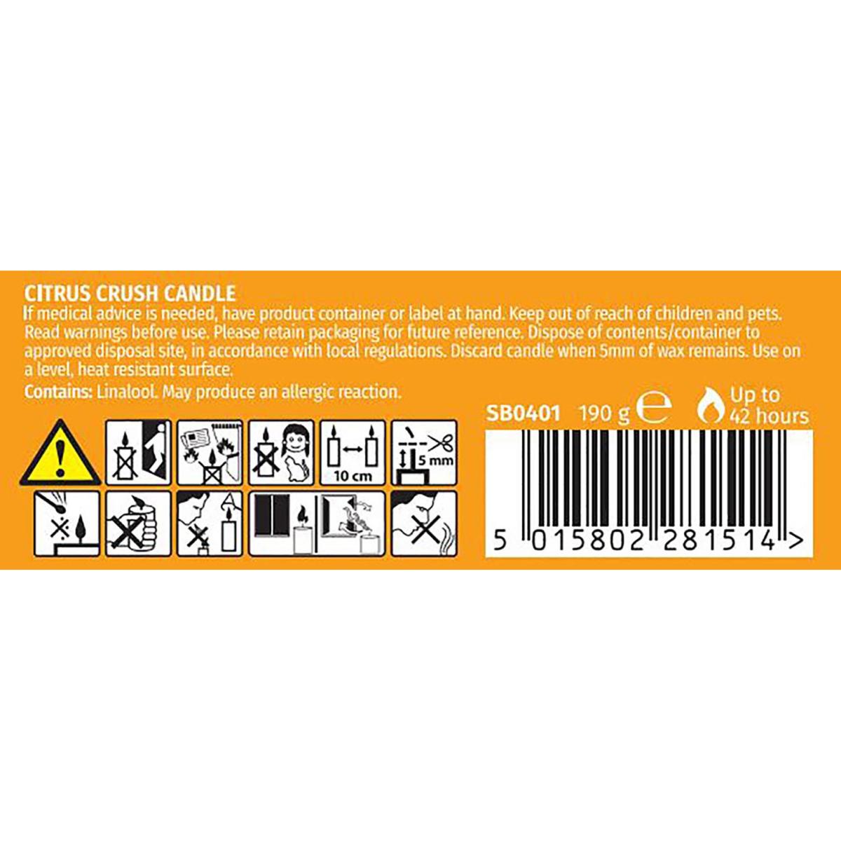 Boxed candle with a burn time of up to 42 hours A refreshing blend of sweet mandarin, lime and uplifting basil layered with hints of fresh lemongrass and spearmint resting on a cool base of moss and vetivert. Made in England. Citrus Crush scent. Paraffin wax. Approximate burn time 42 hours. Size H9.5, W8.2, D8.2cm. Diameter 8.2cm.