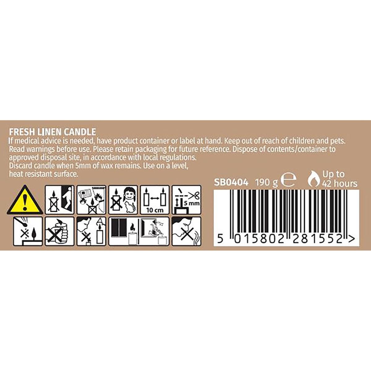 Boxed candle with a burn time of up to 42 hours Sparkling top notes of citrus and green; a hint of clean aldehydic freshness and violet leaf; pine needles and a suggestion of apple peel; fresh florals such as white lily and lilac with rose, jasmin and iris, a background of amberwood, cedar, tonka and musk with a note of crisp spice. Made in England. Fresh Linen scent. Paraffin wax. Approximate burn time 42 hours. Size H9.5, W8.2, D8.2cm. Diameter 8.2cm.