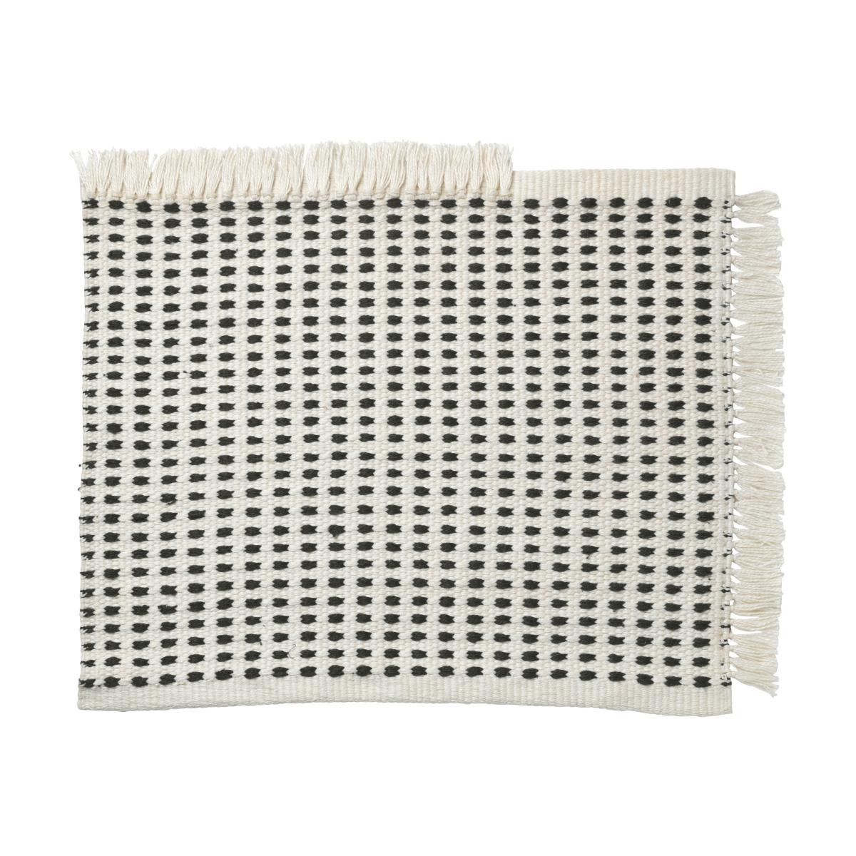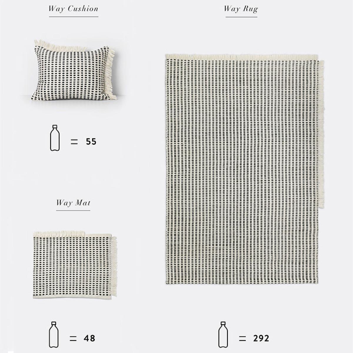 Way Outdoor mat 50x70 cm is a smaller sized mat from Ferm Living made from an environmentally friendly woven polyester material manufactured from recycled plastic bottles. The material is durable, making the mat perfect for outdoor use, for example for the patio or balcony. It would also do well as a doormat outside or inside the front door. The asymmetrically placed frays give a playful twist to the otherwise clean design, with something of a marine feel to it.