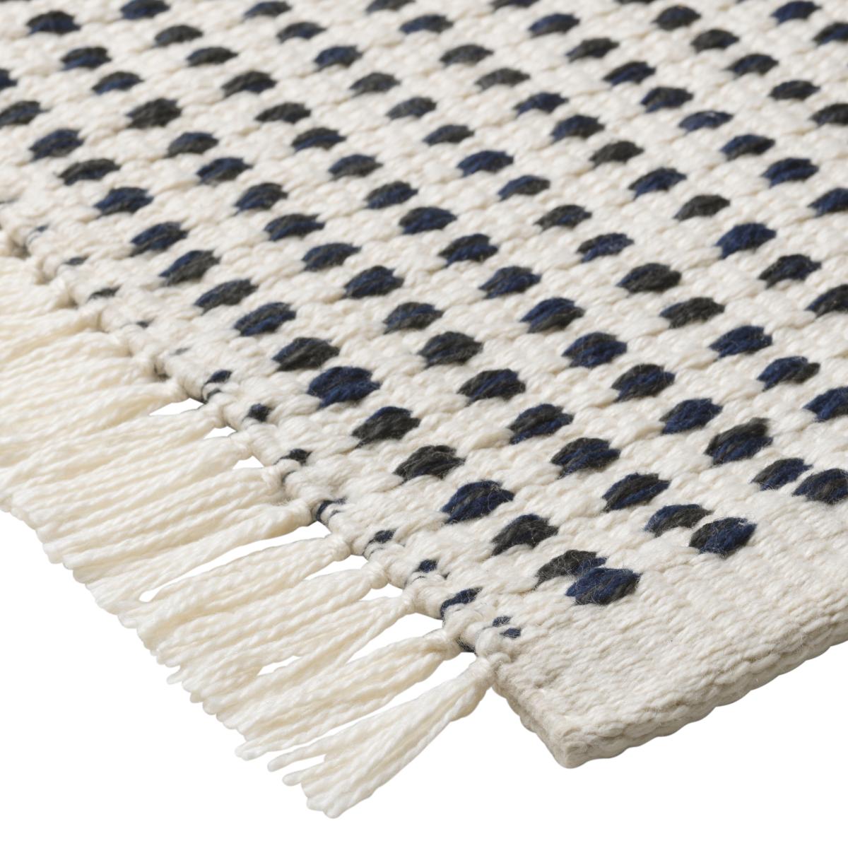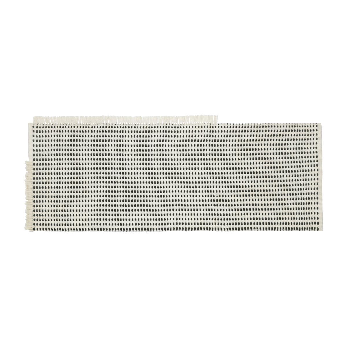 The Way Outdoor rug 70x180 cm from Ferm Living is made from recycled plastic bottles, just like the rest of the Way series. The sustainable materials used throughout the entire collection gives it a unique stylized look that is elegant and environmentally friendly. The woven recycled polyester material has a gracefully rustic texture that pairs well with the black-and-blue pattern set against a white base. A gentle decorative fringe runs along the carpet to give it a distinct and exciting look.
