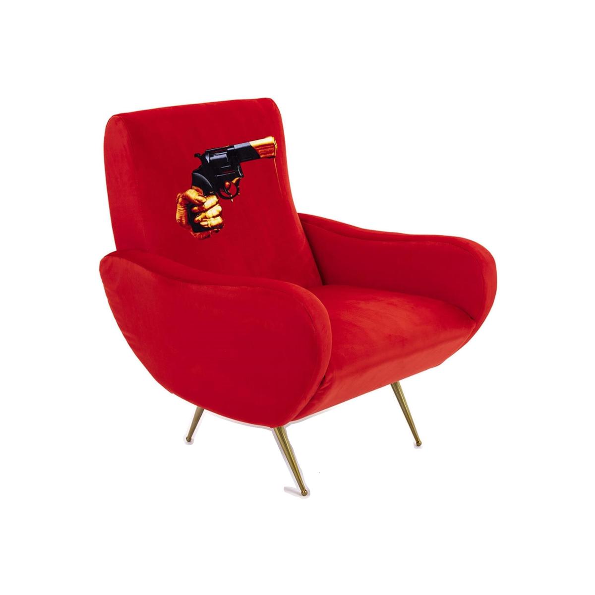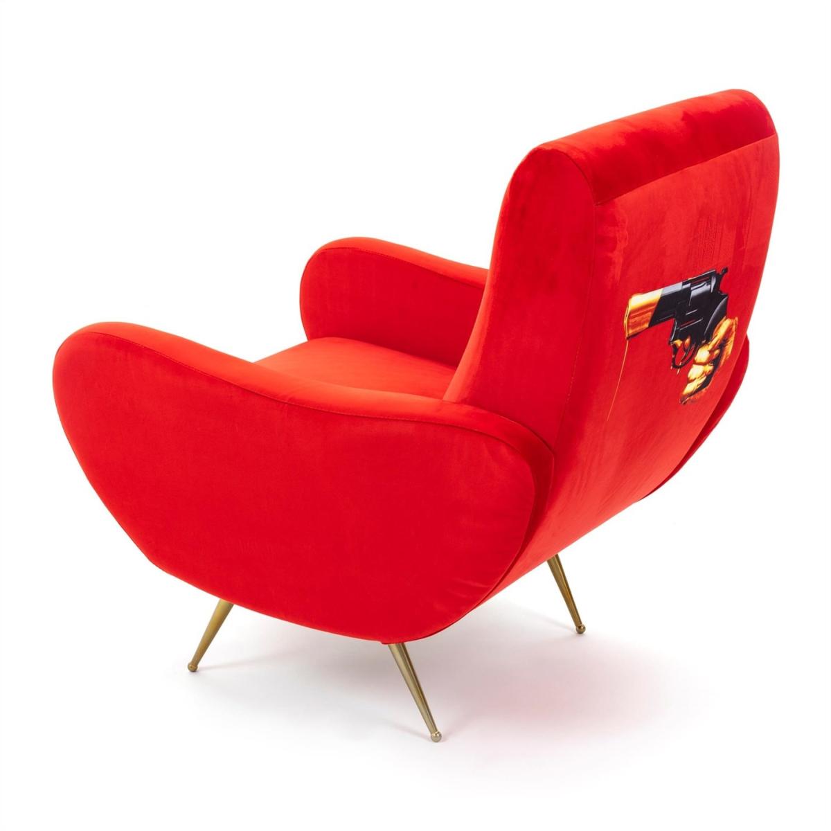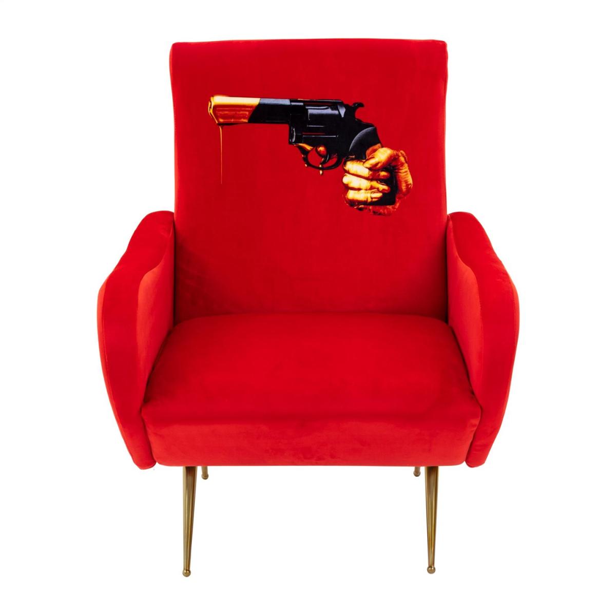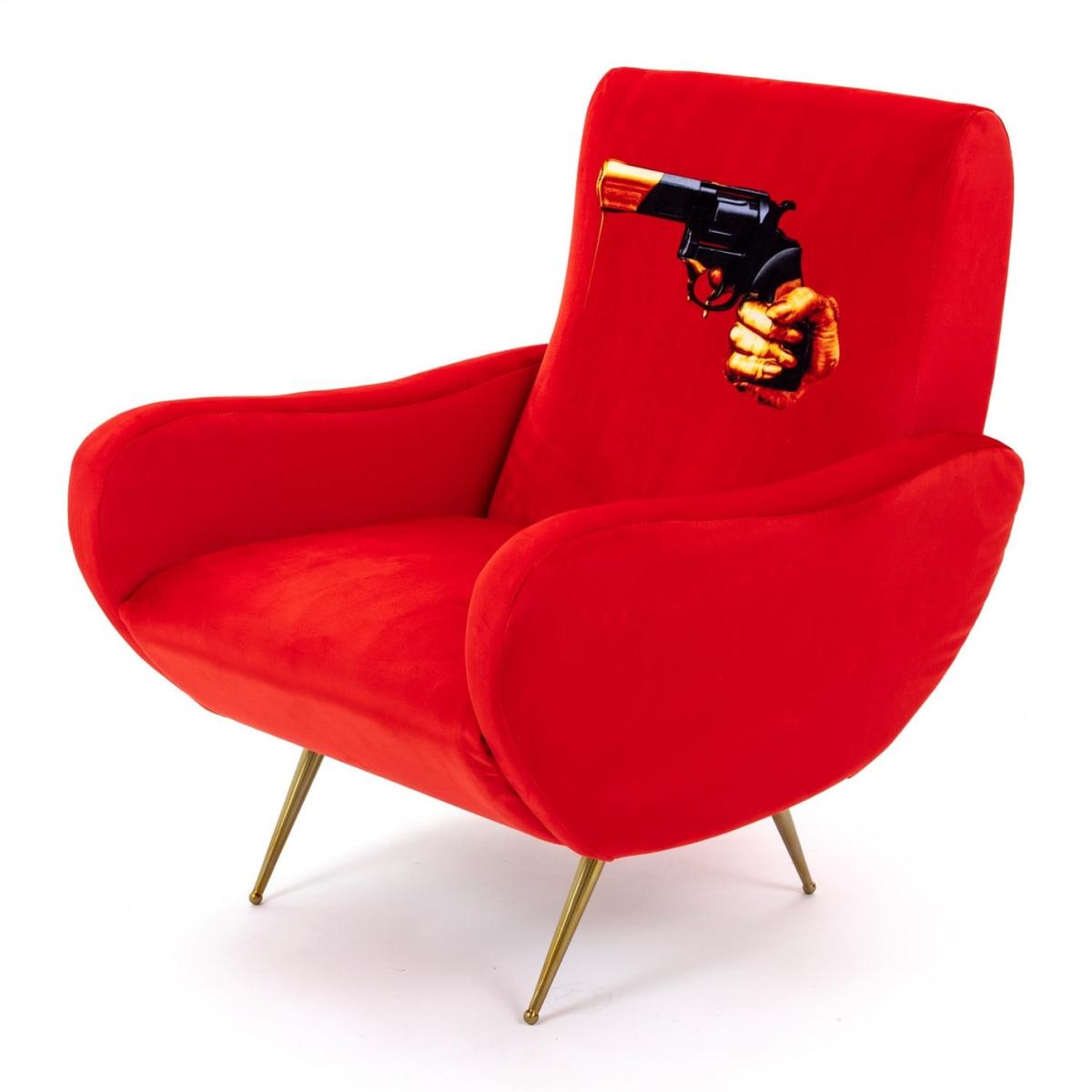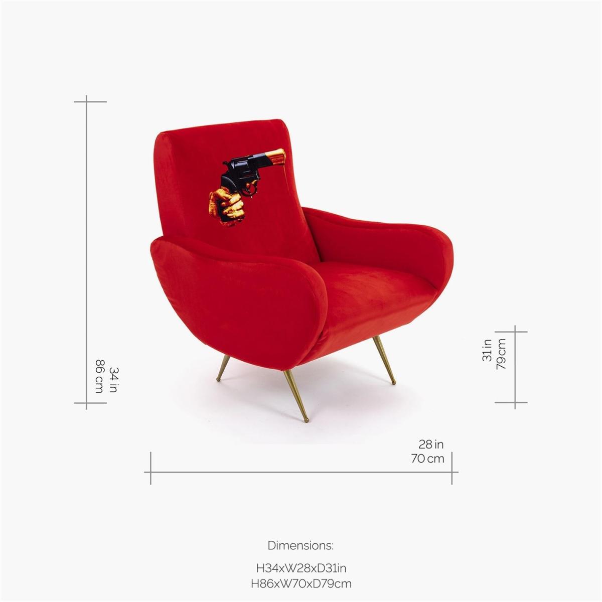 I love this quirky armchair because it combines playful design with comfort, making it a real statement piece. Its bold red upholstery and humorous graphic make it perfect for contemporary or eclectic interiors, especially those that embrace personality and fun. It works well as an accent piece in living rooms, reading nooks, or even stylish home offices. For styling tips, pair it with minimalist furniture to let the chair stand out, or add contrasting textures like velvet or leather for extra richness. Practicality-wise, it's ideal for spaces that encourage relaxed seating and can also be a conversation starter. Its vibrant look makes it best suited for interiors where a pop of colour or an element of wit is appreciated.
