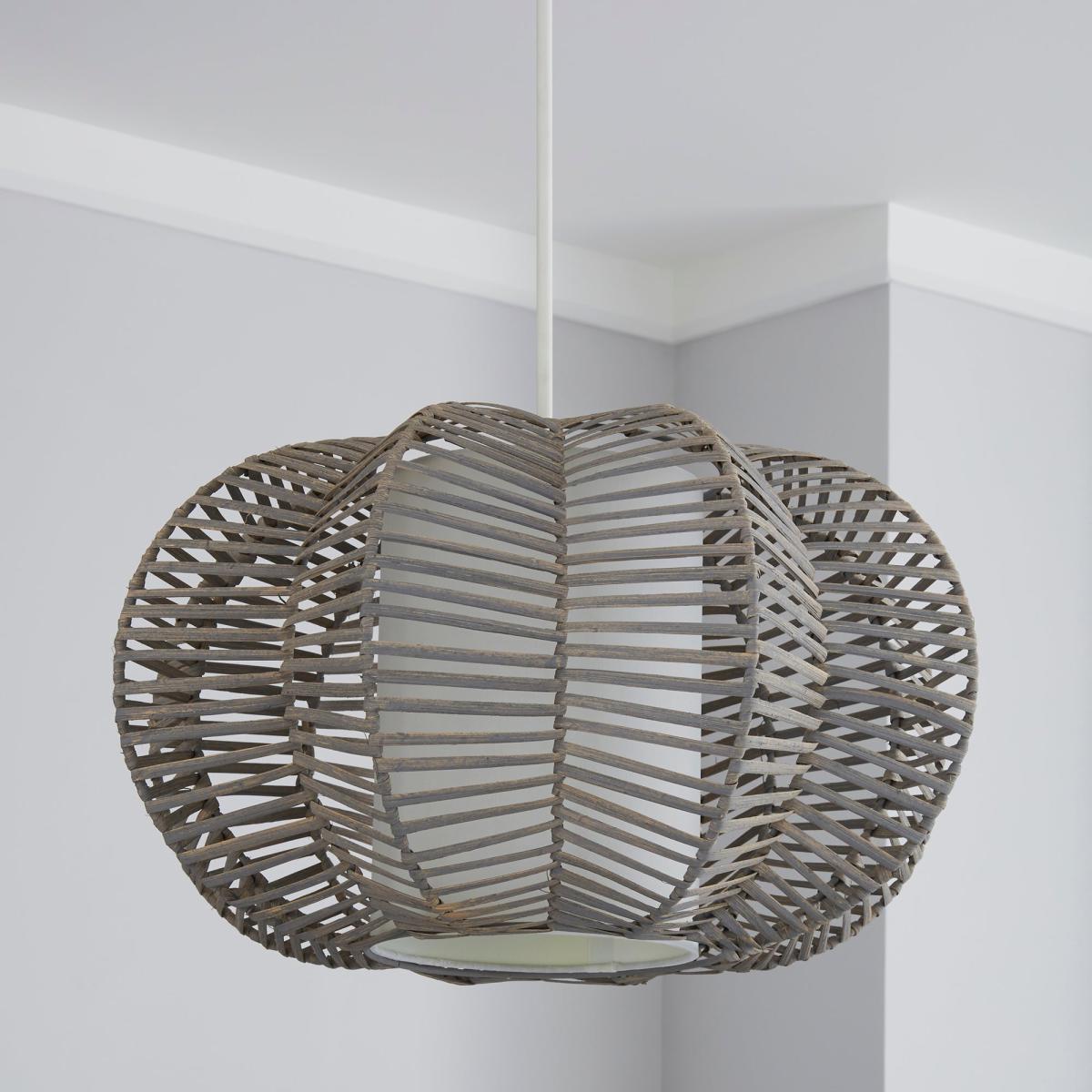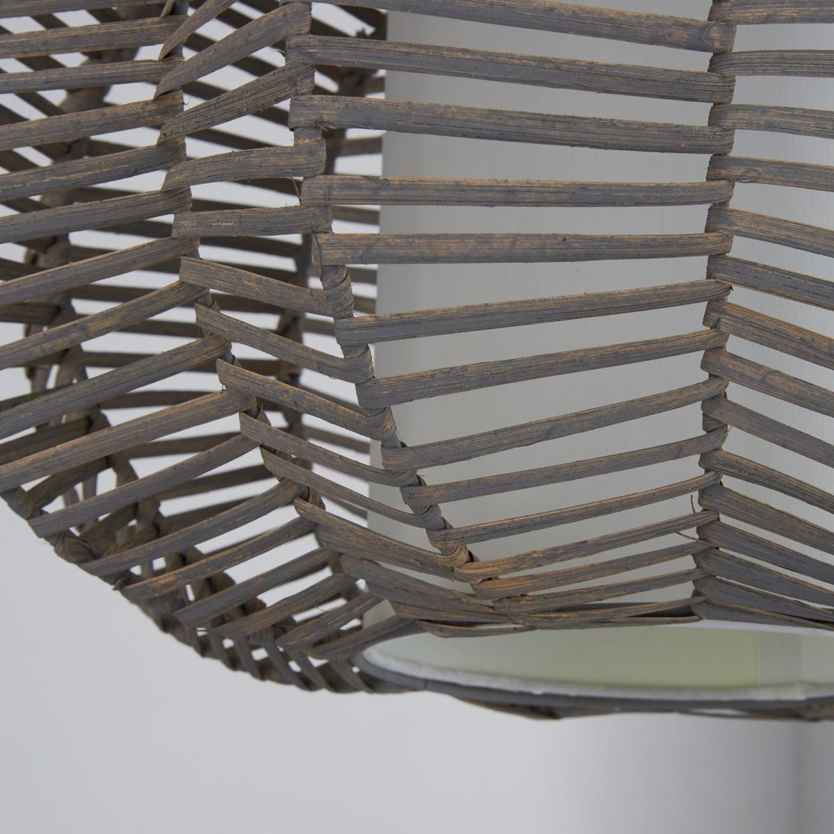 Crafted from rattan cane with a grey wash finish, this woven wicker light pendant features an eye-catching pumpkin-like shape with a cylindrical light shade.