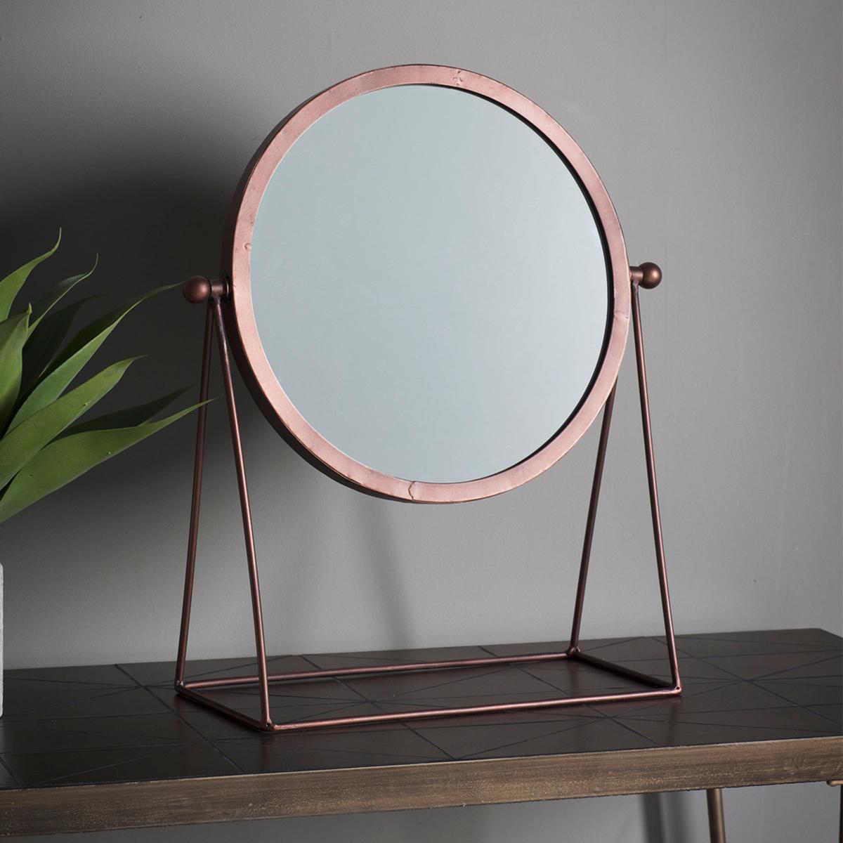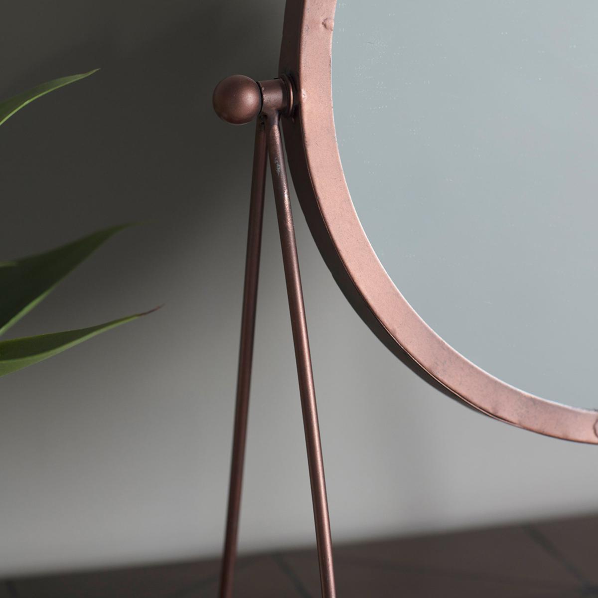 This contemporary table top mirror with adjustable angle is perfect for adding an industrial touch to your home. Finished with a copper frame, this round mirror is ideal as a final touch to any dressing table or console. Please note, unfortunately we cannot deliver this item to the Channel Islands.