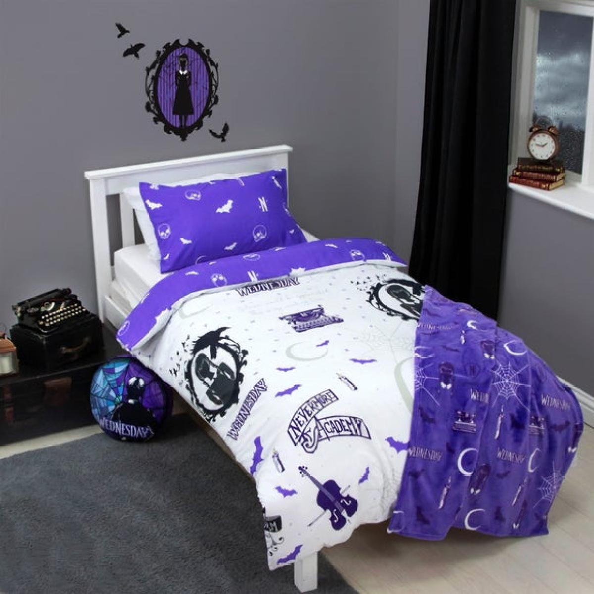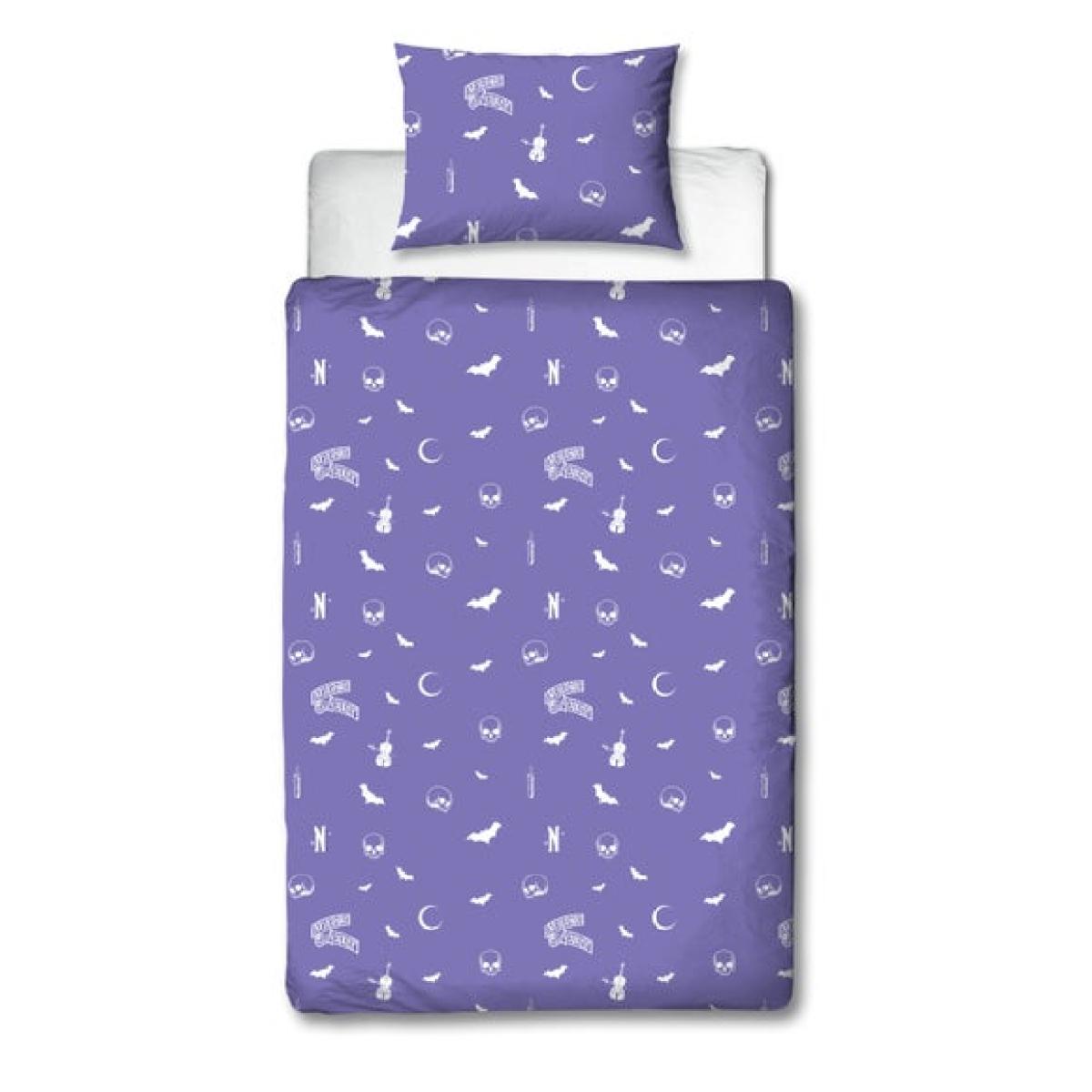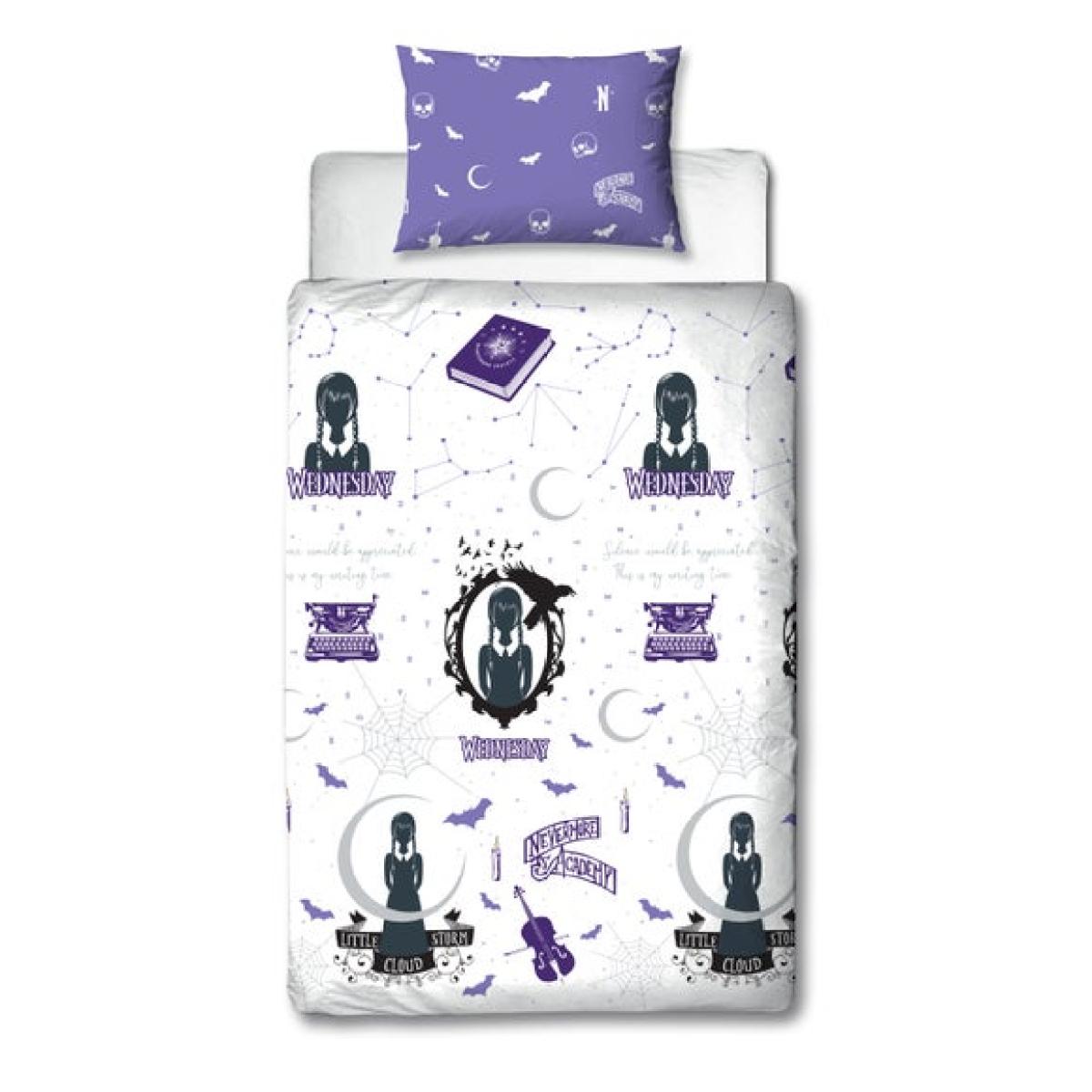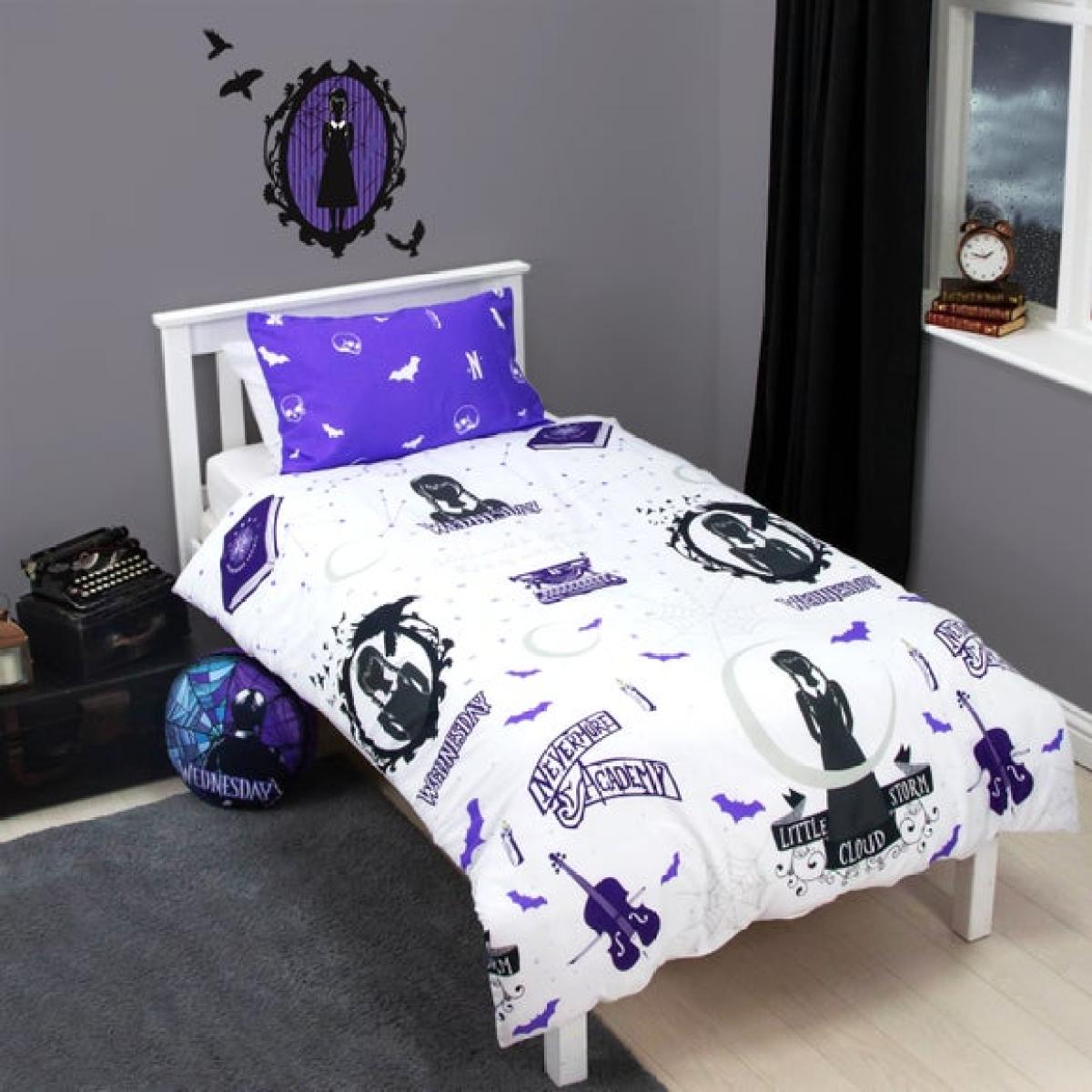 * Reversible design * Super soft material * Perfect for your baby bats Embrace the dark side of bedtime with this Wednesday Quilt Cover and Pillowcase Set. Inspired by the hauntingly stylish Netflix series, it's perfect for little vipers who prefer cello solos to lullabies and skulls to stars. The front features Wednesday Addams framed in gothic glory alongside ravens, typewriters and the Nevermore Academy crest, all set against a crisp white and purple backdrop. Flip it over for a deeper dive into the macabre, with bats, skulls and eerie emblems scattered across the soft material. With popper fastenings and easy care fabric, it's a dark delight for single beds, ideal for those who dream in shadows.