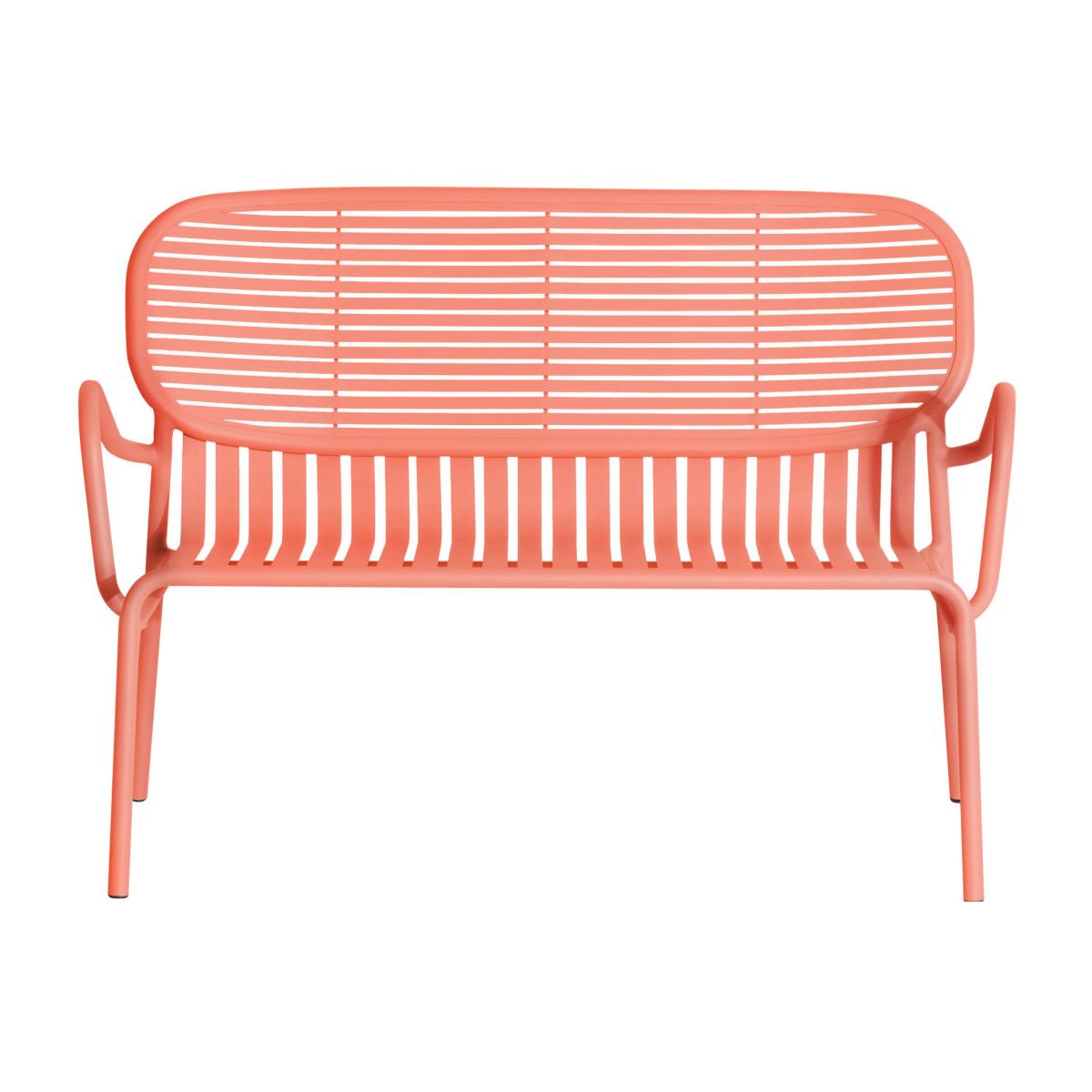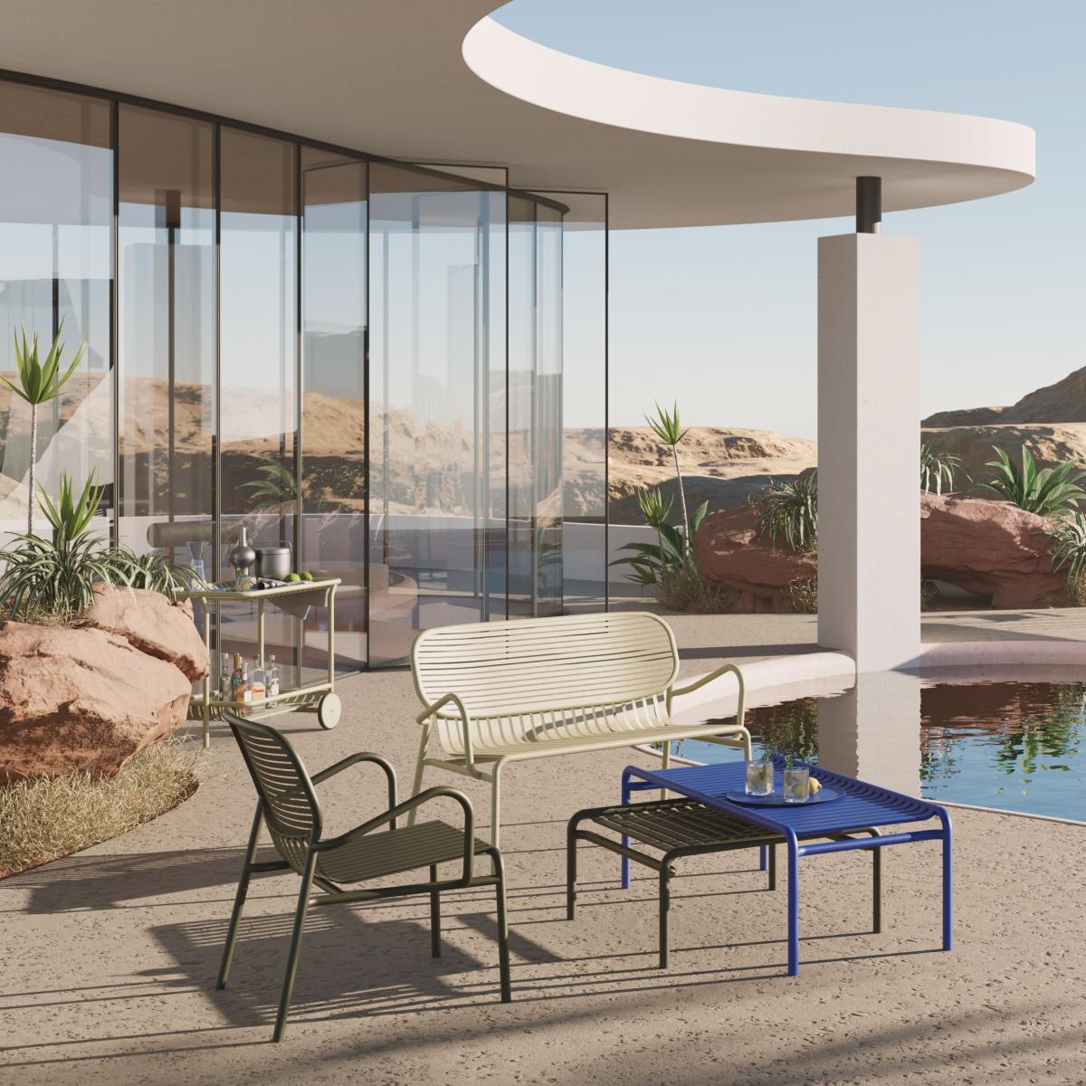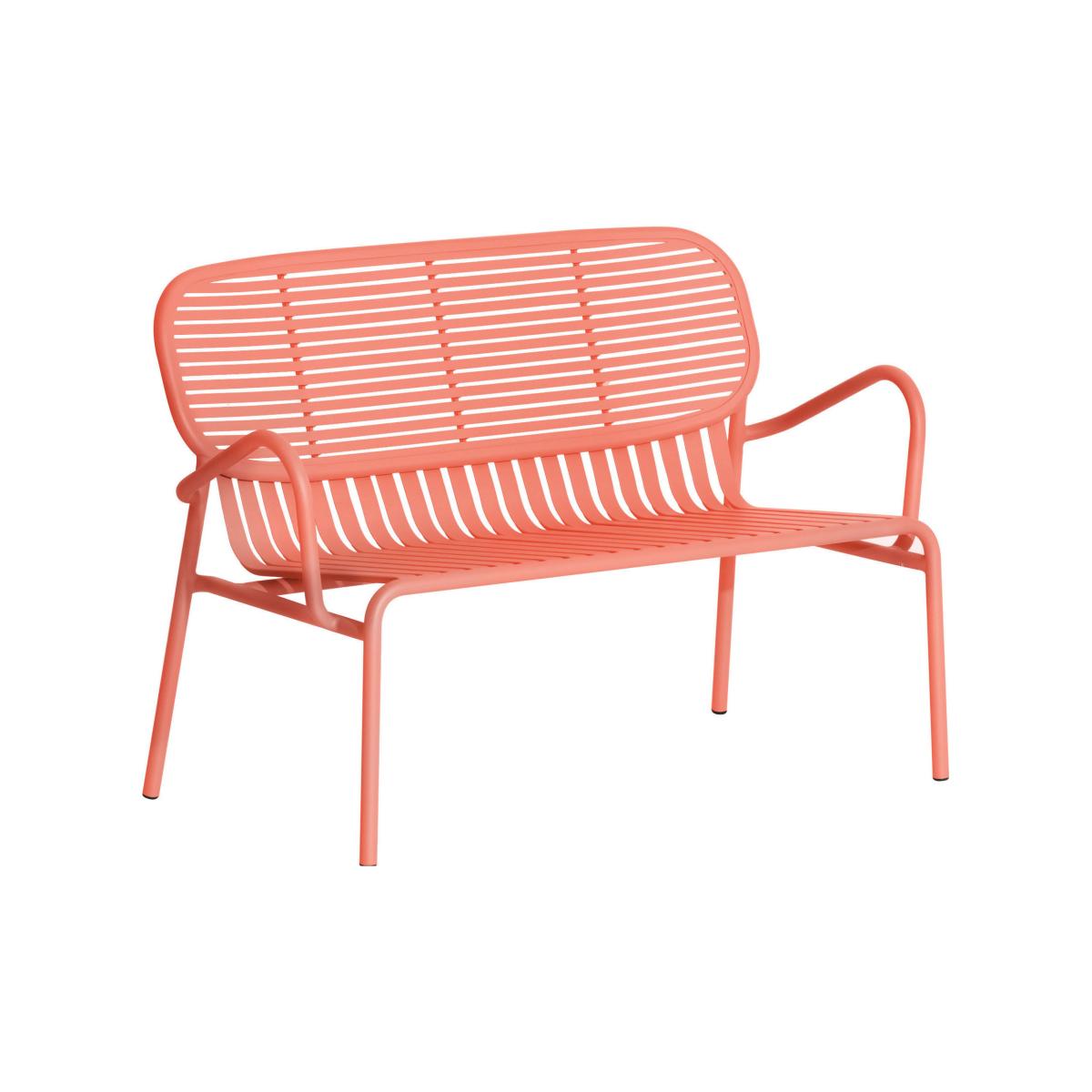 Cheerful, colourful and graphic, the Week-End collection brings life to your garden! This aluminium furniture is lightweight, mobile and easy to handle: a perfect collection for creating a modern outdoor lounge or a nice dining area on a terrace or in a kitchen. Every piece is water-resistant and UV-resistant, and can be used by the seaside. The Week-End collection has been designed by French studio Brichet. Ziegler. The oval, encircled shape creates the backrests so that they become a graphic sign. The work of the horizontal and vertical slats, like stripes, emphasises the full and empty spaces, affirming the collection’s identity. As pretty as it is functional, the Week-End collection has been designed for practical use: all of the seats are stackable. The ergonomic shapes are all about user comfort and their individual postures. This two-seater aluminium bench has been designed to withstand the tests of time. Can be accessorised with 2 LARGE seat cushions. Thanks to the wide colour range, combining muted tones and bold colours, Week-End enables you to create unique and daring outdoor compositions.