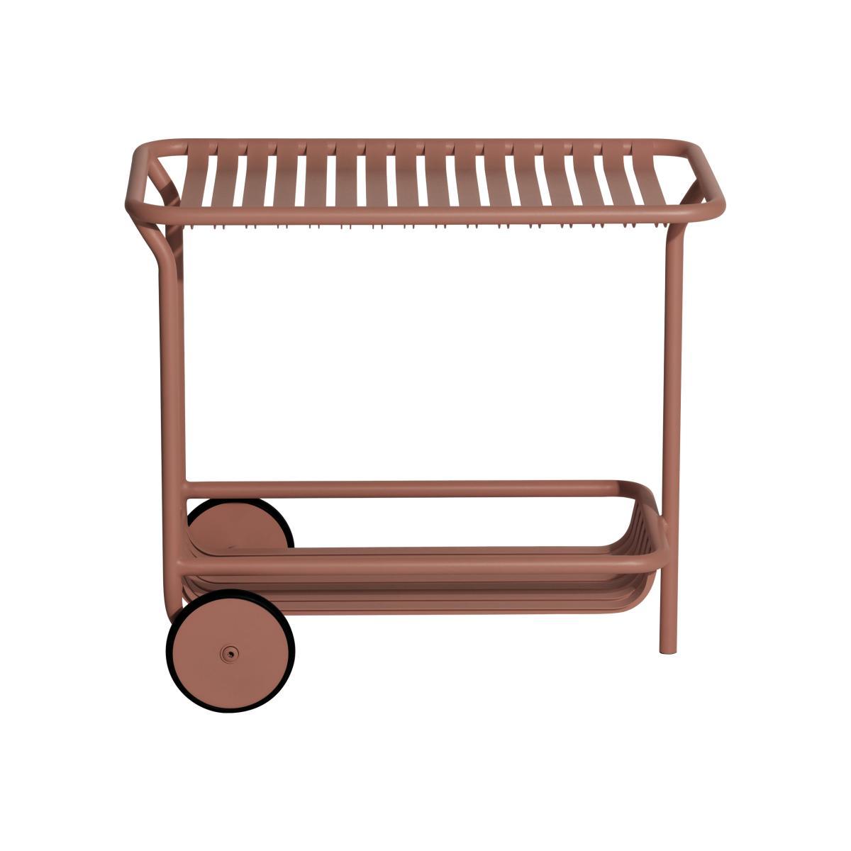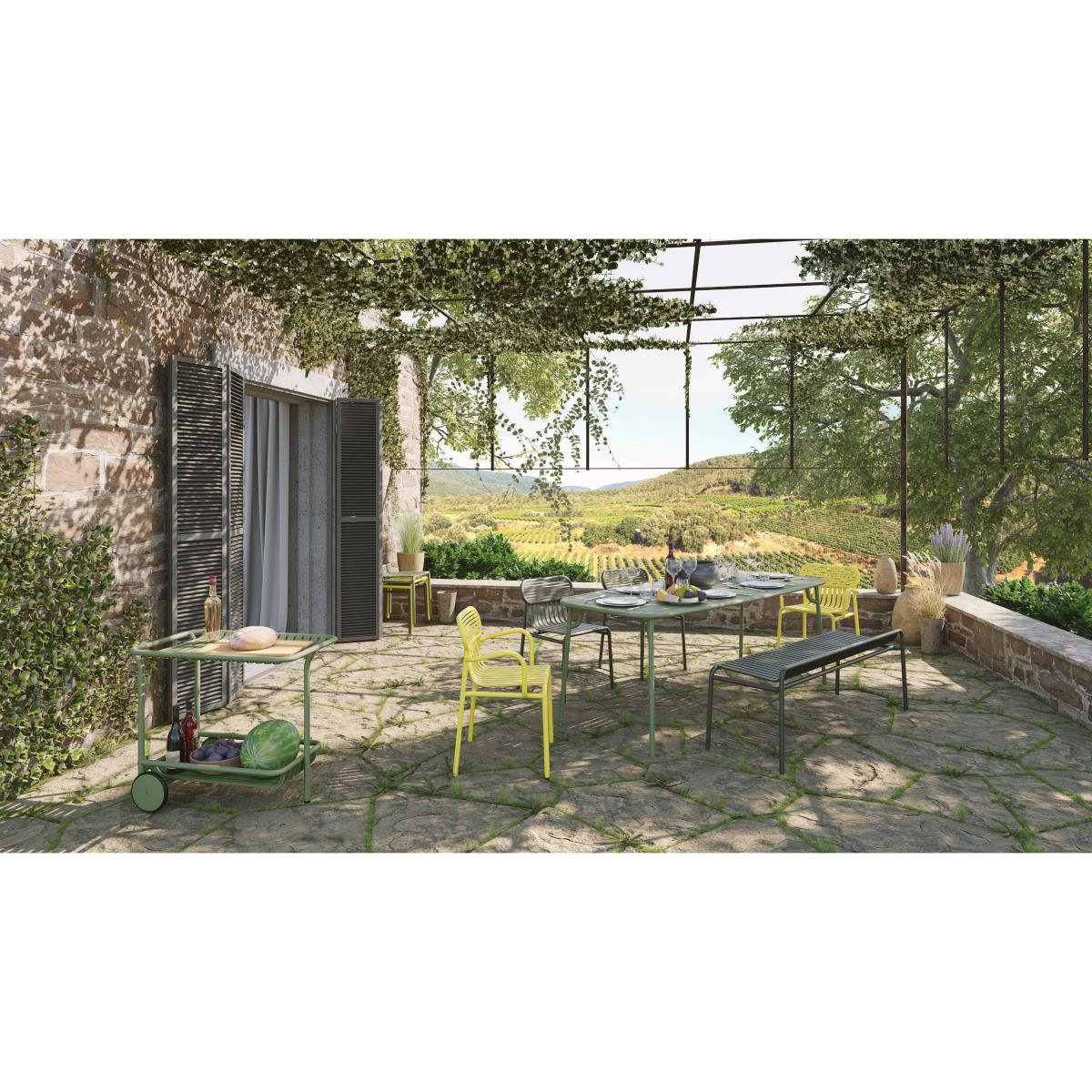 Cheerful, colourful and graphic, the Week-End collection brings life to your garden! This aluminium furniture is lightweight, mobile and easy to handle: a perfect collection for creating a modern outdoor lounge or a nice dining area on a terrace or in a kitchen. Every piece is water-resistant and UV-resistant, and can be used by the seaside. Essential for outdoor dining and summer meals, the Week-End serving trolley has been designed for practical use. It is easy to handle. Its two large shelves create a side table that can be used alongside your summer al fresco dining tables. The Week-End collection was designed by French studio Brichet. Ziegler. The oval, encircled shape creates the backrests so that they become a graphic sign. The work of the horizontal and vertical slats, like stripes, emphasises the full and empty spaces, affirming the collection’s identity. This aluminium serving trolley has been designed to withstand the tests of time. Thanks to the wide colour range, combining muted tones and bold colours, Week-End enables you to create unique and daring outdoor compositions.