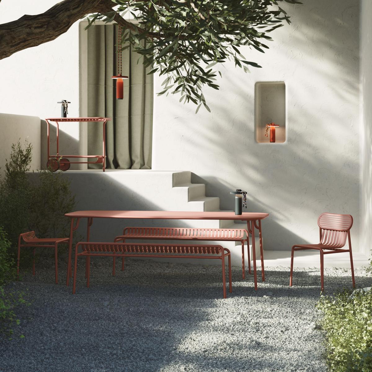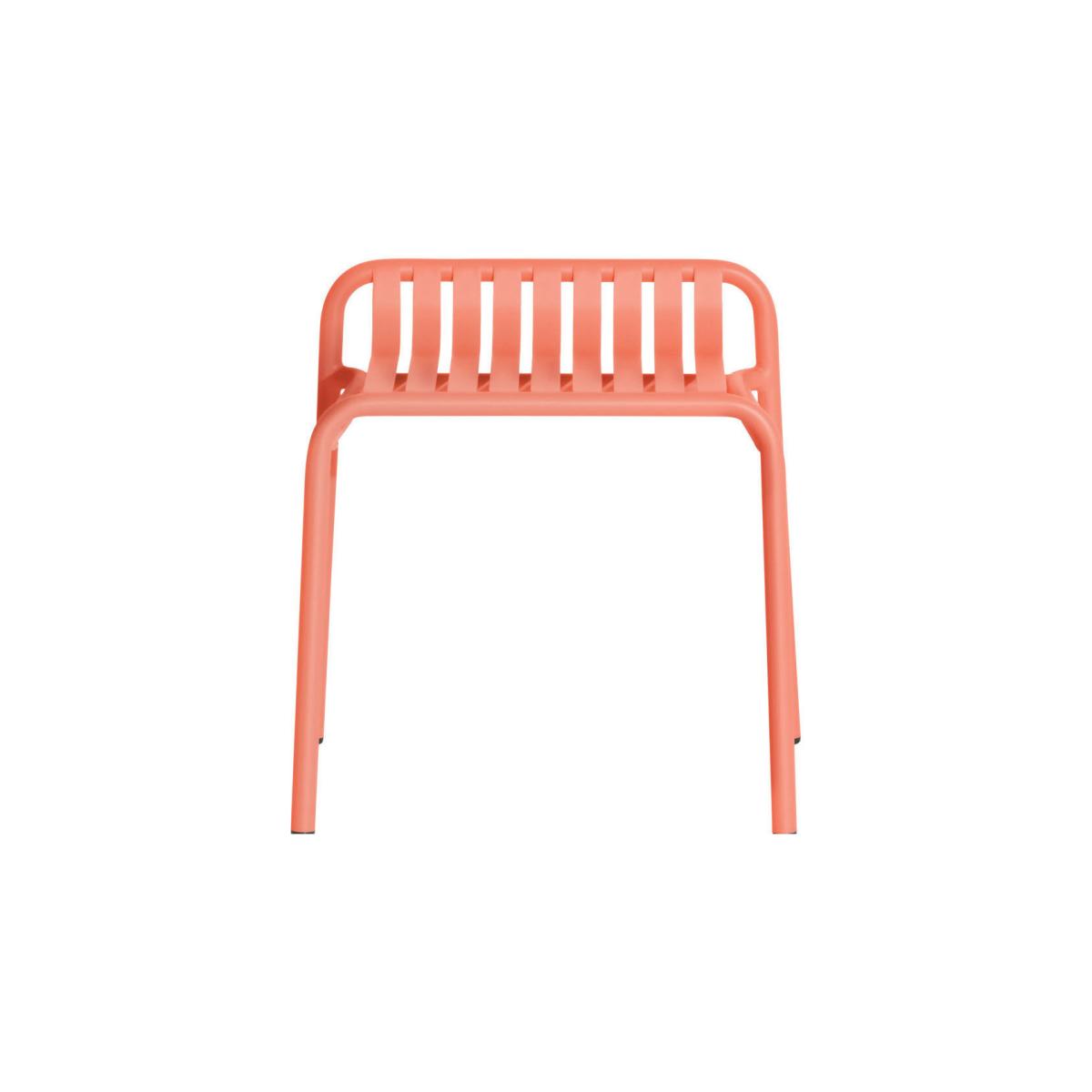 Cheerful, colourful and graphic, the Week-End collection brings life to your garden! This aluminium furniture is lightweight, mobile and easy to handle: a perfect collection for creating a modern outdoor lounge or a nice dining area on a terrace or in a kitchen. Every piece is water-resistant and UV-resistant, and can be used by the seaside. The Week-End collection has been designed by French studio Brichet. Ziegler. The oval, encircled shape creates the backrests so that they become a graphic sign. The work of the horizontal and vertical slats, like stripes, emphasises the full and empty spaces, affirming the collection’s identity. As pretty as it is functional, the Week-End collection has been designed for practical use: all of the seats are stackable. The ergonomic shapes are all about user comfort and their individual postures. This aluminium barstool embodies the concept of a sustainable product, designed to withstand the tests of time. Can be accessorised with 1 SMALL seat cushion. Thanks to the wide colour range, combining muted tones and bold colours, Week-End enables you to create unique and daring outdoor compositions.