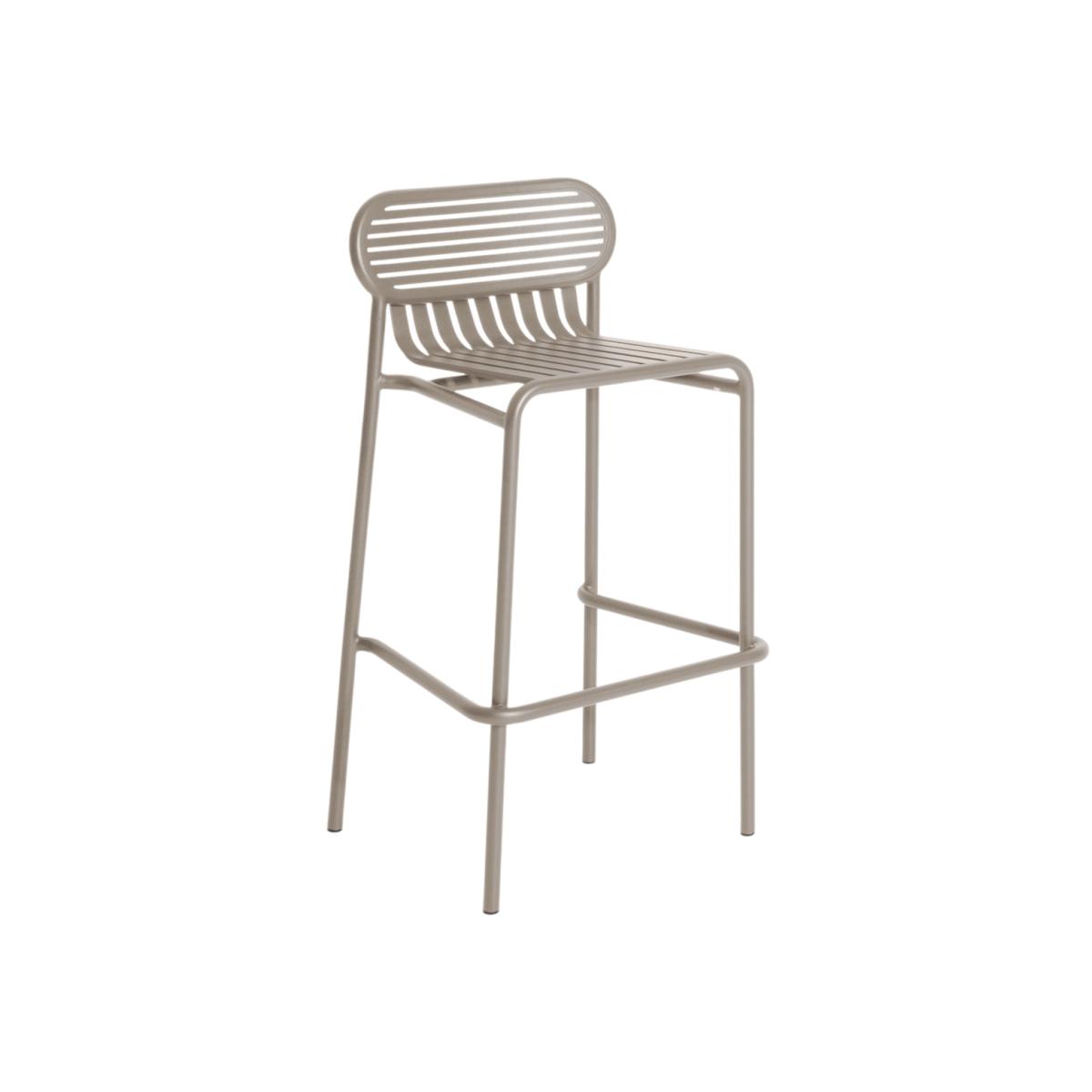 Cheerful, colourful and graphic, the Week-End collection brings life to your garden! This aluminium furniture is lightweight, mobile, easy to handle, and robust: a perfect collection for creating a modern outdoor lounge or a nice dining area on a terrace or in a kitchen. Every piece is water-resistant and UV-resistant, and can be used by the seaside. The Week-End collection was designed by French studio Brichet. Ziegler. The oval, encircled shape creates the backrests so that they become a graphic sign. The work of the horizontal and vertical slats, like stripes, emphasises the full and empty spaces, affirming the collection’s identity. As pretty as it is functional, the Week-End collection has been designed for practical use: all of the seats are stackable. The ergonomic shapes are all about user comfort and their individual postures. This aluminium barstool embodies the concept of a sustainable product: corrosion-resistant, reinforced slats, this armchair has been designed to withstand the tests of time. Can be accessorised with 1 SMALL seat cushion. Thanks to the wide colour range, combining muted tones and bold colours, Week-End enables you to create unique and daring outdoor compositions.