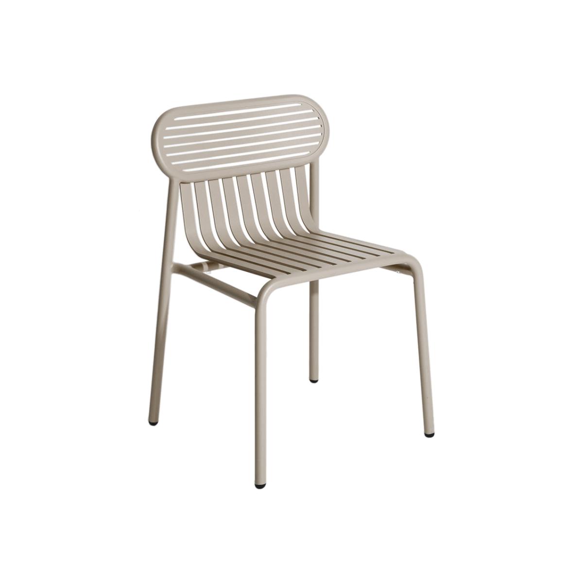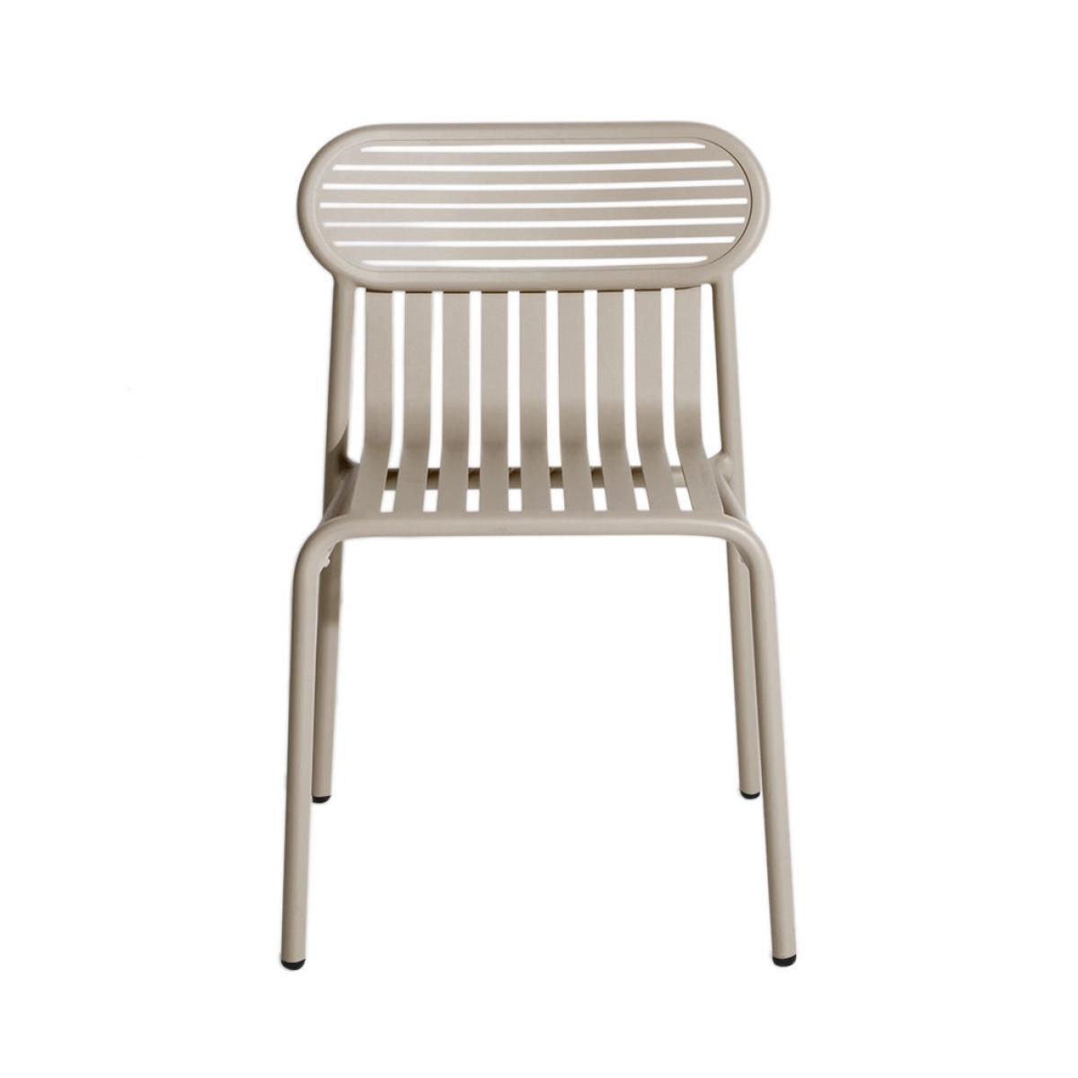 Cheerful, colourful and graphic, the Week-End collection brings life to your garden! This aluminium furniture is lightweight, mobile, easy to handle, and robust: a perfect collection for creating a modern outdoor lounge or a nice dining area on a terrace or in a kitchen. Every piece is water-resistant and UV-resistant, and can be used by the seaside. The Week-End collection was designed by French studio Brichet. Ziegler. The oval, encircled shape creates the backrests so that they become a graphic sign. The work of the horizontal and vertical slats, like stripes, emphasises the full and empty spaces, affirming the collection’s identity. As pretty as it is functional, the Week-End collection has been designed for practical use: all of the seats are stackable. The ergonomic shapes are all about user comfort and their individual postures. This aluminium garden chair embodies the concept of a sustainable product: corrosion-resistant, reinforced slats, this chair has been designed to withstand the tests of time. Can be accessorised with 1 SMALL seat cushion. Thanks to the wide colour range, combining muted tones and bold colours, Week-End enables you to create unique and daring outdoor compositions.