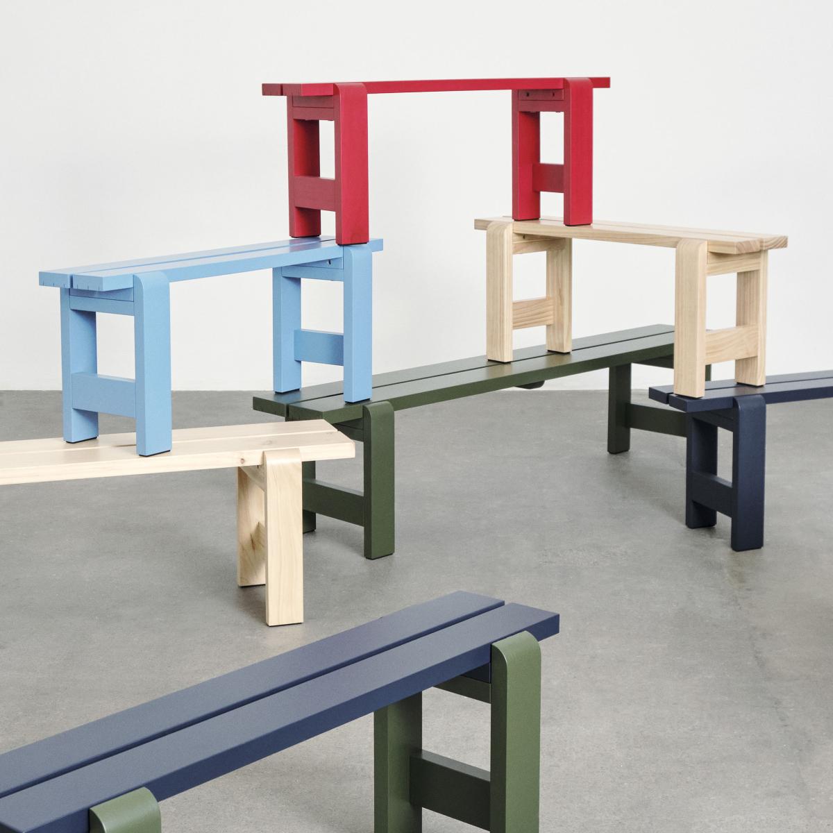 Working between Stuttgart and Zurich, the Hannes&Fritz studio brings together two talented young designers: Hannes Breuer and Fritz Gräber. Their collection of Weekday outdoor furniture comes from their eco-responsible project “Bench TWO” created in a few copies. This two-person bench with its reduced dimensions has been made from a single 3-metre-long pine plank, using all the wood with no waste. The narrower dimensions than traditional benches allow it to be used even in the narrowest spaces without losing seating comfort. In collaboration with Hay, the designers from the Hannes&Fritz studio have expanded their project by creating a complete collection of benches and tables for outdoors to create a designer, original, durable dining area in your garden. These pieces of furniture are all made of FSC™-certified solid pine with a zero waste objective in the manufacturing process. The cutting of the boards has been perfectly designed to avoid any useless offcuts of wood. The wood is painted with an eco-friendly water-based outdoor lacquer. The seats and tops are made of planks supported by a base with solid lines. These pieces of furniture have a humble, familiar appearance. The rigorous, strict forms are associated with a pretty palette of fresh colours. The Weekday collection features a mix of joyful intensity and remarkable sobriety, poetry and geometry. The benches can be accessorised with cushions sold separately.
