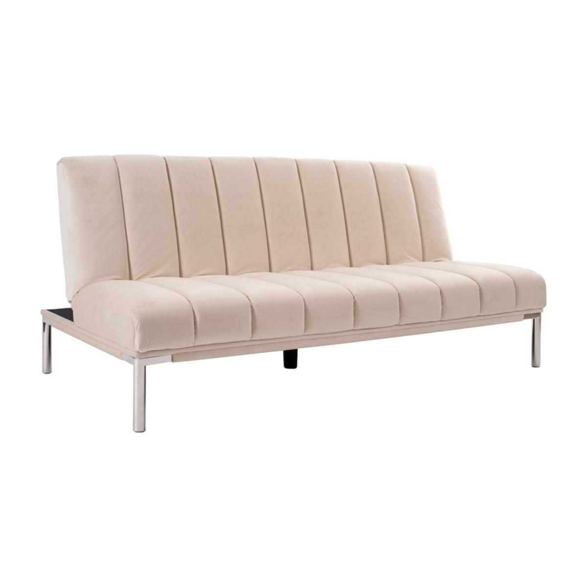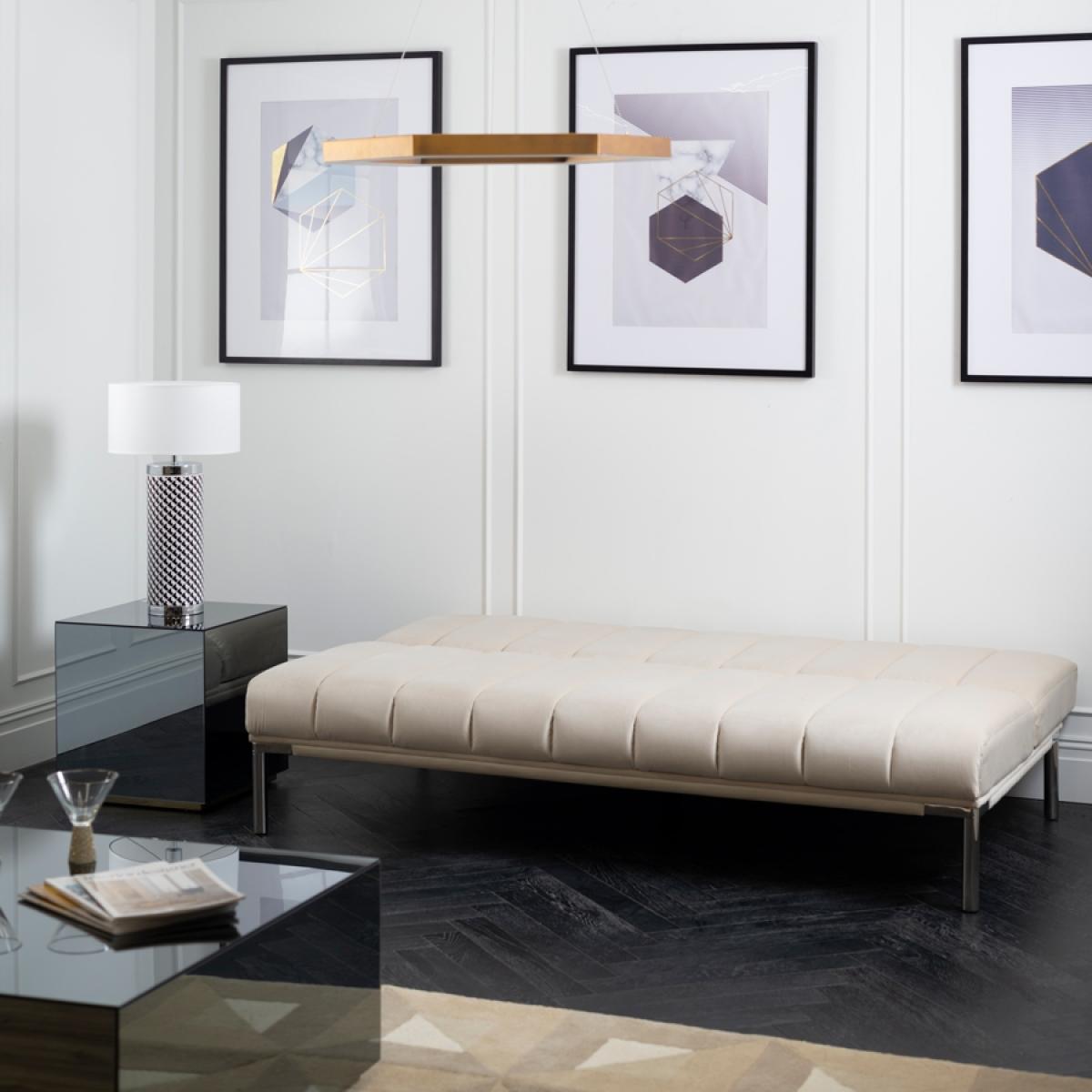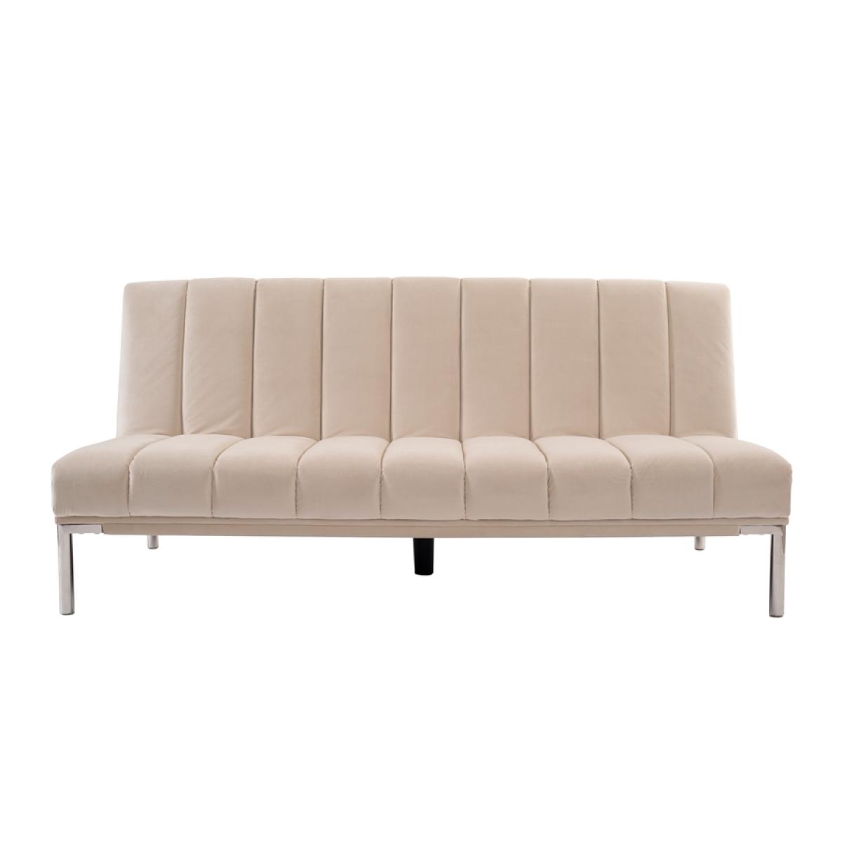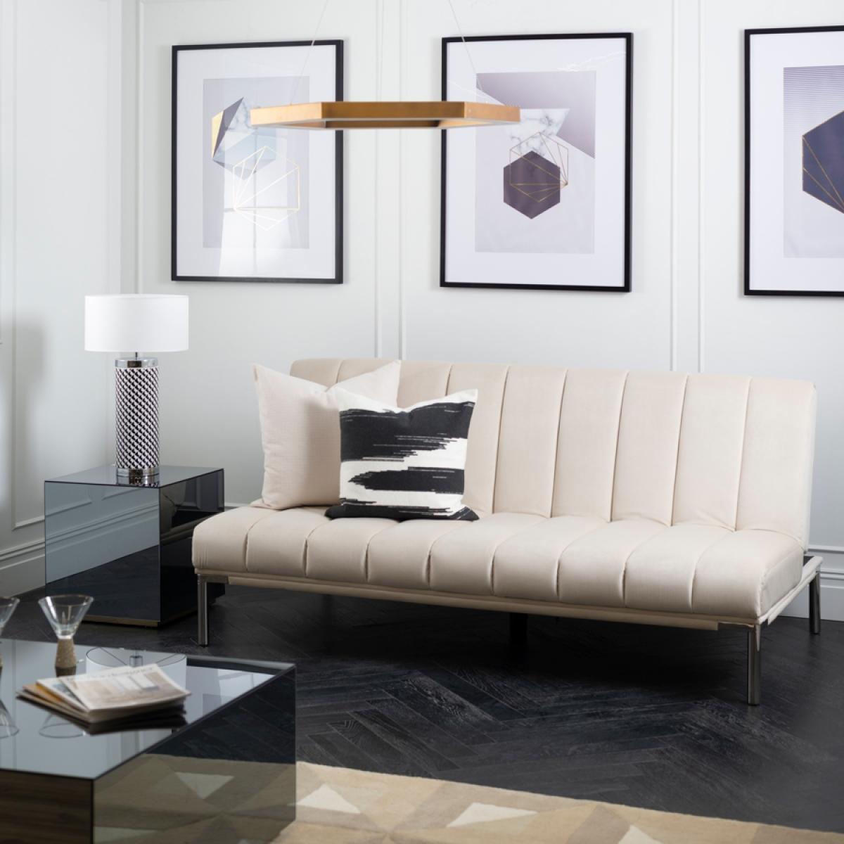 A stylish sofa bed which can be effortlessly transformed in seconds - ideal for guests and occasional use. Folds out to the equivalent size of a single bed. Ideal for use in family rooms and studies. Soft and practical velvet fabric. Deep padded upholstery with distinctive fluted quilting. Sleek Steel frame with polished chrome finish. Supplied fully assembled.