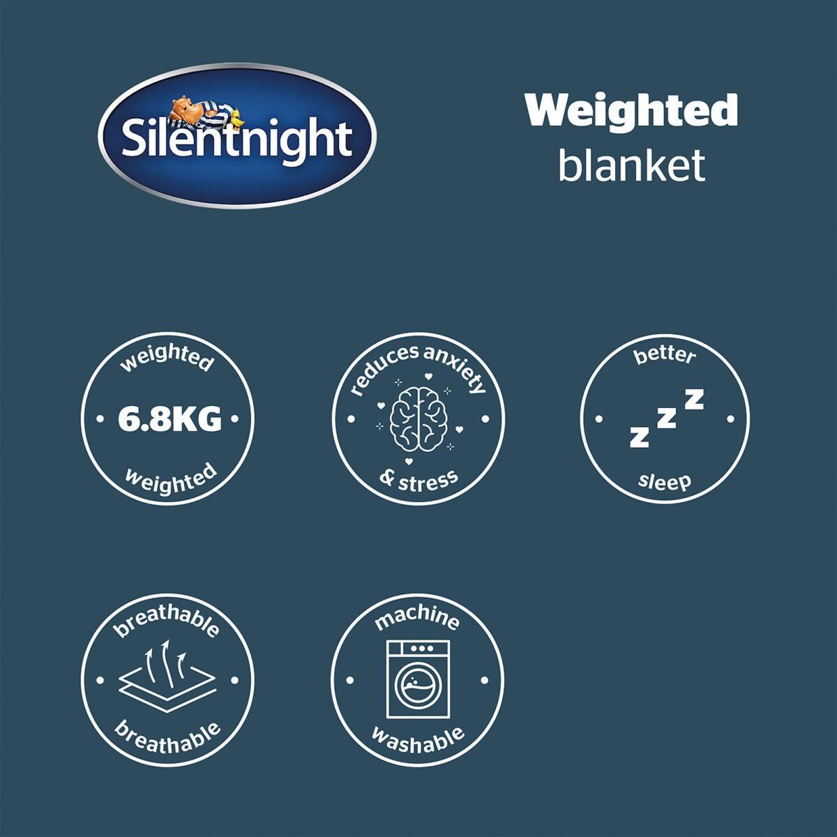 Introducing calm, relaxation and a great big hug, all wrapped up in one lovely weighted blanket. The Silentnight Weighted Blanket is natural sleep therapy at its best. This weighted blanket helps to relax the nervous system giving the gentle sensation of being hugged which eases anxiety, stress and encourages deep and restful sleep. Wrapping yourself in the blanket increases happy hormones (serotonin and melatonin) and at the same time decreases stress hormones (cortisol) to improve your mood, ensuring you fall asleep feeling content and happy. The blanket is filled with tiny glass beads that offer comforting pressure to your body. These clever beads are virtually undetectable, all you will feel of them is their lovely weight. The blanket is made from soft quilted microfibre for extra huggable comfort. Your blanket can be machine washed and it is hypoallergenic. This blanket weighs 6.8kg and should be approximately 10% of the user’s body weight. Our weighted blanket is not recommended for use by persons under the age or 18 years old, the elderly, pregnant women, anyone suffering from respiratory disorders including asthma or anyone with circulatory issues including diabetes. Please consult a medical professional if you have any medical related concerns about this product. IMPROVED SLEEP: Our Wellbeing Collection has been designed specifically with your sleep wellness in mind, helping you to achieve a calm and restful night’s sleep. EASE ANXIETY AND STRESS: Designed to give you a therapeutic gentle hug helping you to prepare for sleep. WAKE UP HAPPY: The deep touch pressure stimulation of the blanket will help to ease you into a calming and restful sleep. 6.8KG WEIGHT: This blanket weighs 6.8kg and should be approximately 10% of the user’s body weight. EVEN DISTRIBUTION: The blanket is filled with undetectable weighted glass beads sewn into a soft and breathable quilted cover. The glass beads are housed within equally stitched pockets to prevent noise & movement and for even distribution. QUALITY GUARANTEED: 12 months manufacturer’s peace of mind guarantee. Product Dimensions- L152 x W203cm x H1cm. This product will be dispatched by one of our trusted suppliers. You’ll be contacted by their selected courier about your delivery. Goods must be unused and returned in their original packaging. If sealed for health/hygiene reasons they must also be returned unopened with seals, stickers and tags intact.