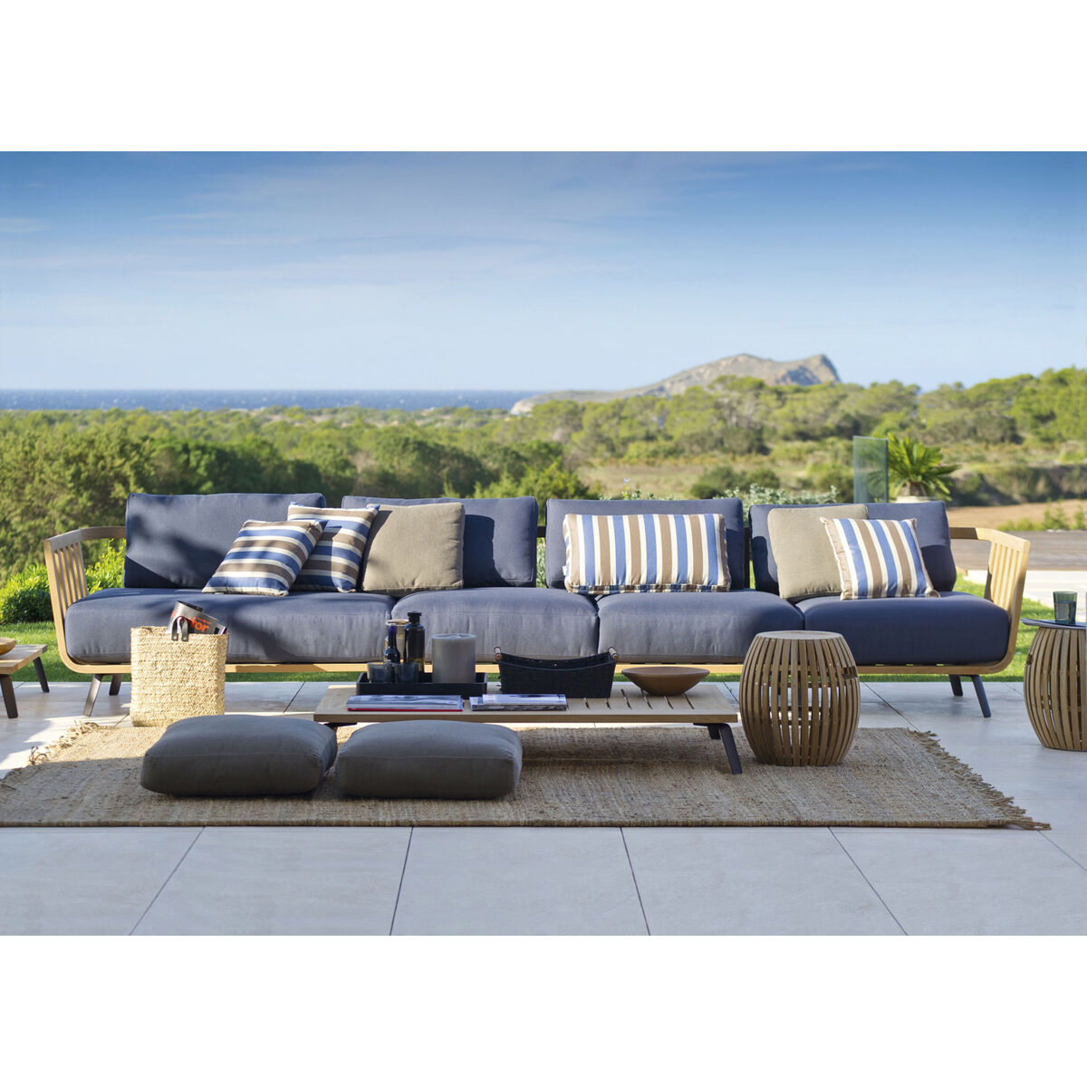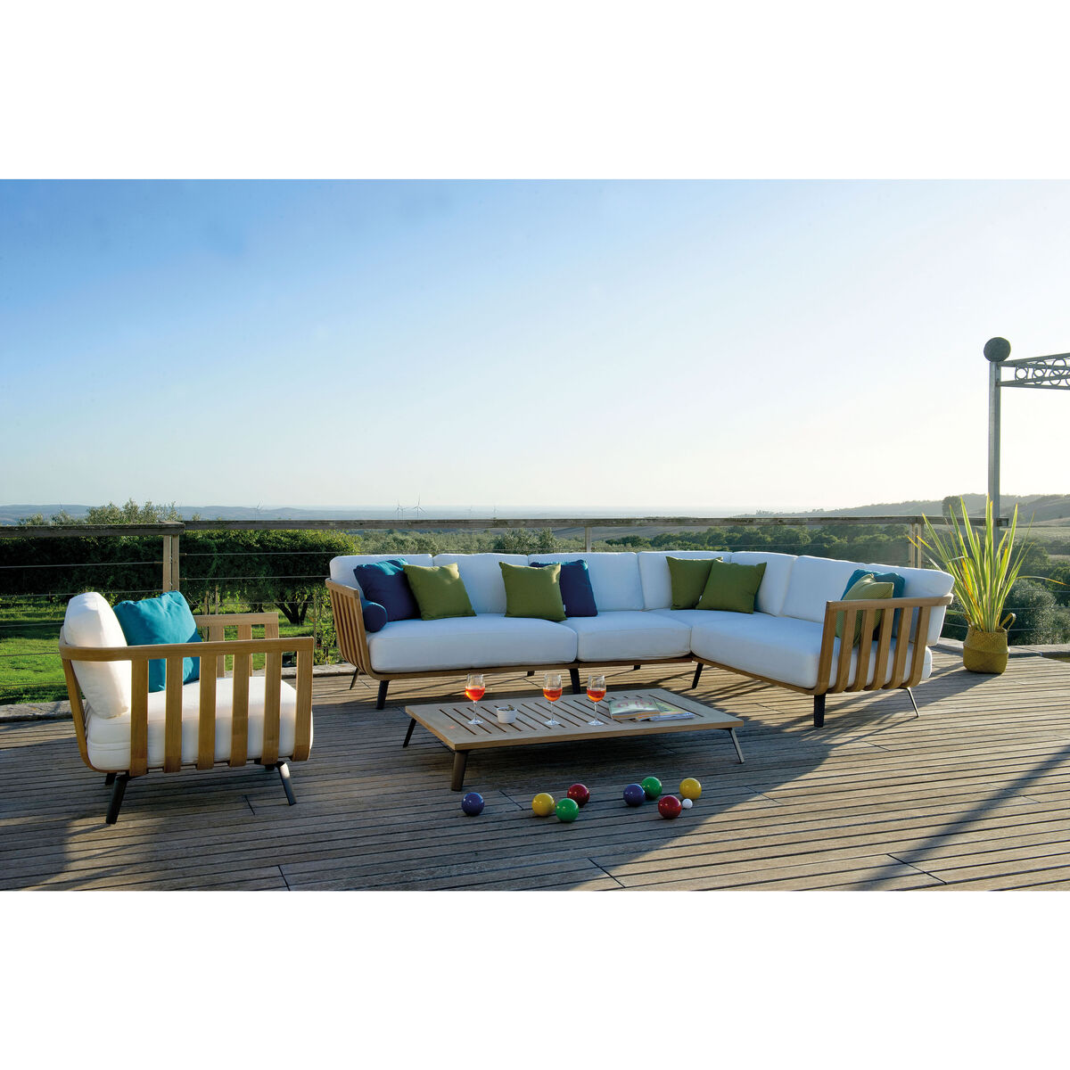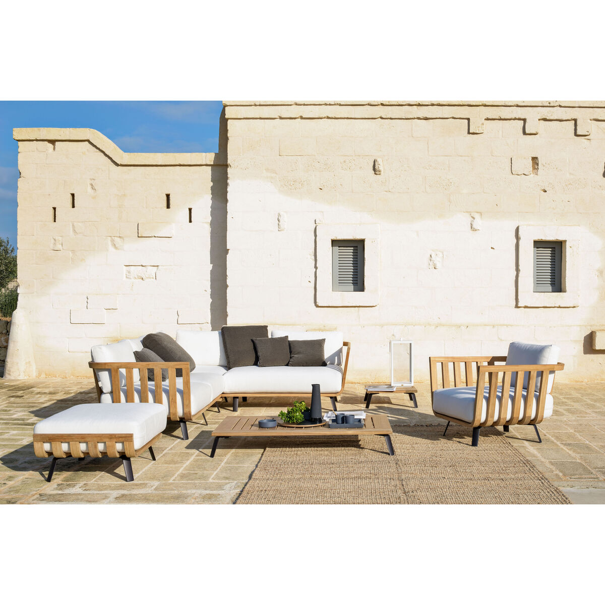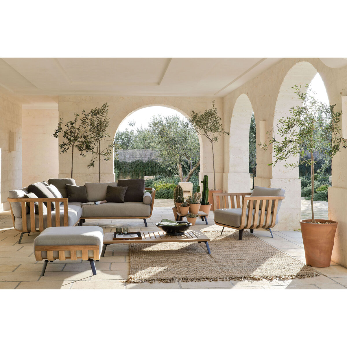 Elegant and warm, this teak coffee table completes the Welcome collection. With its sober, refined lines, this table stands out for its simplicity. Teak is an exceptional wood, refined and timeless. Used in such iconic places as the decks of the finest boats or Asian temples, it has excellent technical characteristics: stable, durable, soft to the touch and pleasantly fragrant, it gains a patina indoors, taking on a golden brown hue over time, or oxidises outdoors, which does not affect its properties in any way, but gives it a characteristic silver-grey hueUnopiù uses ″Grade A″-category solid teak″: the most noble wood, obtained from the central part of the trunk. It comes from Indonesian plantations certified in compliance with ecological parameters. The outdoor furniture from Italian brand Unopiù stands out for its careful, considered design, refined finishes and high manufacturing quality. The top-quality materials are worked by mixing skilled craftsmanship and cutting-edge tools. Unopiù represents an Italian lifestyle all over the world in which well-being, design and quality blend together, allowing a unique experience of living outdoors all year round. Thanks to the most advanced technologies, rigorous selection of raw materials and artisanal know-how, Unopiù products can withstand the most extreme weather and climatic conditions.