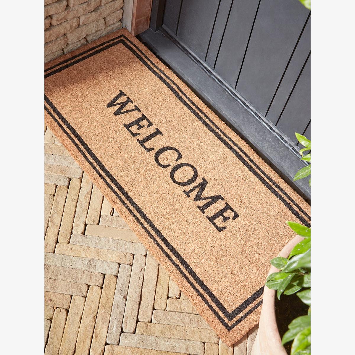 Smart but homely, our double doormat spells out the warm welcome visitors to your house will receive. With a sophisticated black border, the mat is made from natural coir with the design printed in black. A stylish decorative touch for hallway or porch that will also protect your carpets and flooring from winter shoes.