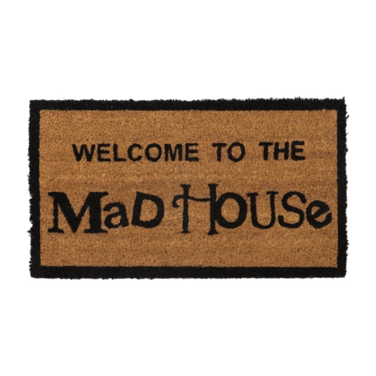 Welcome To The Mad House novelty design doormat.100% Biodegradable. Rubber latex backing reduces risk of slipping. Mechanically twisted coir for less shedding. Great scraper properties.100% natural coir (coconut hair) with rubber latex backing. 15mm pile depth. Natural coir will disintegrate with one year. Latex compound will disintegrate within five years, subject to soil conditions. Size: L:60 x W:33.5cm approx.