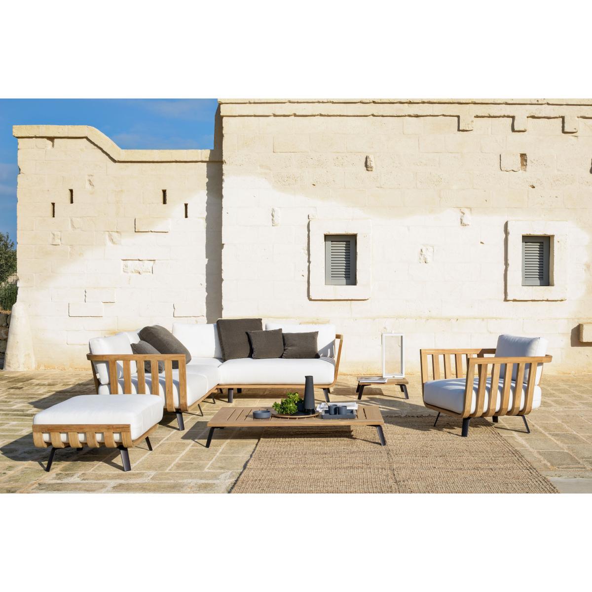 The Welcome outdoor furniture collection stands out for its aerial structure made of steam-curved teak slats using an ancient craft technique. A must-have in summer, teak gives a warm and authentic style to your garden or terrace. The bronze metal feet add a contemporary dimension to the silhouette. The openwork teak structure comes with its own soft cushions with removable covers made of a waterproof acrylic fabric, resistant to UV rays and mould. On some models from the Welcome collection, teak is combined with a superb covering in hand-woven rope using refined, sophisticated traditional techniques. Teak is an exceptional wood, refined and timeless. Used in iconic places such as boat decks, it has excellent technical characteristics: stable, durable, soft to the touch and pleasantly fragrant, it gains a patina indoors, taking on a golden brown hue over time, or oxidises outdoors, which does not affect its properties in any way, but gives it a characteristic silver-grey hue Unopiù uses "Grade A"-category solid teak. It is the most noble wood, obtained from the central part of the trunk and sourced from Indonesian plantations certified in compliance with ecological parameters. The outdoor furniture from Italian brand Unopiù stands out for its careful, considered design, refined finishes and high manufacturing quality. The top-quality materials are worked by mixing skilled craftsmanship and cutting-edge tools. Unopiù represents an Italian lifestyle all over the world in which well-being, design and quality blend together, allowing a unique experience of living outdoors all year round. Thanks to the most advanced technologies, rigorous selection of raw materials and artisanal know-how, Unopiù products can withstand the most extreme weather and climatic conditions.
