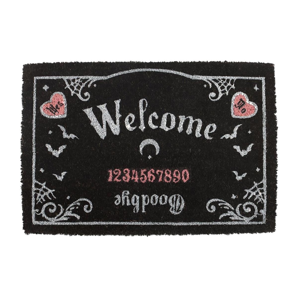 Unlock the door to the mystical with our unique Talking Board Coir Doormat! A captivating first impression for those who dare to be different. This isn't your ordinary welcome mat, it's a portal to personality for your doorstep! Crafted from durable natural coir fibres, this doormat features a striking talking board (Ouija-inspired) design in a contemporary and edgy pink, white and black colour scheme. The tough coir bristles are excellent for summoning away dirt, mud, and unwanted debris from shoes, helping to keep your threshold clean while making a bold statement. Whether you're welcoming fellow seekers or just adding a touch of arcane style to your entryway, this talking board doormat is sure to spark conversations and intrigue. It also makes a wonderfully unique gift for the mystic or lover of curiosities in your life.