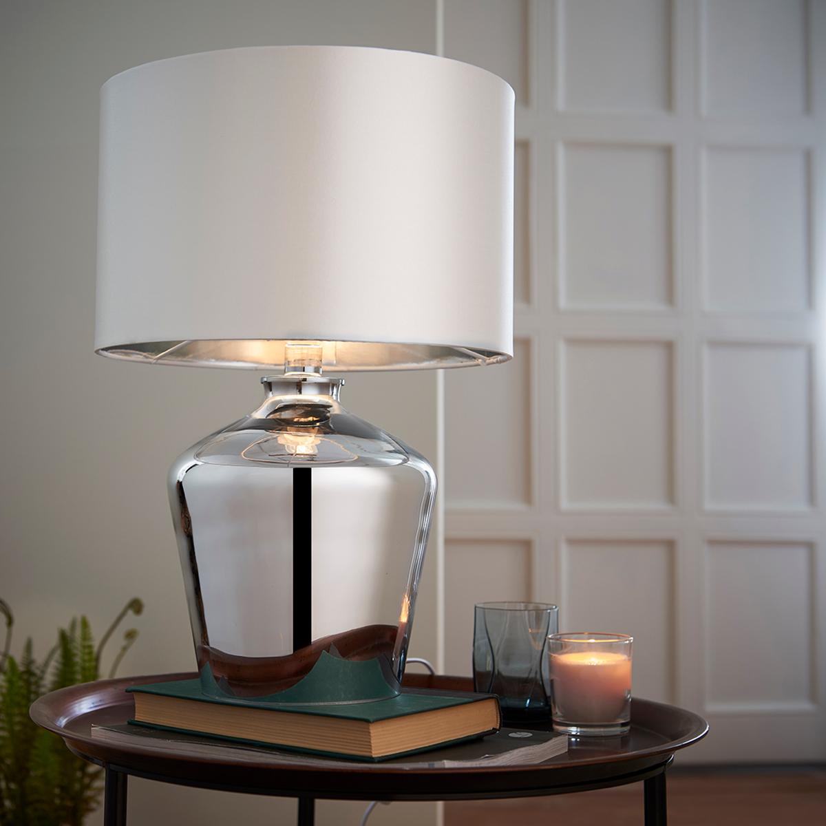 I love this chrome and ivory lamp for its sleek, contemporary aesthetic that adds a touch of sophistication to any room. It works especially well in modern or minimalist interiors, but can also provide a striking contrast in more traditional settings. Practical styling tips include placing it on a side table or console to create a cosy, illuminated vignette. Pair it with neutral textiles and metallic accents for a cohesive look, or use it to add a subtle touch of shine to darker colour schemes. Its understated elegance makes it versatile, and the glass base ensures it catches the light beautifully, making it a functional yet stylish choice for living rooms or bedside tables.