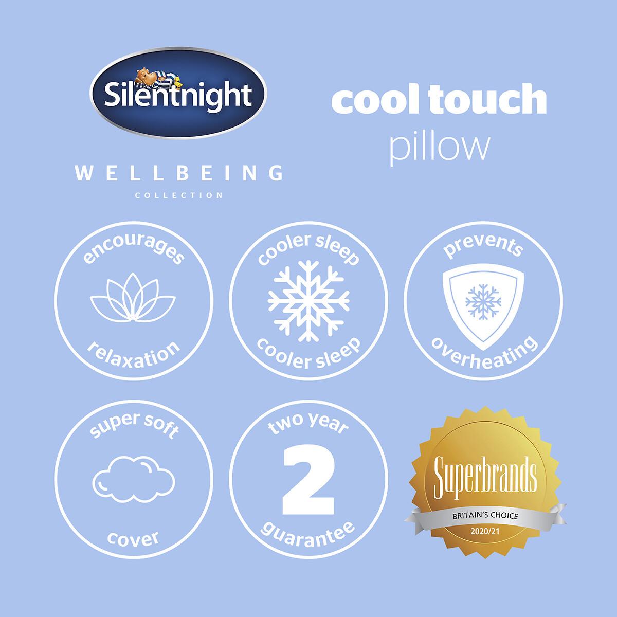 Enjoy a blissfully cool night's sleep. The Silentnight Cool Touch pillow has been designed to offer instant and long-lasting relief to over-heaters. Featuring a cooling gel pad which is pressure activated, helping to prevent overheating throughout the night - no flipping needed!Body heat is transferred to the pillow through conduction, the cooling gel absorbs the heat transferred and disperses it through its layer which prevents any heat from being radiated back to the body. The cooling affect helps to ensure a more restful night’s sleep and works to prevent overheating which is a common cause of sleep disturbance. This pillow provides medium support with lots of comfort, perfect for all sleepers. Proudly made in the UK with quality guaranteed.•IMPROVED SLEEP:Our Wellbeing Collection has been designed specifically with your sleep wellness in mind, helping you to achieve a calm and restful night’s sleep.•LONG LASTING COOL COMFORT:Enjoy a blissfully cool night’s sleep with the Silentnight Cool Touch pillow; no pillow flipping needed!•PREVENTS OVERHEATING: Cool to the touch, the pressure activated cooling gel pad helps to absorb excess body heat. This naturally cooling effect helps prevent overheating as you sleep.•SOOTHING RELIEF: Ideal for over-heaters and those who struggle with night sweats or hot flushes, so you can sleep without interruption until morning•SUPER SOFT COVER:Super soft cover for ultimate comfort.•GUARANTEE: 2 year manufacturer’s guarantee. This product will be dispatched by one of our trusted suppliers. You’ll be contacted by their selected courier about your delivery. COMFY01. Goods must be unused and returned in their original packaging. If sealed for health/hygiene reasons they must also be returned unopened with seals, stickers and tags intact.