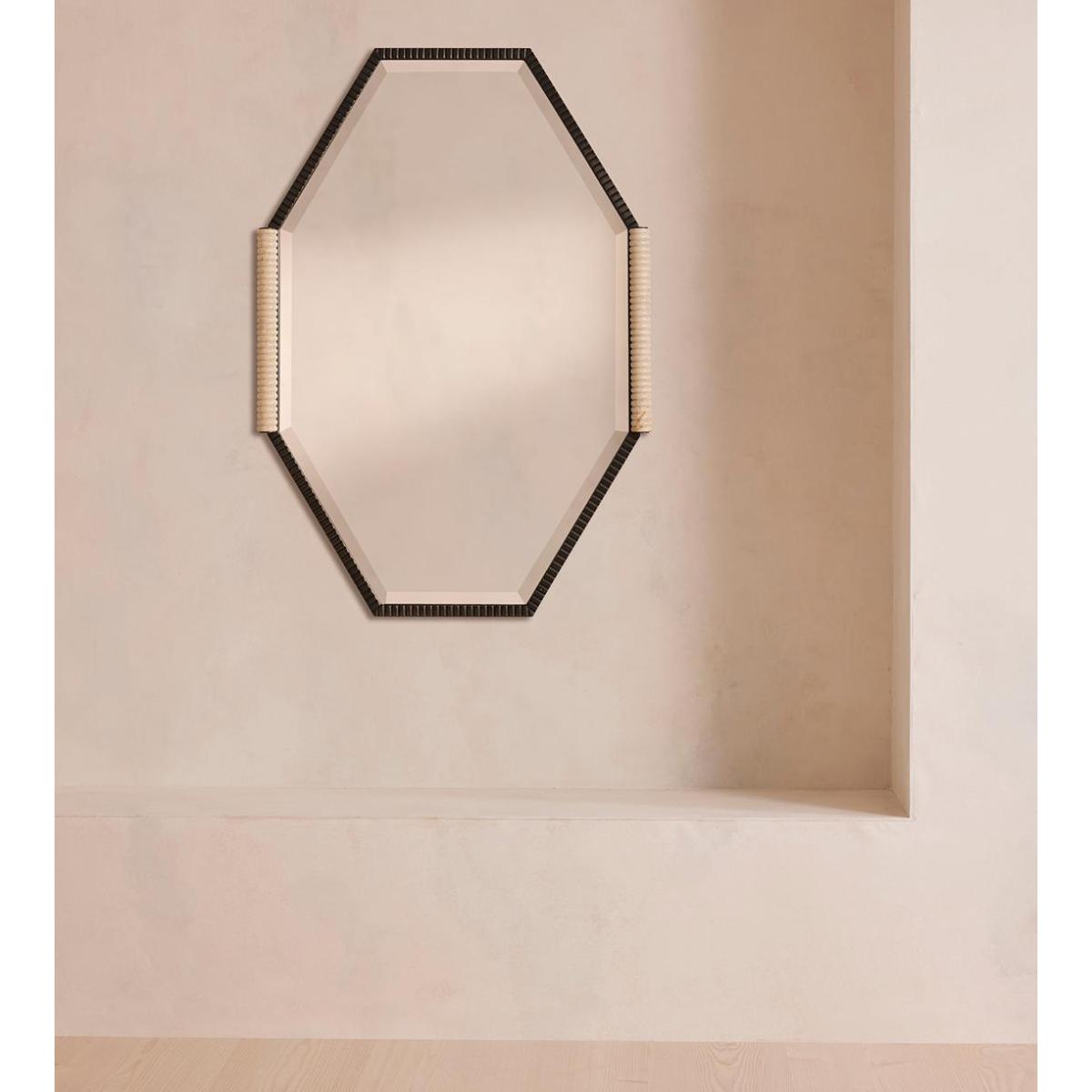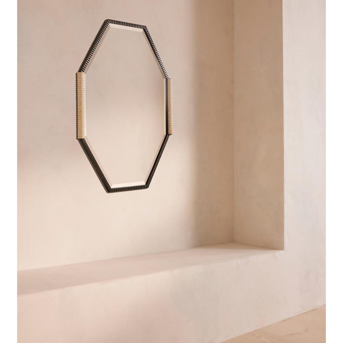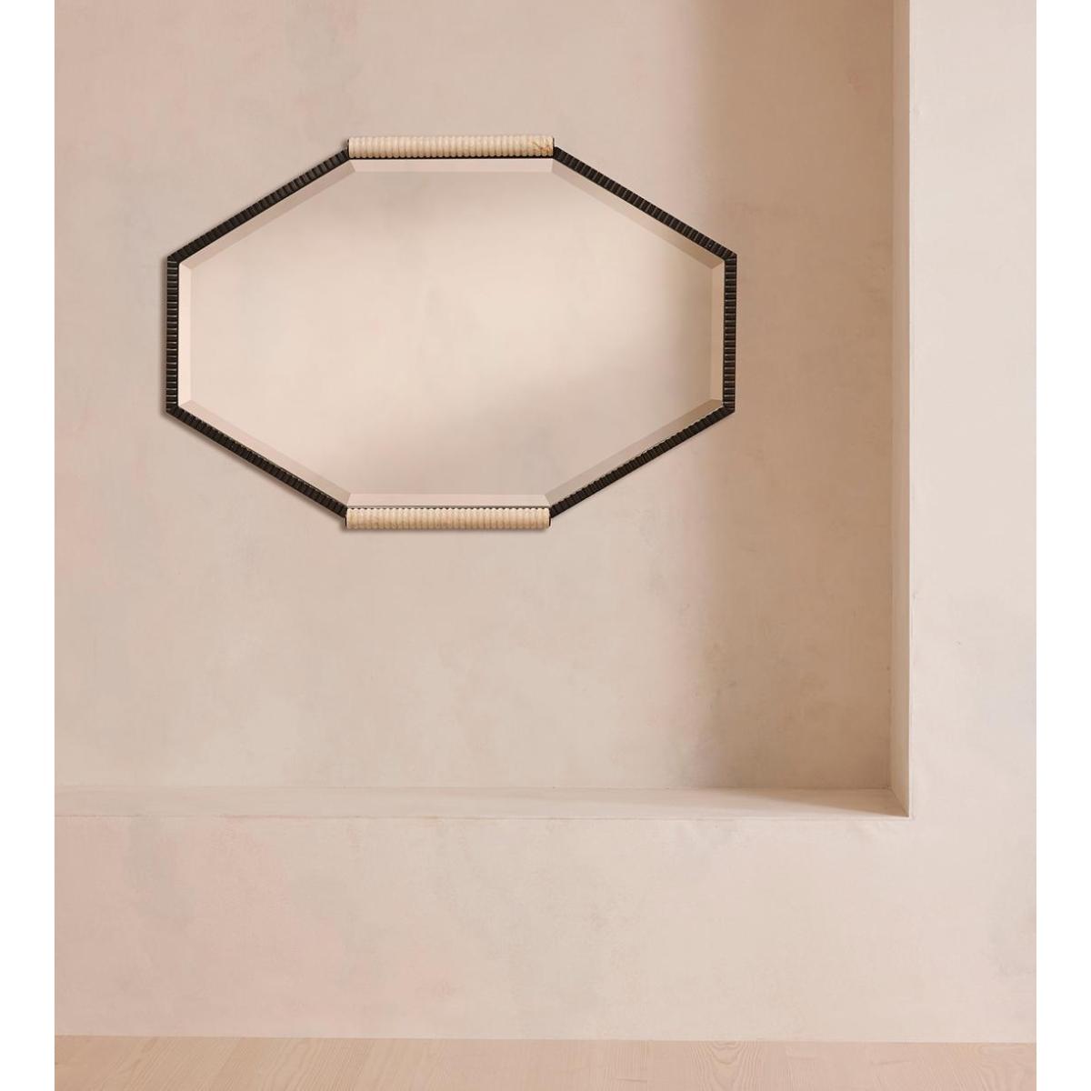 An angular frame carved from antique, blackened brass is trimmed with honed travertine sides. The Weldon mirror's octagonal frame is created from antique black brass. Drawing inspiration from the interiors of Soho House Mumbai, its sides are detailed with honed Royal Diana marble that's characterised by ribbed detailing.