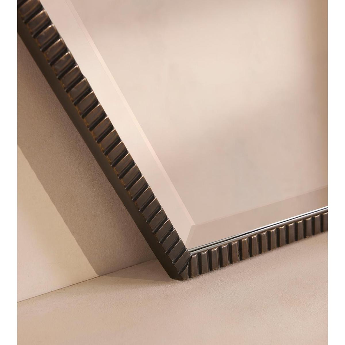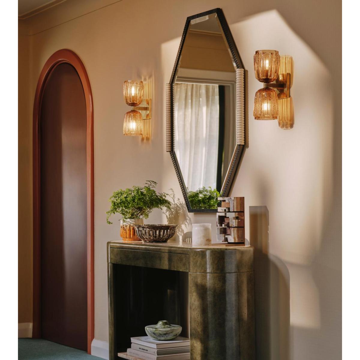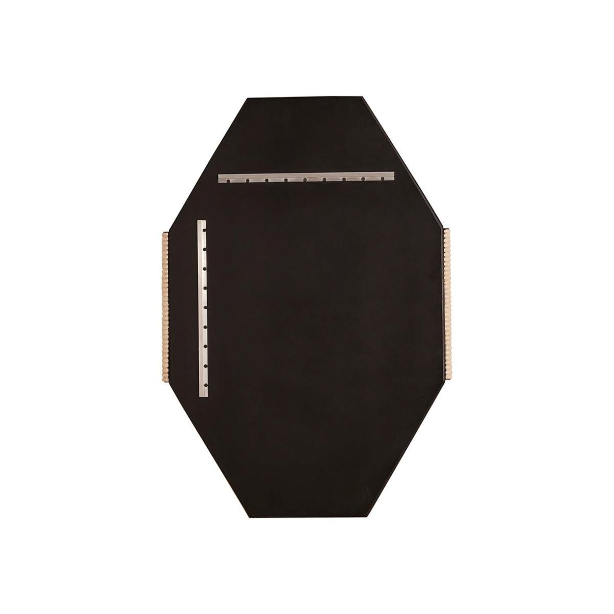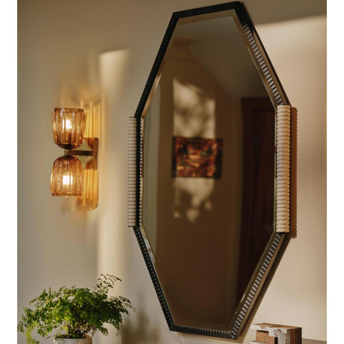 An angular frame carved from antique, blackened brass is trimmed with honed travertine sides. The Weldon mirror's octagonal frame is created from antique black brass. Drawing inspiration from the interiors of Soho House Mumbai, its sides are detailed with honed Royal Diana marble that's characterised by ribbed detailing.