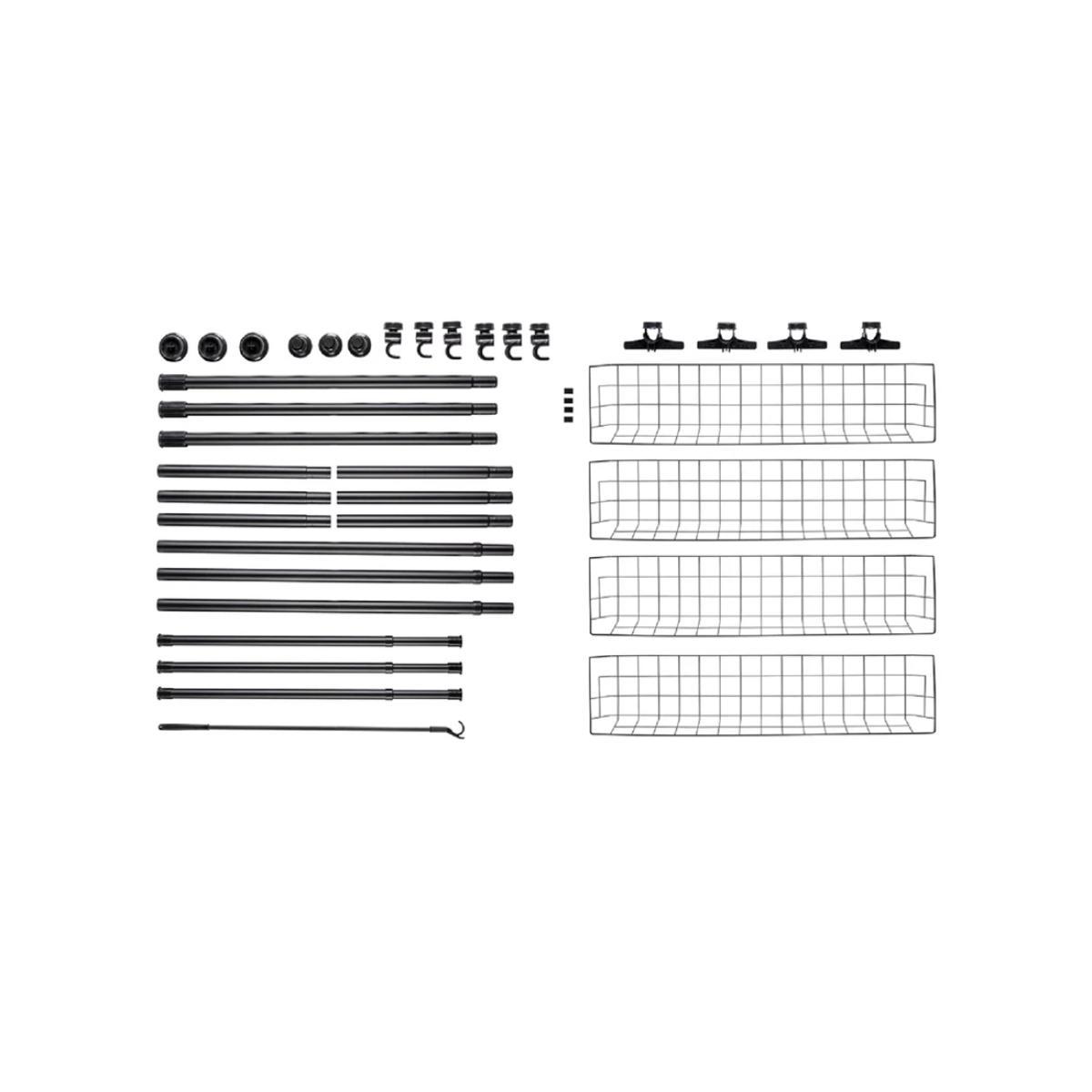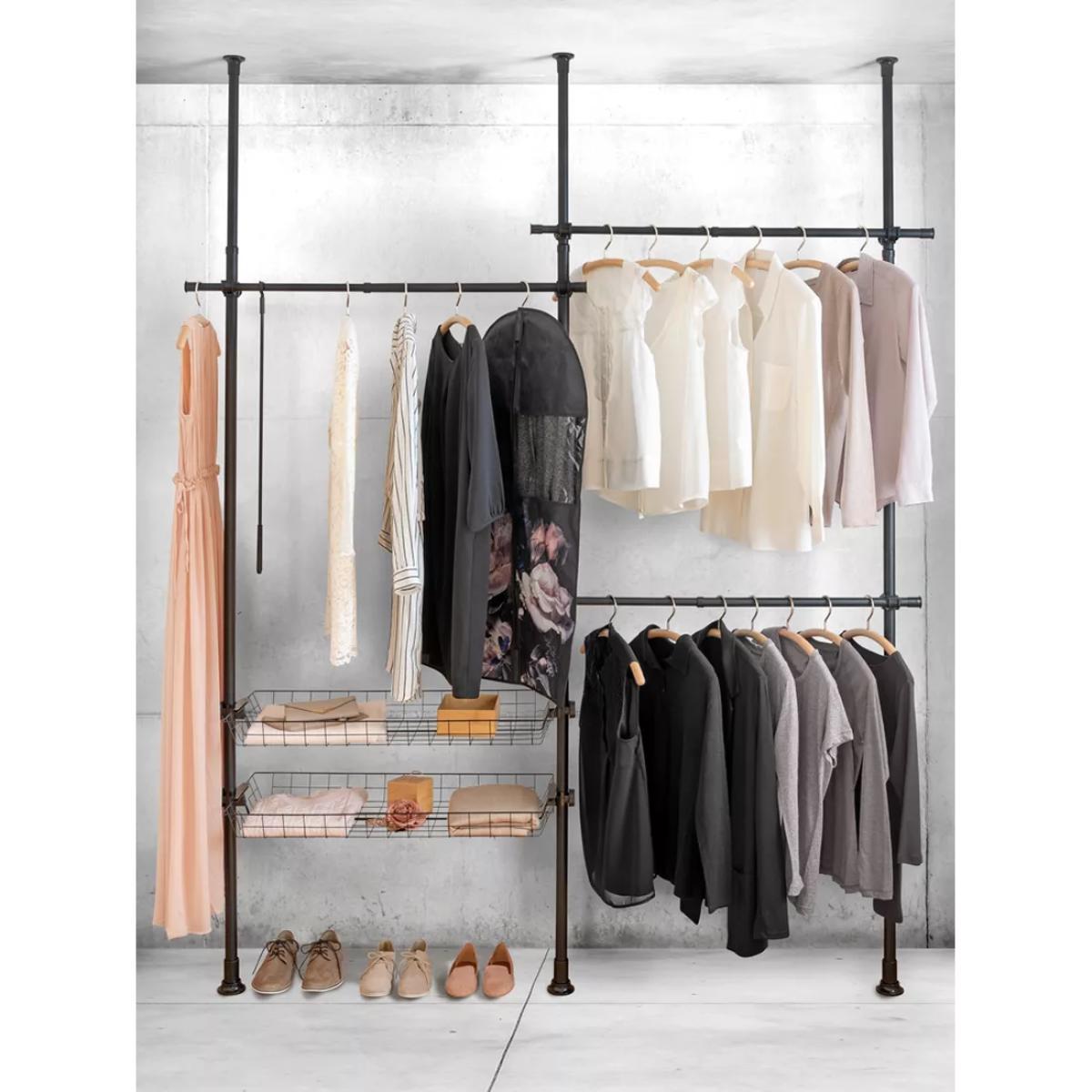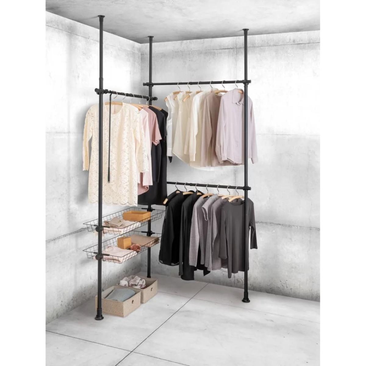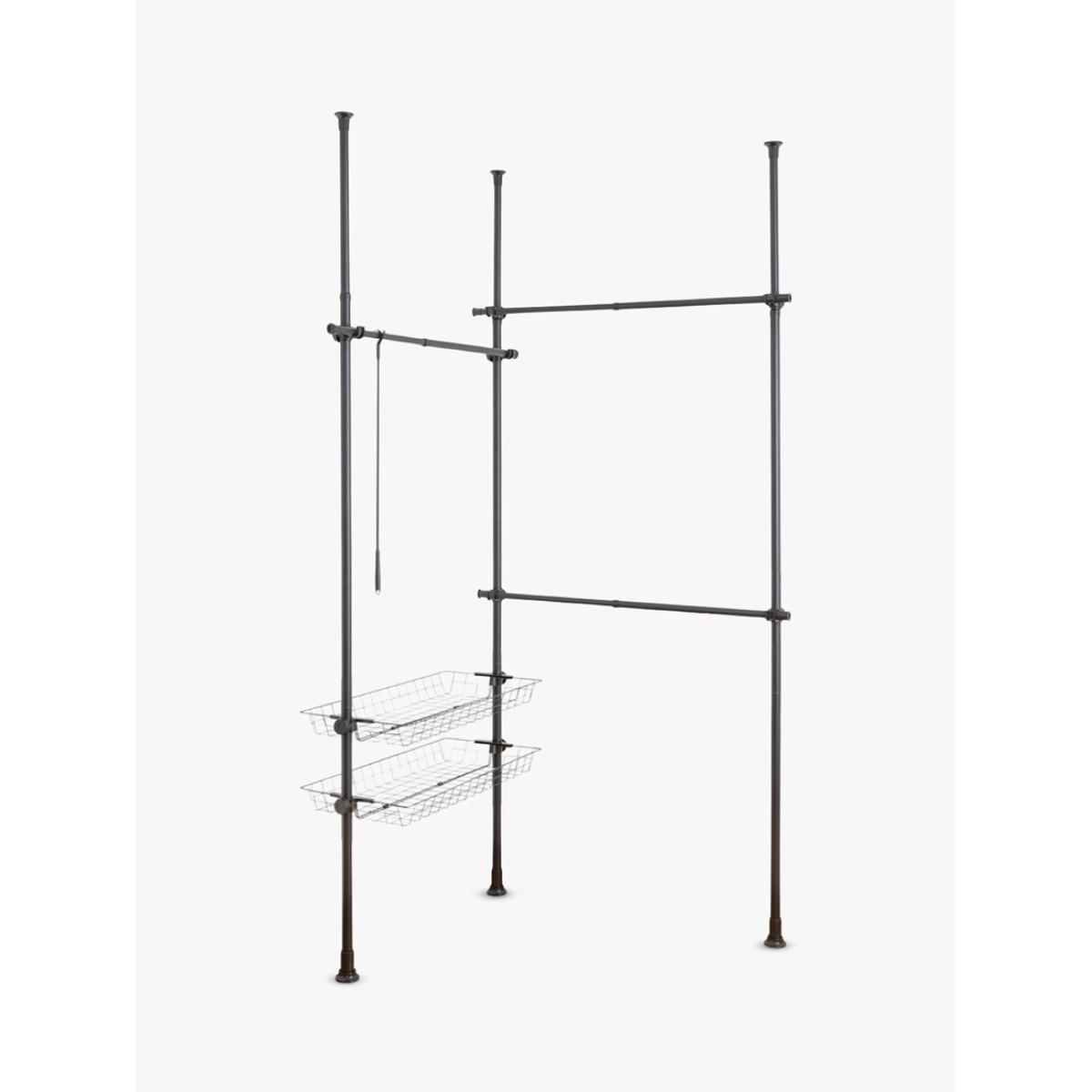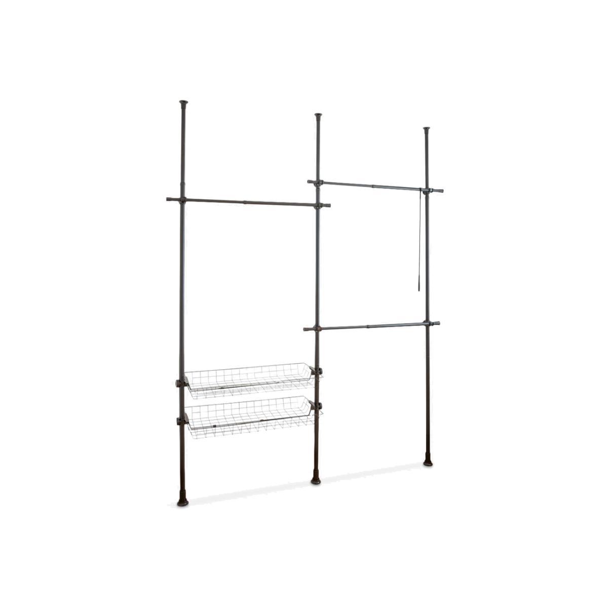Hercules can be extended in height from 165-300cm and in width from 164-215cm to offer ample space for your clothing. With its three clothes rails, clothes hooks and two storage baskets, it can also be adapted to fit just about any space. It's also extendable by adding further rails for more space. Making the dream of a walk-in wardrobe come true, Hercules provides plenty of room for all types of clothing. With individual combination options, you can create an organisation system in an open design to meet your individual requirements. The clothes rails are made of heavy, powder-coated steel and high-quality plastic connecting elements, which can be very easily assembled and disassembled without drilling or screwing, and which are simply clamped between floor and ceiling. Strong and sturdy, each crossbar has a load-bearing capacity of 20kg and the baskets 15kg each. An enclosed clothes hook enables you to quickly and easily keep clothing that hangs higher within reach. Contents: 3x carrier rails 3x clothes rails 2x storage baskets 1x clothes hook