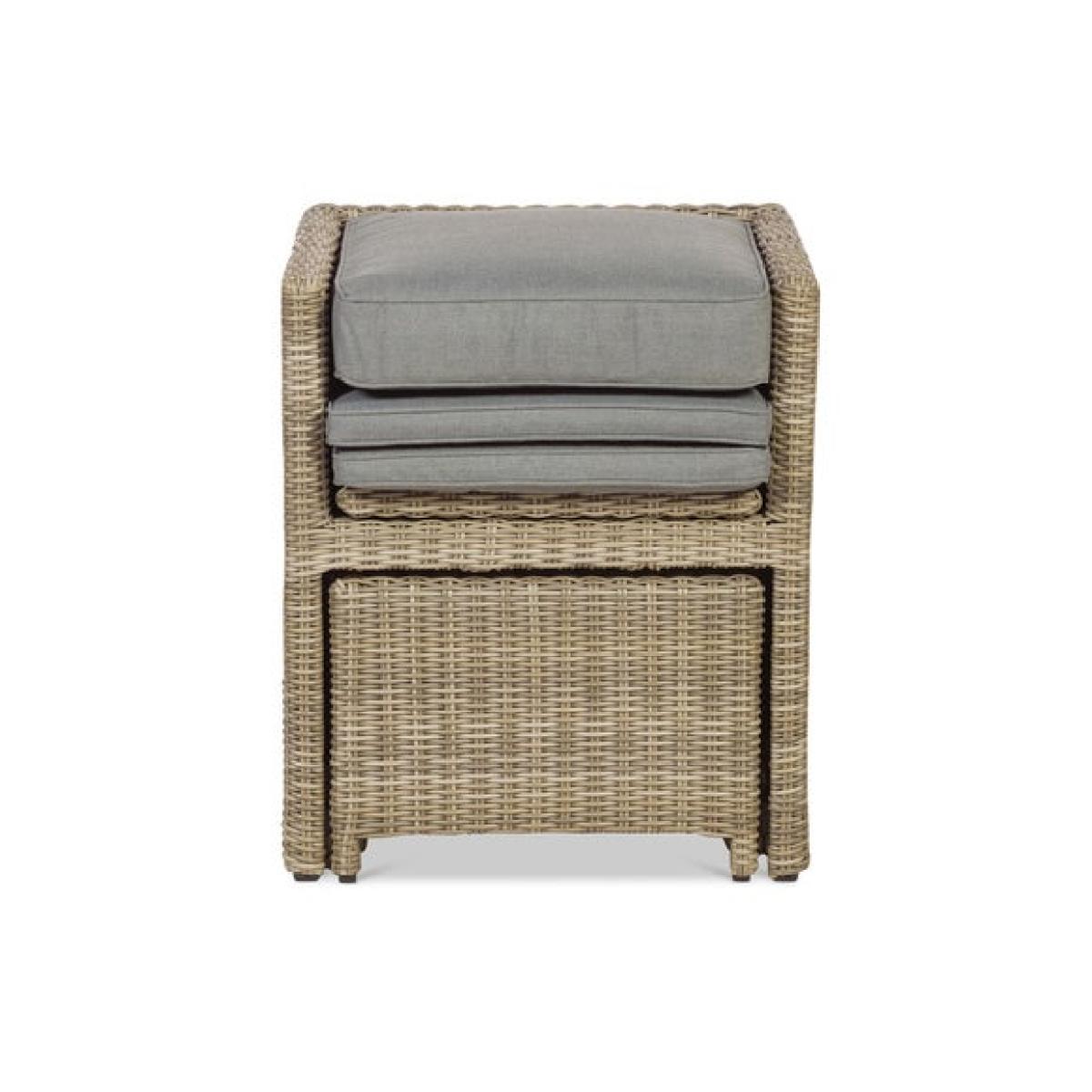 * Large outdoor set * 1 x Table, 6 x chairs, 4 x stools * Rattan weave design * Aluminium frame * Weather resistant Designed with clever space-saving in mind, this large dining set seats ten, yet tucks away compactly when not in use. Featuring a rust-resistant aluminium frame and hand-woven rattan finish, the cube chairs, stools, and generous table all nest neatly together—ideal for keeping your patio tidy between gatherings. Shower-resistant cushions and a smart, structured design offer a blend of practicality and timeless outdoor style.