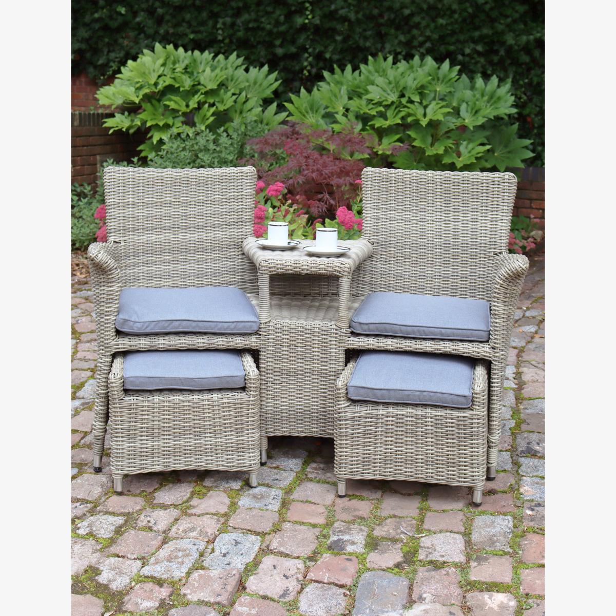 Discover the perfect retreat for serene moments outdoors with the Wentworth 2 Seater Fixed Companion Set. This elegantly designed set seamlessly blends style and functionality, making it an exquisite addition to your garden, patio, or balcony.. Classic Aesthetic:Featuring a sturdy aluminium framework complemented by a hand-woven synthetic half-round rattan weave, this set offers durability along with a timeless look that enhances any outdoor decor.. Comfortable Seating: Designed for relaxation, the set includes two fixed seats that provide ample support, making it ideal for lounging in comfort.. Pullout Footstools: Enjoy added versatility with two pullout footstools that conveniently store away under the seats, allowing you to kick back without taking up extra space when not in use.. Weather Shield Cushions: The companion set is equipped with weather shield cushions, ensuring comfort while resisting stains and water, making it perfect for outdoor use.. Ideal for Sunny Afternoons: Perfect for leisurely afternoons in the sunshine, the Wentworth 2 Seater Fixed Companion Set creates a cozy atmosphere for reading, sipping drinks, or simply unwinding outdoors.. With its beautiful combination of style, comfort, strength, and durability, the Wentworth 2 Seater Fixed Companion Set is a wonderful outdoor relaxation spot, designed for years of enjoyment.. Love Seats / Companion Sets. The gardens of our homes can be a haven for peaceful sitting, social events and enjoying the nature of British spring and summer. Where we like to enjoy a moment of self-care and relaxation, garden love seats and companion seats can become a perfect place to sit back and chill out. Traditionally made out of rattan, metal or wood, love seats generally come fully attached as two-person chairs with a table in the middle making them very a much sought-after garden furniture item.. Nowadays, you can find love seats in all sorts of modern and contemporary designs ‚ including the infamous egg chairs. Much like the bistro sets, this piece of garden furniture is a perfect accessory to any size garden patio or balcony. It is ideal for those who enjoy a cup of tea or a glass of wine outdoors. It too provides an intimate and romantic setting outdoors.. Love seats and companion seats are generally made to sit two people (hence the name), so you‚'ll want to make sure you have enough space to fit this in a place in your garden. Where you may already have a social seating area, love seats are a great option for more mellow, solitary spaces that allow you to have some peace.. The Wentworth Range. The Wentworth range is one of our most popular rattan garden furniture ranges. The range features neutral-coloured synthetic rattan which makes this range timeless and suitable for any type of garden. With plenty of lounging and dining options, you will not be disappointed in the Wentworth rattan range to style your outdoor living space.. Features:. Product Material: Synthetic Rattan. Main Colour: Beige. Cushion colour: Grey. Rust Proof Aluminium Frame. Shower and stain resistant cushions included. Compact and practical, for easy storage. Compliments any outdoor living space. The set includes:. 1 x Fixed Companion Bench, complete with: 2 x Seats and 1 x Middle Table. 2 x Pullout Footstools. 4 x Weather shield cushions. Please note: Colours may vary slightly from those shown. Variations can occur due to the natural characteristics of materials (such as wood, fabric, or rattan), as well as differences in screen resolution and lighting when viewing images.