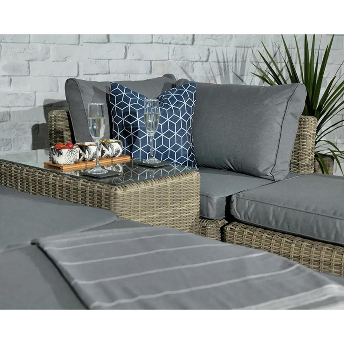 The Wentworth 4 Seater Multi Setting Relaxer Set is perfect for lounging and relaxing in your gardens in the summertime. Suitable for outdoor and indoor use. It is made using a two-tone natural coloured half-round wicker and hand woven onto aluminium frames. The set consists of a glass top table, 2 corner chairs and 2 stools which offer flexible seating and lounging options. This set features weather shield seat and back cushions which are stain resistant and water resistant.