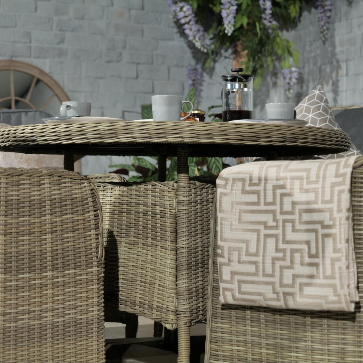 The Wentworth 4 seater Imperial dining set is the perfect addition to your outdoor space with its timeless design. Retaining classic style with its aluminium framework and hand woven, synthetic, half round rattan weave, it offers style, comfort, strength and durability. Complete with a round tempered glass top table and four imperial chairs including weather shield seat and back cushions, it is perfect for a relaxing, comfortable dining experience.