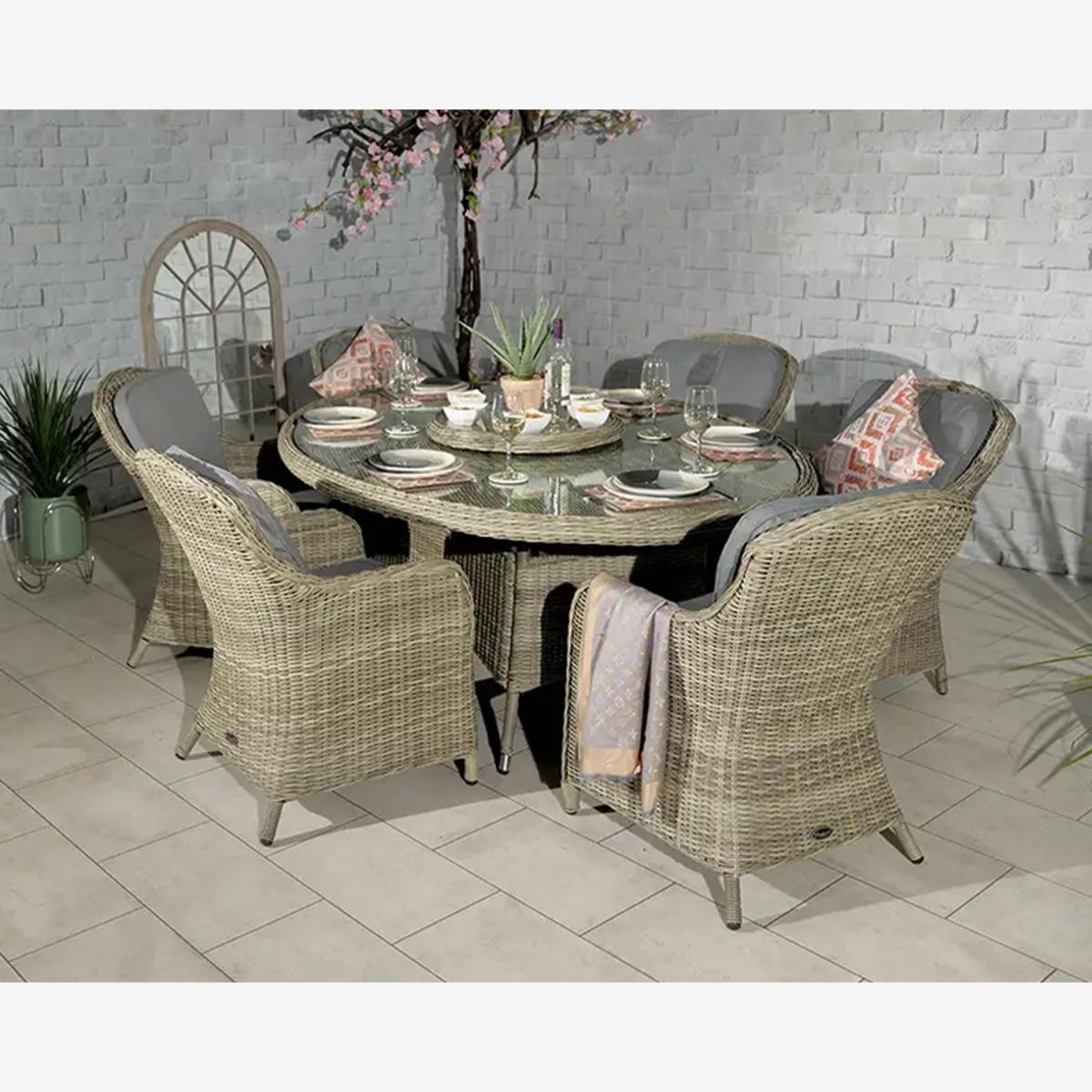 The Wentworth 6 Seater Ellipse Imperial Dining Set is the perfect spacious addition to your outdoor living area with its timeless design. Retaining classic style with its aluminium framework construction and hand-woven, synthetic, half-round rattan weave, this set offers style, comfort, strength and durability. Complete with a tempered glass top table and six imperial chairs including weather shield seat and back cushions, the Wentworth 6 Seater Ellipse Imperial Dining Set is ideal for spacious dining for all the family. The Wentworth range is one of our most popular rattan garden furniture ranges. The range features neutral-coloured synthetic rattan which makes this range timeless and suitable for any type of garden. With plenty of lounging and dining options, you will not be disappointed in the Wentworth rattan range to style your outdoor living space.