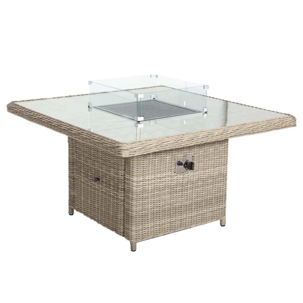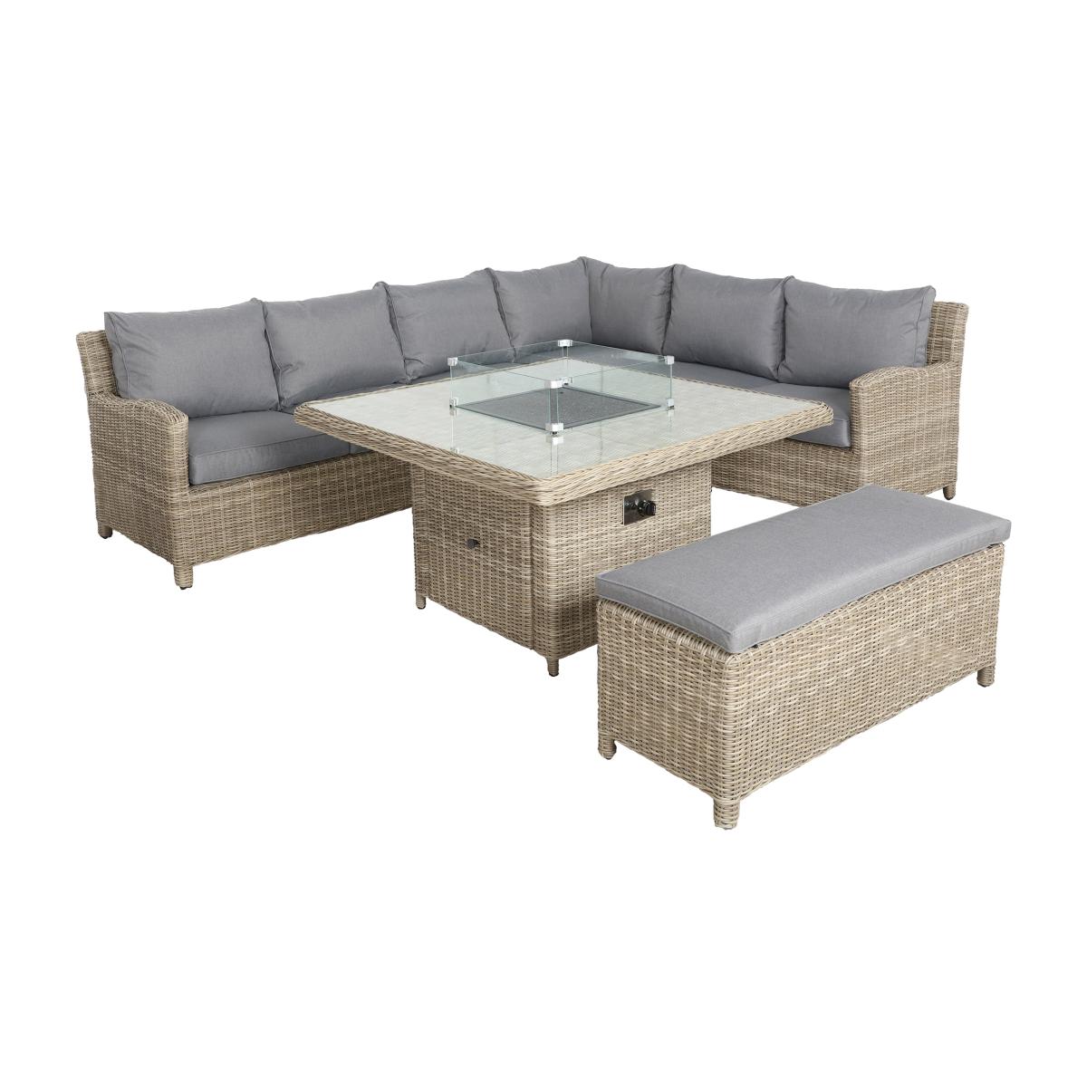 Add a contemporary dining seated area to your garden with this beautiful beige Wentworth corner lounge set. Crafted with a rust proof aluminium frame, this set has a practical and space saving design. This set comes with a square fire pit which has an adjustable flame. We recommend using a 5kg gas bottle when using the fire pit table. Cushions are included.