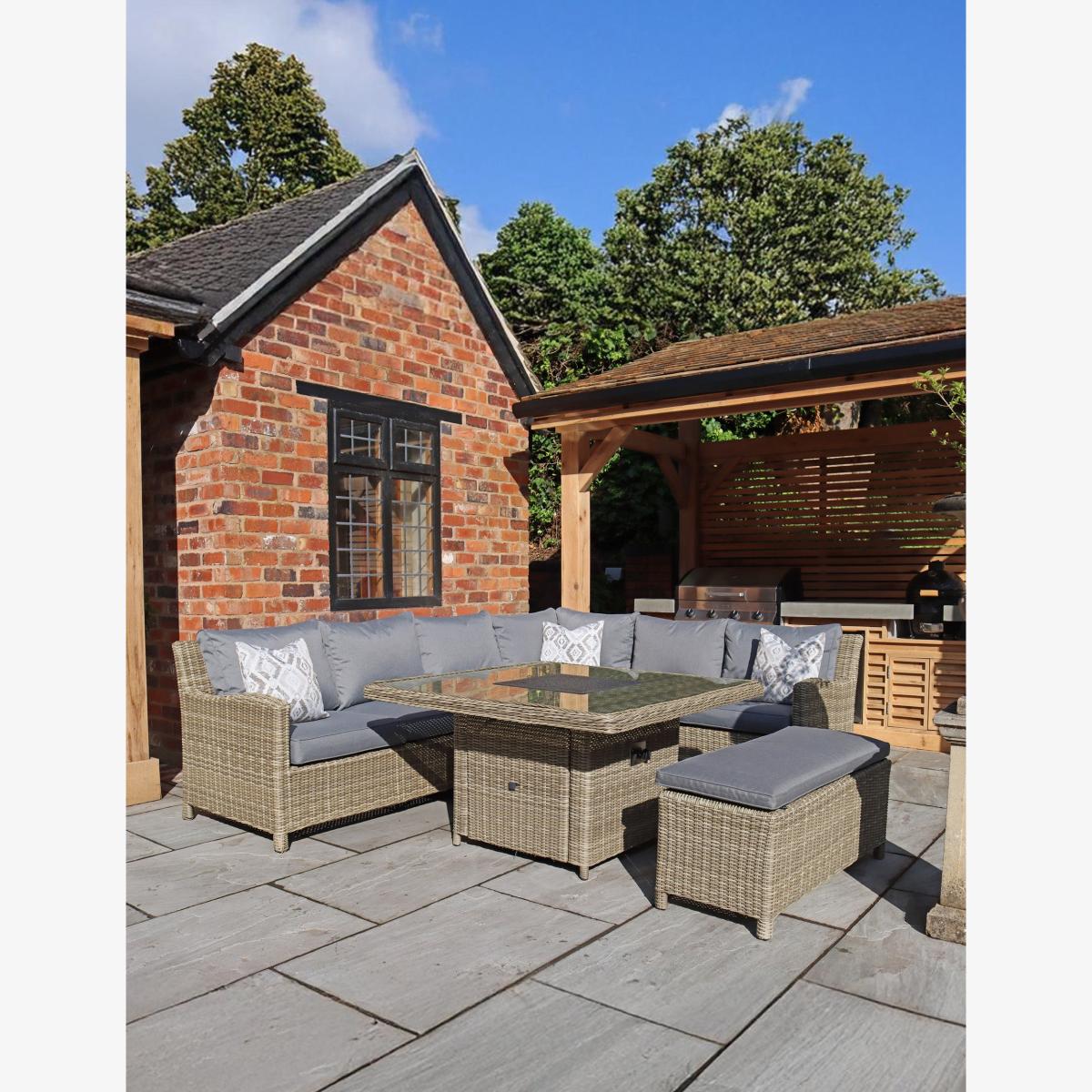 Create a cozy outdoor atmosphere and relax in style with this stunning modular set, perfect for summer evenings and chilly UK nights. Featuring a square fire pit glass top table, you can enjoy the warmth and ambiance of a fire while dining or lounging, ensuring year-round outdoor enjoyment.. Versatile Fire Pit Table:The table includes an easy-to-use dial on the side panel for simple operation, with a cleverly hidden gas tank (not included) easily accessible from the base.. Safety Features: A 15cm glass surround adds safety while enjoying the flames, and firestones are included for charm and functionality.. Protective Cover: A spray stone glass cover plate is included for when the table is not in use. Just make sure the internal gas burner has cooled down before covering for safety.. Recommended Gas Bottle: For optimal performance, a 5kg gas bottle is suggested.. Seating Arrangement: This set includes:. A square fire pit table for dining and warmth.. Two 2-seater sofas for comfortable seating.. A corner chair and a middle chair for a cohesive look.. A 2-seater bench to accommodate extra guests.. Durability and Style: Crafted with a robust aluminium framework and hand-woven synthetic half-round rattan weave, this set beautifully combines style, comfort, strength, and durability. Weather shield cushions ensure comfort while standing up to outdoor conditions.. The Wentworth Fire Pit 7pc Deluxe Modular Corner Dining & Lounging Set is the ultimate choice for enjoying your outdoor space throughout the seasons, perfect for relaxed afternoons in the sun or lively evening gatherings!. Fire Pit Dining & Lounging Sets. A fire pit dining and lounging set creates a social space instantly, making a perfect spot to gather around the fire, chat, and hang out rather than retreat indoors when the sun starts setting. Twinkling lights, the night air, and flames dancing in the dark create a special ambience for parties or chilled evenings that involve curling up with a good book, putting a soothing playlist on and enjoying a crisp glass of wine or dining alfresco. The best factor about purchasing a fire pit set is that you can enjoy it all year round even in the autumn/winter months. Fire pit sets definitely make a statement within the garden.. The Wentworth Range. The Wentworth range is one of our most popular rattan garden furniture ranges. The range features neutral-coloured synthetic rattan which makes this range timeless and suitable for any type of garden. With plenty of lounging and dining options, you will not be disappointed in the Wentworth rattan range to style your outdoor living space.. Features:. Product Material: Synthetic Rattan. Main Colour: Beige. Cushion colour: Grey. Rust Proof Aluminium Frame. 120cm x 120cm Fire pit table with adjustable flame. Shower and stain resistant cushions included. Practical and space-saving design. Compliments any outdoor patio or decking space. The set includes:. 1 x 120cm Square Fire Pit Table (with spray stone cover). 1 x Left Hand Sofa Bench. 1 x Right Hand Sofa Bench. 1 x Standard Corner Seat. 1 x Middle Chair. 1 x Bench. Please note: Colours may vary slightly from those shown. Variations can occur due to the natural characteristics of materials (such as wood, fabric, or rattan), as well as differences in screen resolution and lighting when viewing images.