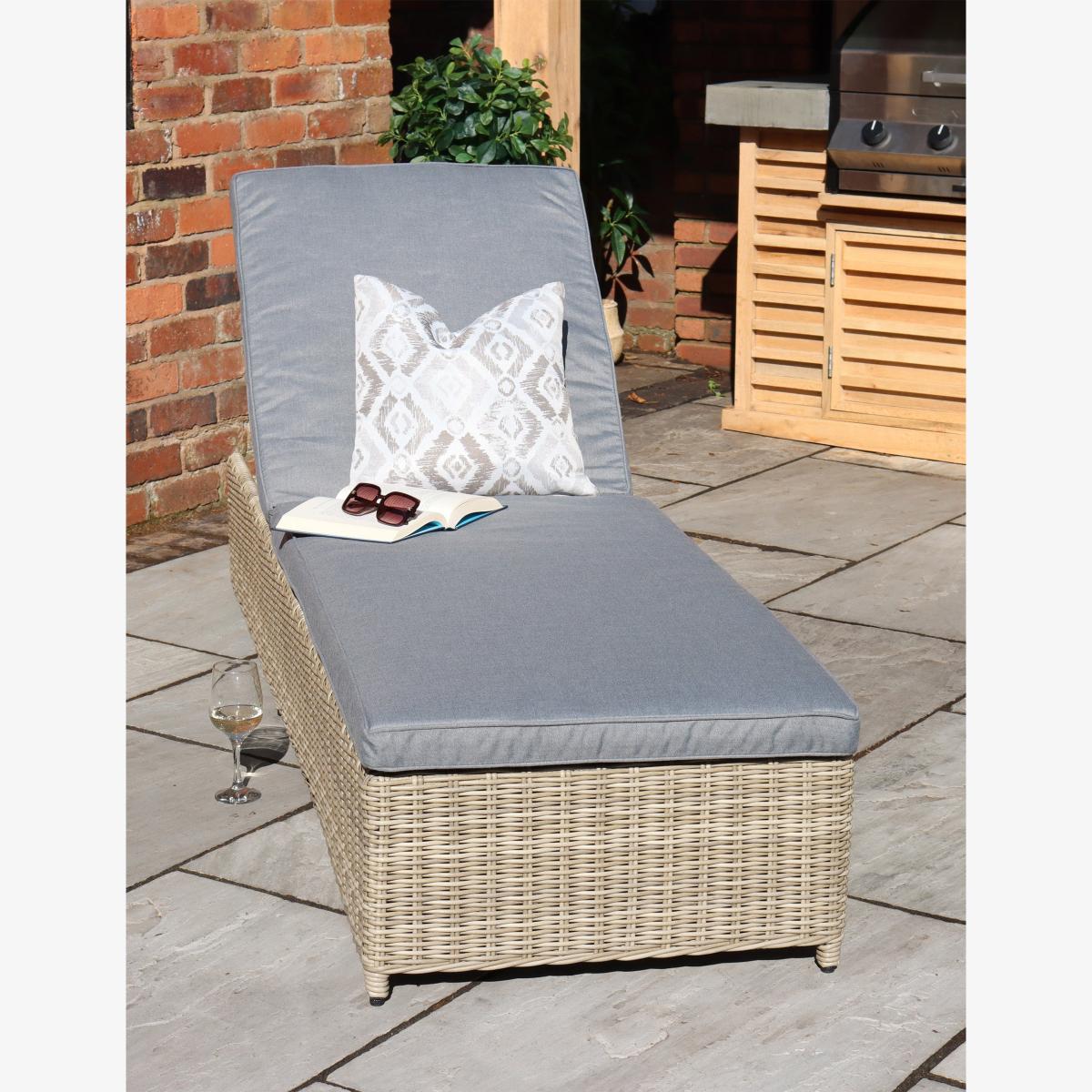 Discover the ultimate companion for relaxation with the Royalcraft Wentworth Sun Lounger, thoughtfully designed to enhance your garden or patio experience. Perfect for soaking up the sun or unwinding with a good book, this sun lounger seamlessly combines comfort and style.. Adjustable Backrest: Featuring an easily adjustable multi-point backrest, you can find your perfect reclining angle with minimal effort, ensuring personalized comfort.. Durable Construction: Built on a rust-resistant aluminium framework, this lounger is complemented by a hand-woven synthetic half-round rattan weave, providing both style and durability for outdoor environments.. Comfortable Cushioning: It includes a full-length weather shield fabric cushion that offers a plush and supportive seating experience. Stain-resistant and water-resistant, this cushion is easy to maintain and ideal for outdoor use.. Stylish Design: With its sleek design and elegant materials, the Wentworth Sun Lounger enhances the aesthetic of any outdoor space, making it a stunning addition to your garden, pool area, or balcony.. Versatile Use: Whether lounging in the sun, enjoying a leisurely afternoon, or taking a moment to relax, this sun lounger is designed for versatile comfort.. The Royalcraft Wentworth Sun Lounger combines style, comfort, strength, and durability, making it an excellent addition to any outdoor area and your personal oasis of relaxation.. Sun Loungers & Steamer Chairs. Garden sun loungers and steamer chairs are the perfect garden furniture purchase as the weather warms up and inspires us to make the most of our outside spaces. Once you've enjoyed a relaxing soak in your inflatable hot tub and read a good book while swaying on your hanging egg chair, soaking up the sunshine from a sun lounger in your garden sounds like a great way to enjoy the best of the summer weather.. A garden sun lounger or steamer chair is a must-have piece of outdoor garden furniture that anyone can enjoy. It's where you can while away hours reading as you soak up the vitamin D and socialise with loved ones during sunny weekends. If the pandemic had you appreciating your garden even more, a relaxing garden lounger could be the perfect garden furniture investment for making the most of your outdoor space.. For anyone who enjoys relaxing outdoors the sun lounger and steamer chair is the perfect way to do just that. Easy to move, either garden furniture pieces are ideal for any balcony, patio or garden.. Wentworth Range. The Wentworth range is one of our most popular rattan garden furniture ranges. The range features neutral coloured synthetic rattan which makes this range timeless and suitable for any type of garden. With plenty of lounging and dining options, you will not be disappointed in the Wentworth rattan range to style your outdoor living space.. Features:. Product Material: Synthetic Rattan. Main Colour: Beige. Cushion colour: Grey. Rust Proof Aluminium Frame. Multi Point back rest. Shower and stain resistant cushion included. The set includes:. 1 x Sun Lounger. 1 x Weather Shield cushion. Please note: Colours may vary slightly from those shown. Variations can occur due to the natural characteristics of materials (such as wood, fabric, or rattan), as well as differences in screen resolution and lighting when viewing images.