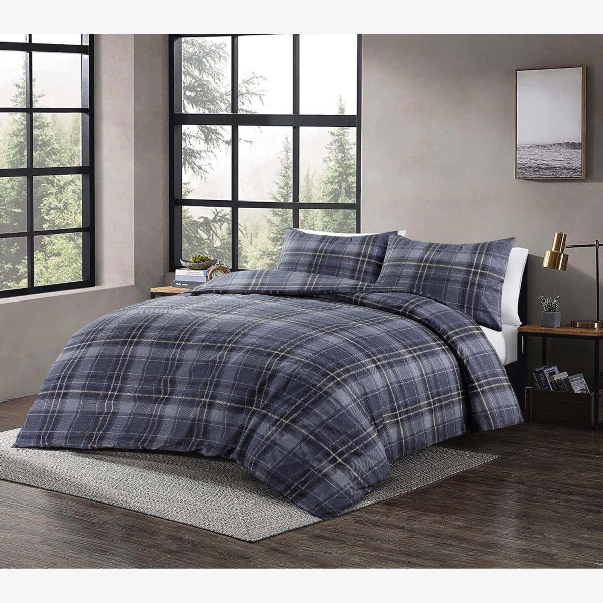 Add a touch of warmth to your bedroom with this timeless classic design. Features a checked design in black and white on a subtle indigo blue background. Printed on soft polycotton fabric for a comfortable and cosy night of sleep.