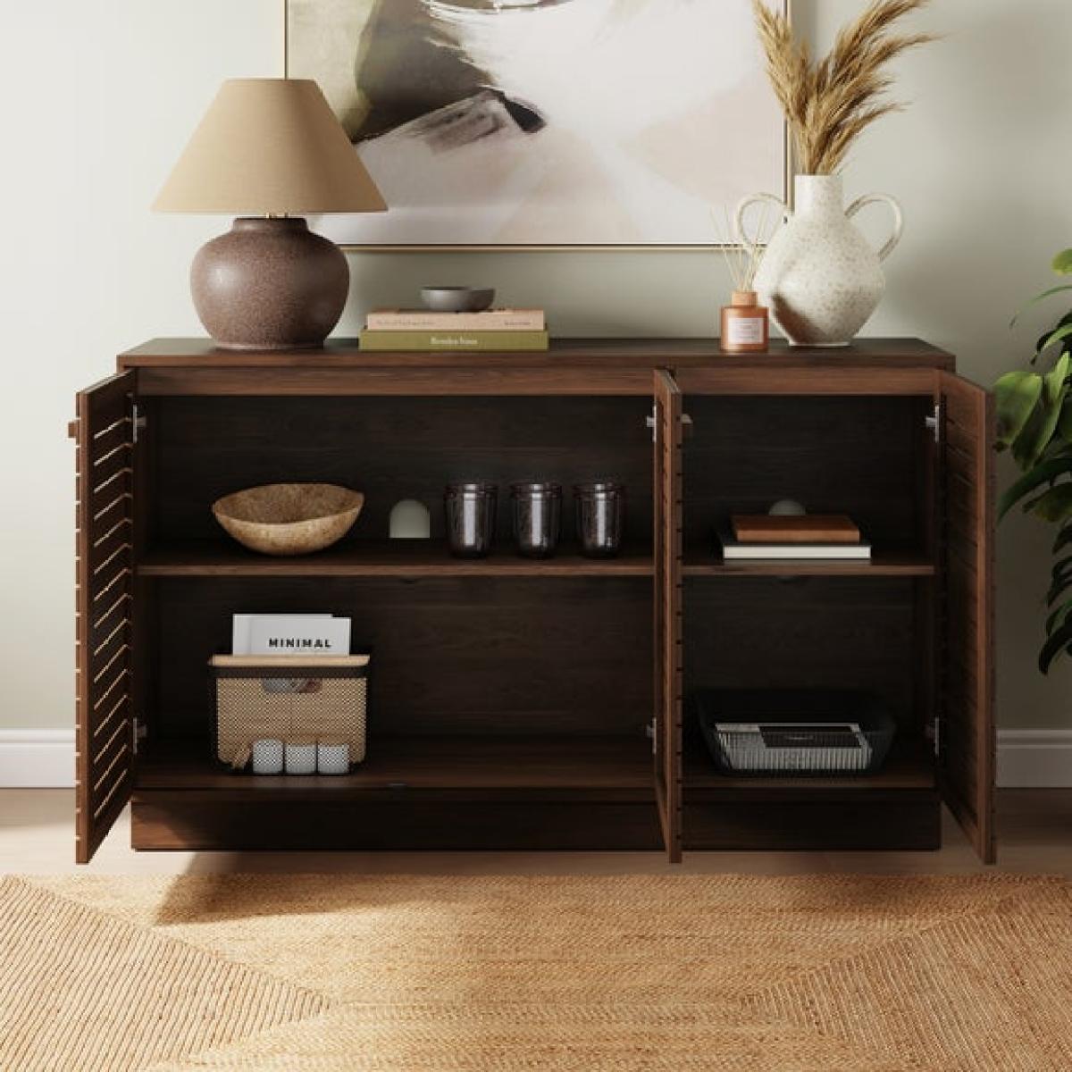 * Modern sideboard * Slatted front * Adjustable shelves * Cable management With its clean slatted design and generous proportions, the wide Wesley sideboard blends style and function. Adjustable shelving and cable management make it versatile enough for dining rooms, living spaces or home offices, in your choice of light oak effect or walnut effect finish.