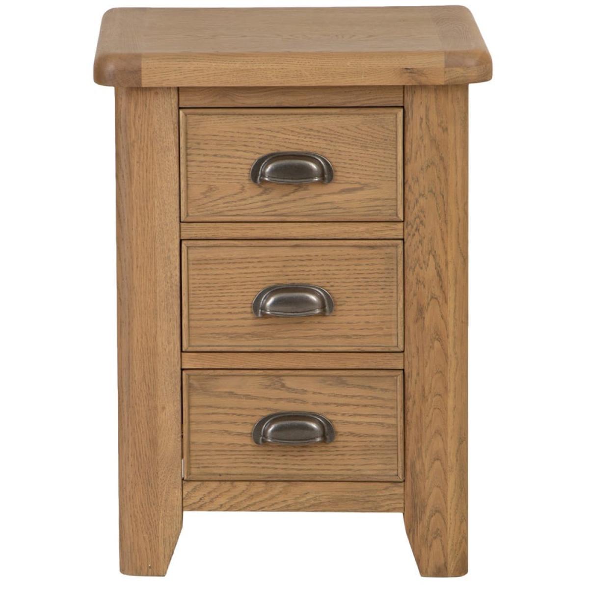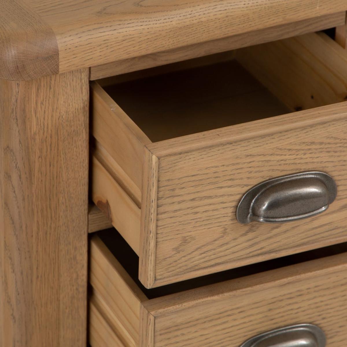 Create an atmosphere when evening falls by placing a couple of scented candles on our Wessex smoked oak large bedside table. With a natural grain wood that has been smoked for a unique effect, this bedside table will suit a room with similarly light wood furniture. It has a solid frame that will last for many years – and sweet dreams – to come. The three 35cm drawers offer enough space for puzzle books, chargers and diaries; the bottom one has a hidden compartment for valuables you want to keep safe. It has a 40cm x 48cm surface where your lamp can live – and there’s space for a snuffer too.