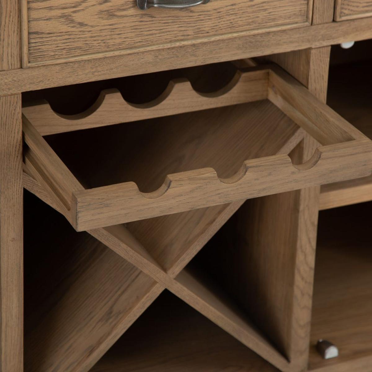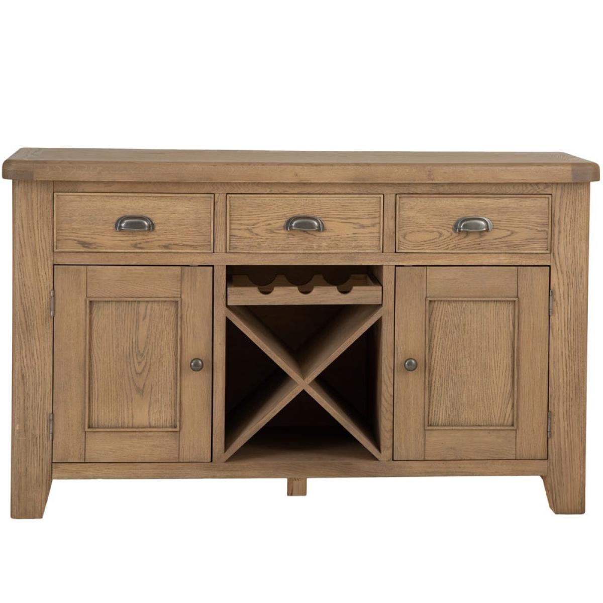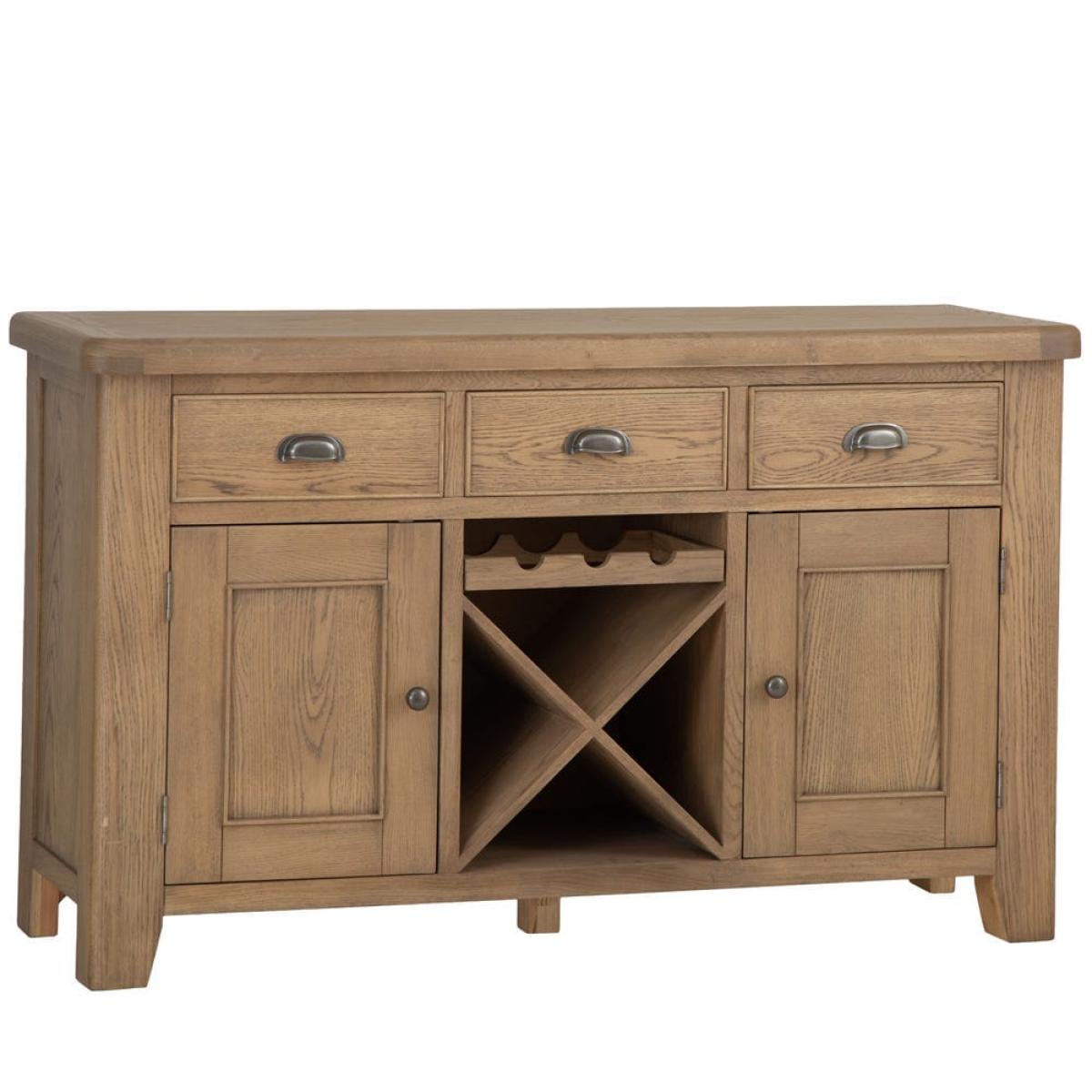Store your reds, whites and rosés in style with our Wessex smoked oak large sideboard wine rack. This two-in-one wine repository and sideboard combines easy-going down-time with practical storage facilities. Before your guests arrive, stow away any overlooked toys and games in one of the 44cm x 37cm drawers. And when they get here, grab a bottle from the cross wine rack, which fits 12 standard bottles and a further three in a space above it – more than enough for a couple of dinner parties. The two cupboards on either side will house your flutes, tumblers and stemless glasses and bring some traditional style to your room with their smoked oak finish.